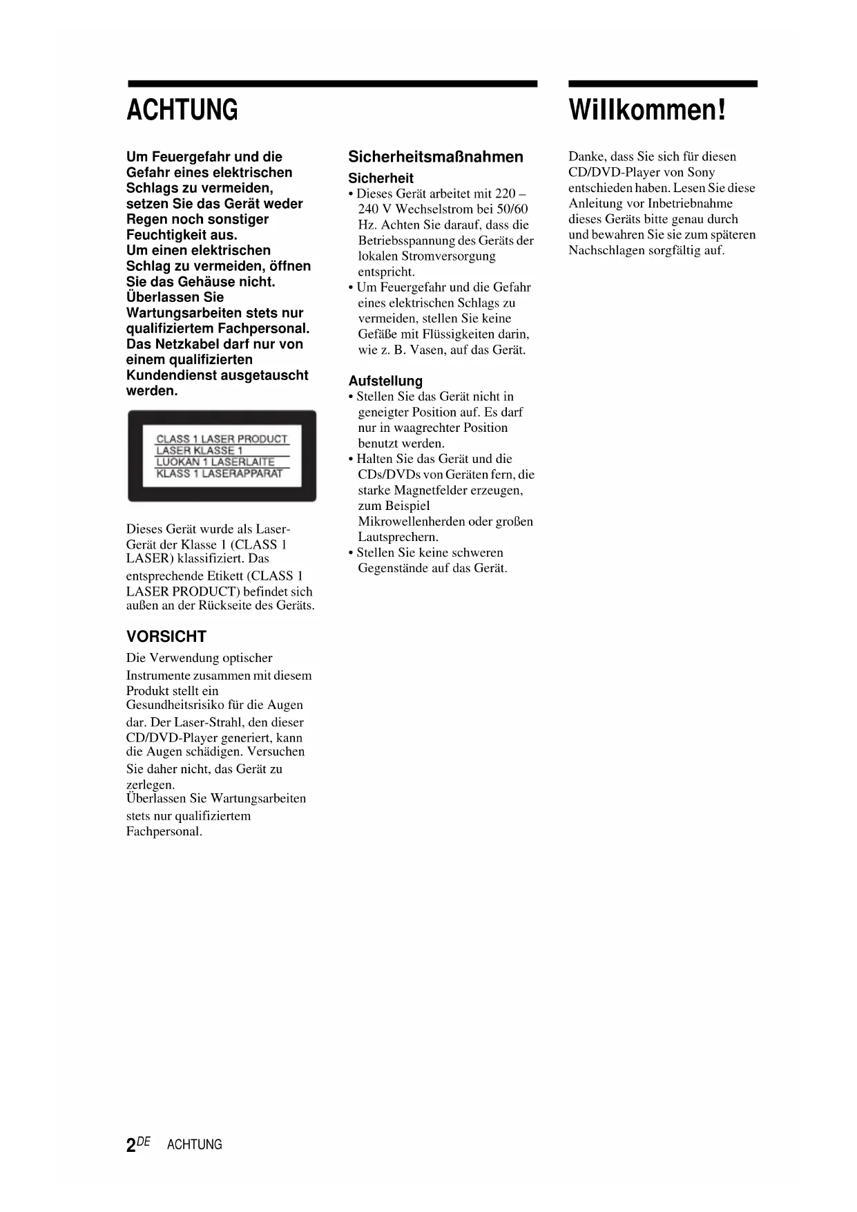 - Stellen Sie keine schweren Gegenstände auf das Gerät. Willkommen! Danke, dass Sie sich für diesen CD/DVD-Player von Sony entschieden haben. Lesen Sie diese Anleitung vor Inbetriebnahme dieses Geräts bitte genau durch und bewahren Sie sie zum späteren Nachschlagen sorgfältig auf.3