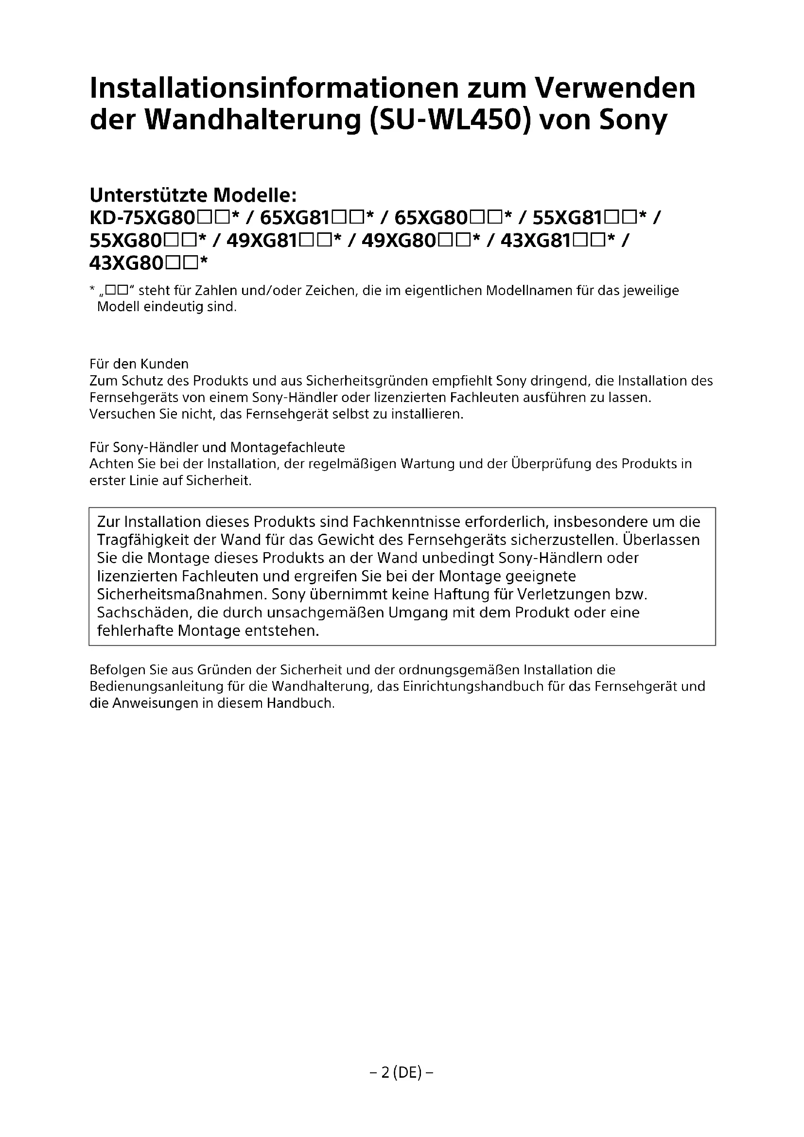 Zur Montage这点es Products sind ausreichende Fachkennnisse erforderlich. Lesen Sie sich diese Anleitung unbedingt sorgfältig durch, um die Montagearbeiten sich durchzufahren. Sony übernimmt keine Haftung fur Schaden oder Verletzungen durch die fehlherfte Handhabung oder eine unsachgemäß Montage. Handigen Sie diese Anleitung nach der Montage dem Kunden aus.
