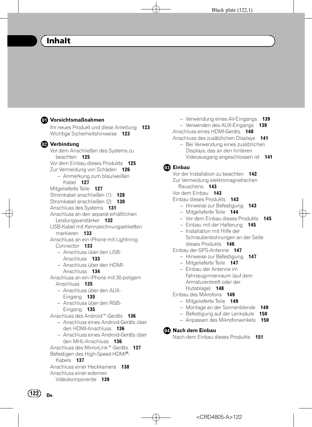 Black plate (122,1) Inhalt Vorsichtsmaßnahmen Ihr neues Produkt und diese Anleitung 123 Wichtige Sicherheitshinweise 123 Verbindung Vor dem Anschließen des Systems zu beachten 125 Vor dem Einbau dieses Produkts 125 Zur Vermeidung von Schäden 126 – Anmerkung zum blau/weißen Kabel 127 Mitgelieferte Teile 127 Stromkabel anschließen (1) 128 Stromkabel anschließen (2) 130 Anschluss des Systems 131 Anschluss an den separat erhältlichen Leistungsverstärker 132 USB-Kabel mit Kennzeichnungsetiketten markieren 133 Anschluss an ein iPhone mit Lightning Connector 133 – Anschluss über den USBAnschluss 133 – Anschluss über den HDMIAnschluss 134 Anschluss an ein iPhone mit 30-poligem Anschluss 135 – Anschluss über den AUXEingang 135 – Anschluss über den RGBEingang 135 Anschluss des Android™-Geräts 136 – Anschluss eines Android-Geräts über den HDMI-Anschluss 136 – Anschluss eines Android-Geräts über den MHL-Anschluss 136 Anschluss des MirrorLink™-Geräts 137 Befestigen des High-Speed-HDMI®Kabels 137 Anschluss einer Heckkamera 138 Anschluss einer externen Videokomponente 139