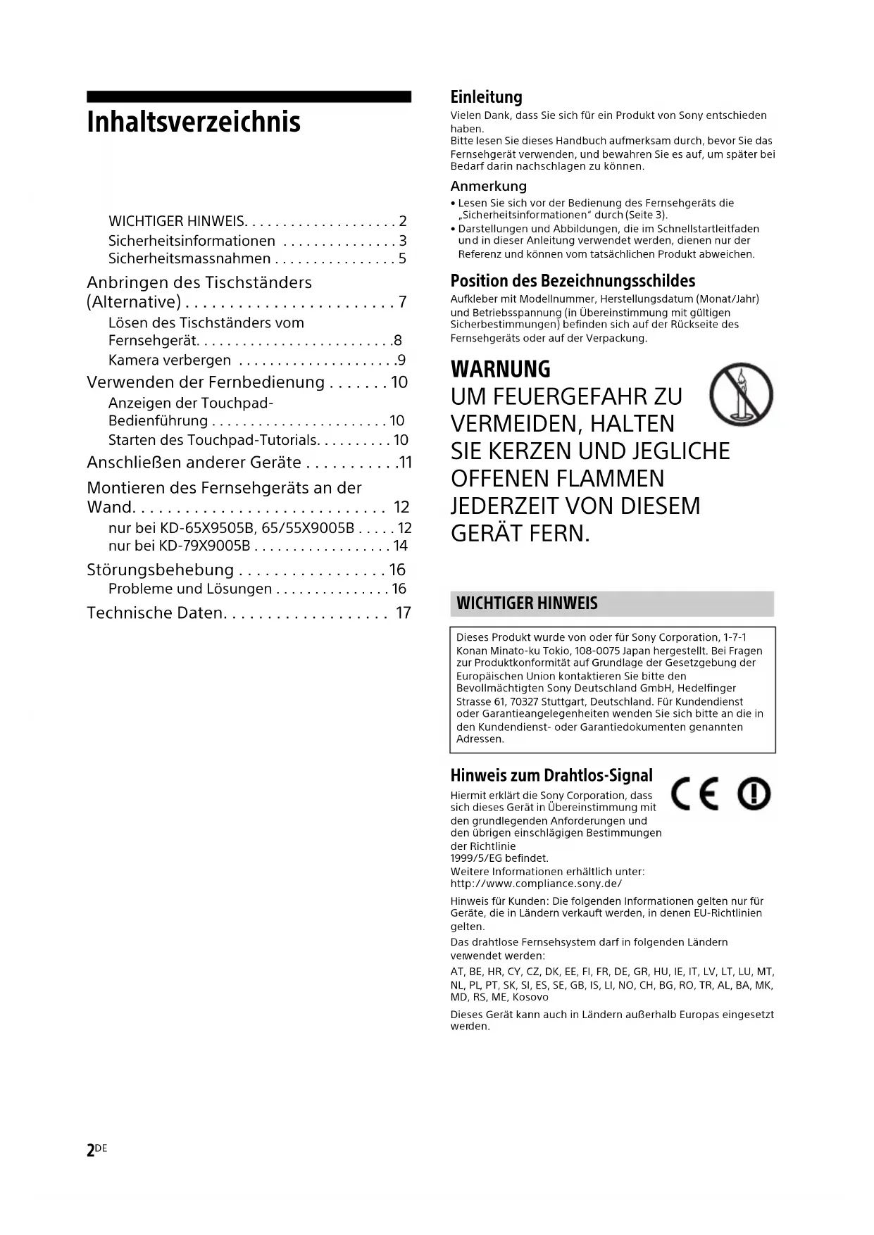 GERÄT FERN. Hinweis zum Drahtlos-Signal Hiermit erklärt die Sony Corporation, dass sich dieses Gerät in Übereinstimmung mit den grundlegenden Anforderungen und den übrigen einschlägigen Bestimmungen der Richtlinie 1999/5/EG befindet. Weitere Informationen erhältlich unter: http://www.compliance.sony.de/Hinweis für Kunden: Die folgenden Informationen gelten nur für räte, die in Ländern verkauft werden, in denen EU-Richtlinien gelten.Das drahtlose Fernsehsystem darf in folgenden Ländern ver wendet werden:AT, BE, HR, CY, CZ, DK, EE, FI, FR, DE, GR, HU, IE, IT, LV, LT, LU, MT, NL, PL, PT, SK, SI, ES, SE, GB, IS, LI, NO, CH, BG, RO, TR, AL, BA, MK, MD, RS, ME, KosovoDieses Gerät kann auch in Ländern außerhalb Europas eingesetzt wer den. WICHTIGER HINWEIS Dieses Produkt wurde von oder für Sony Corporation, 1-7-1 Konan Minato-ku Tokio, 108-0075 Japan hergestellt. Bei Fragen zur Produktkonformität auf Grundlage der Gesetzgebung der Europäischen Union kontaktieren Sie bitte den Bevollmächtigten Sony Deutschland GmbH, Hedelfinger Strasse 61, 70327 Stuttgart, Deutschland. Für Kundendienst oder Garantieangelegenheiten wenden Sie sich bitte an die in den Kundendienst- oder Garantiedokumenten genannten Adressen.DE
