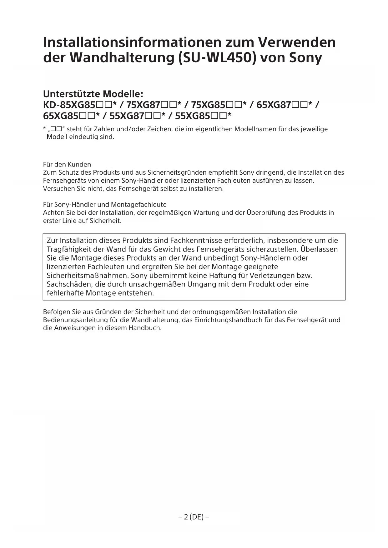 - „“ steht für Zahlen und/oder Zeichen, die im eigentlichen Modellnamen für das jeweilige Modell eindeutig sind. Für den Kunden Zum Schutz des Produkts und aus Sicherheitsgründen empfiehlt Sony dringend, die Installation des Fernsehgeräts von einem Sony-Händler oder lizenzierten Fachleuten ausführen zu lassen. Versuchen Sie nicht, das Fernsehgerät selbst zu installieren. Für Sony-Händler und Montagefachleute Achten Sie bei der Installation, der regelmäßigen Wartung und der Überprüfung des Produkts in erster Linie auf Sicherheit. Zur Installation dieses Produkts sind Fachkenntnisse erforderlich, insbesondere um die Tragfähigkeit der Wand für das Gewicht des Fernsehgeräts sicherzustellen. Überlassen Sie die Montage dieses Produkts an der Wand unbedingt Sony-Händlern oder lizenzierten Fachleuten und ergreifen Sie bei der Montage geeignete Sicherheitsmaßnahmen. Sony übernimmt keine Haftung für Verletzungen bzw. Sachschäden, die durch unsachgemäßen Umgang mit dem Produkt oder eine fehlerhafte Montage entstehen. Befolgen Sie aus Gründen der Sicherheit und der ordnungsgemäßen Installation die Bedienungsanleitung für die Wandhalterung, das Einrichtungshandbuch für das Fernsehgerät und die Anweisungen in diesem Handbuch.− 3 (DE) −