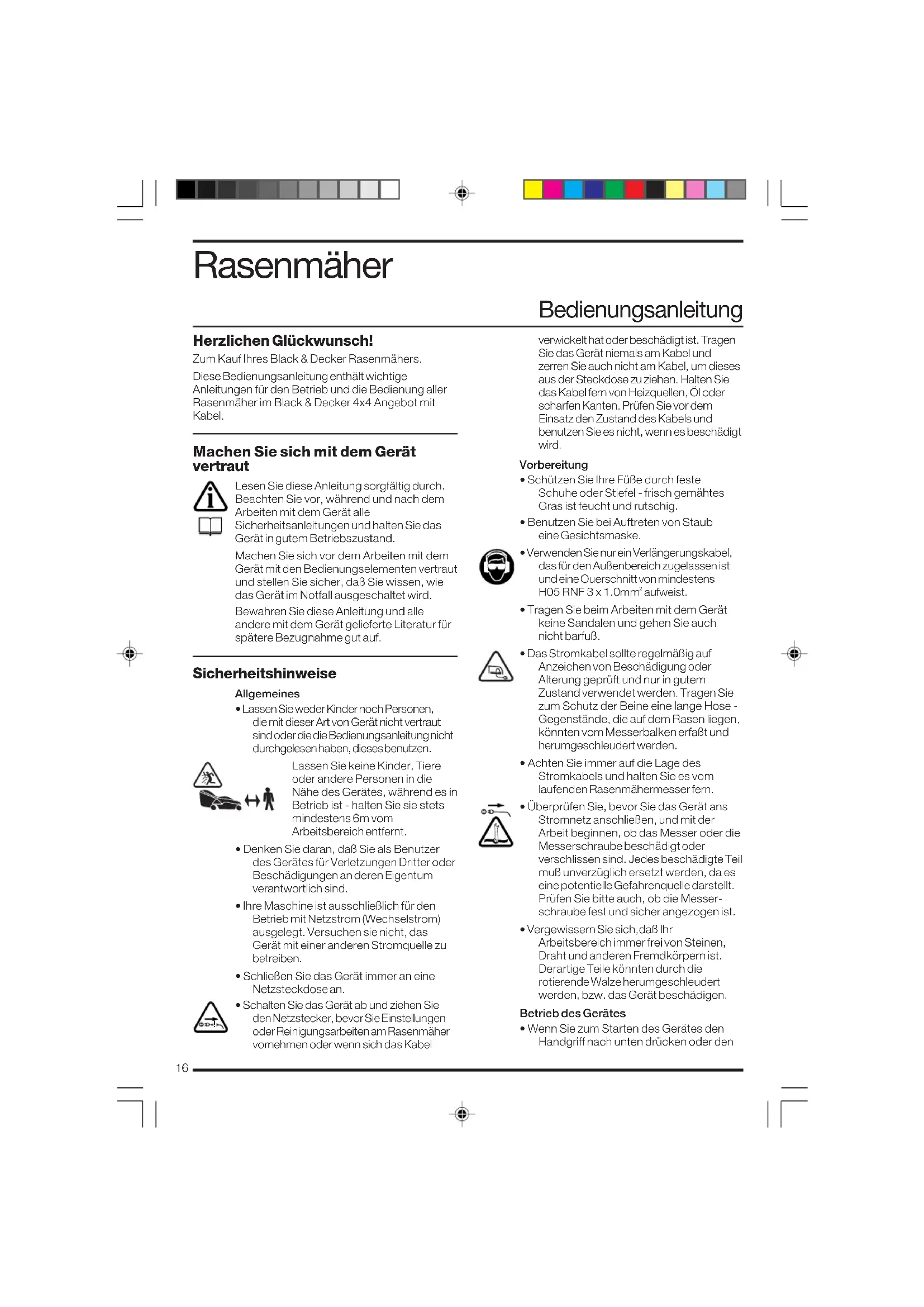 These Bedienungsanleitung enthalt wichtige Anleitungen für den Betrieb und die Bedienung aller Rasenmaher im Black & Decker 4x4 Angebot mit Kabel.