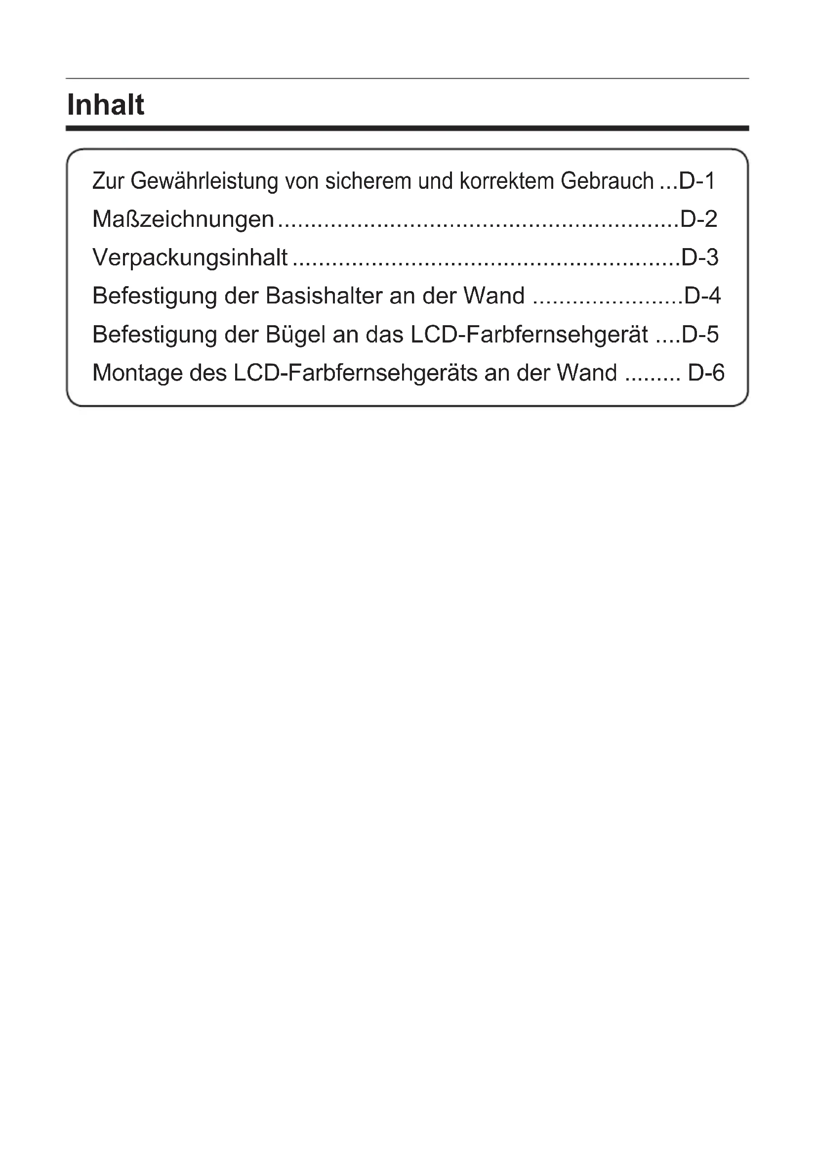 - Unterlassen Sie eine Modifi zierung oder Änderung der Installationsteile. Anderenfalls könnte das Fernsehgerät herunterfallen und Verletzungen oder Sachschäden verursachen. an65ag2sankaku1.indbD-1an65ag2sankaku1.indbD-1 2009/01/0514:31:462009/01/0514:31:46D-2 Bitte Folgendes unbedingt beachten. An den Handwerker