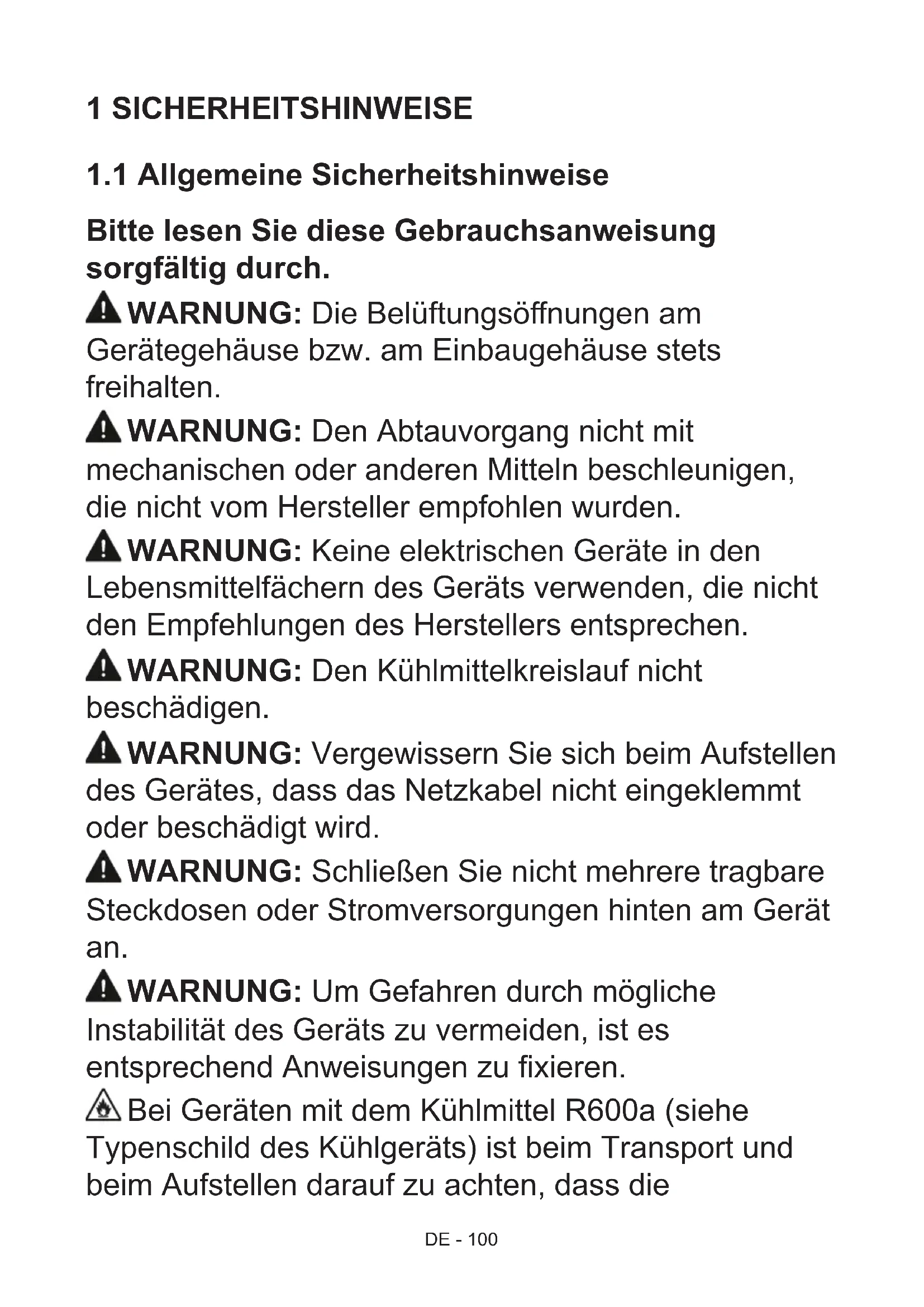 Bitte lesen Sie diese Gebrauchsanweisung sorgfältig durch. WARNUNG: Die Belüftungsönungen am Gerätegehäuse bzw. am Einbaugehäuse stets freihalten. WARNUNG: Den Abtauvorgang nicht mit mechanischen oder anderen Mitteln beschleunigen, die nicht vom Hersteller empfohlen wurden. WARNUNG: Keine elektrischen Geräte in den Lebensmittelfächern des Geräts verwenden, die nicht den Empfehlungen des Herstellers entsprechen. WARNUNG: Den Kühlmittelkreislauf nicht beschädigen. WARNUNG: Vergewissern Sie sich beim Aufstellen des Gerätes, dass das Netzkabel nicht eingeklemmt oder beschädigt wird. WARNUNG: Schließen Sie nicht mehrere tragbare Steckdosen oder Stromversorgungen hinten am Gerät an. WARNUNG: Um Gefahren durch mögliche Instabilität des Geräts zu vermeiden, ist es entsprechend Anweisungen zu xieren. Bei Geräten mit dem Kühlmittel R600a (siehe Typenschild des Kühlgeräts) ist beim Transport und beim Aufstellen darauf zu achten, dass dieDE - 101 Kühlelemente nicht beschädigt werden. R600a ist ein umweltfreundliches, natürliches, jedoch explosives Gas. Wenn die Kühlelemente aufgrund von Beschädigungen undicht werden, das Gerät von oenem Feuer und Wärmequellen fernhalten und den Aufstellraum mehrere Minuten gut lüften.