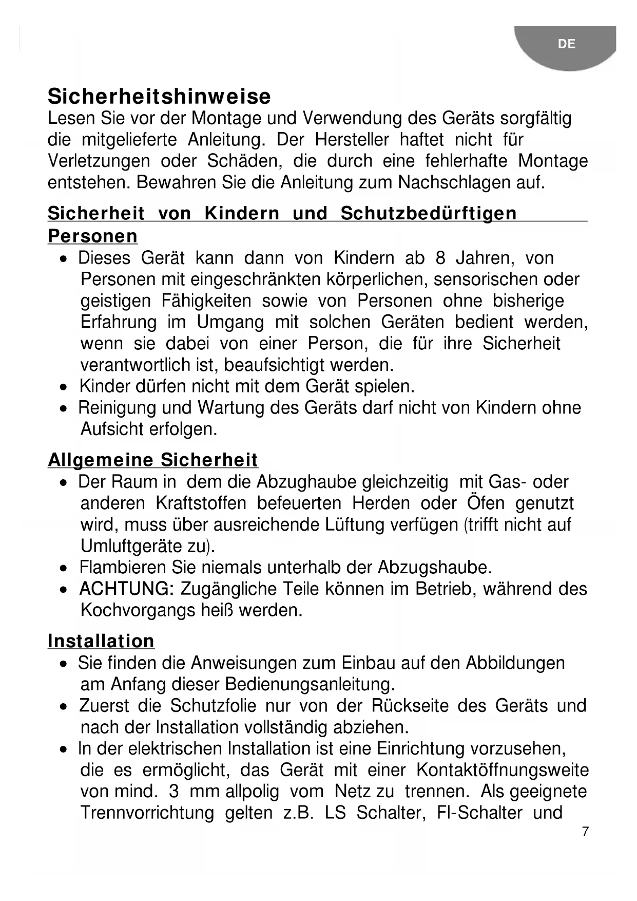 Sicherheitshinweise Lesen Sie vor der Montage und Verwendung des Geräts sorgfältig die mitgelieferte Anleitung. Der Hersteller haftet nicht für Verletzungen oder Schäden, die durch eine fehlerhafte Montage entstehen. Bewahren Sie die Anleitung zum Nachschlagen auf. Sicherheit von Kindern und Schutzbedürftigen Personen