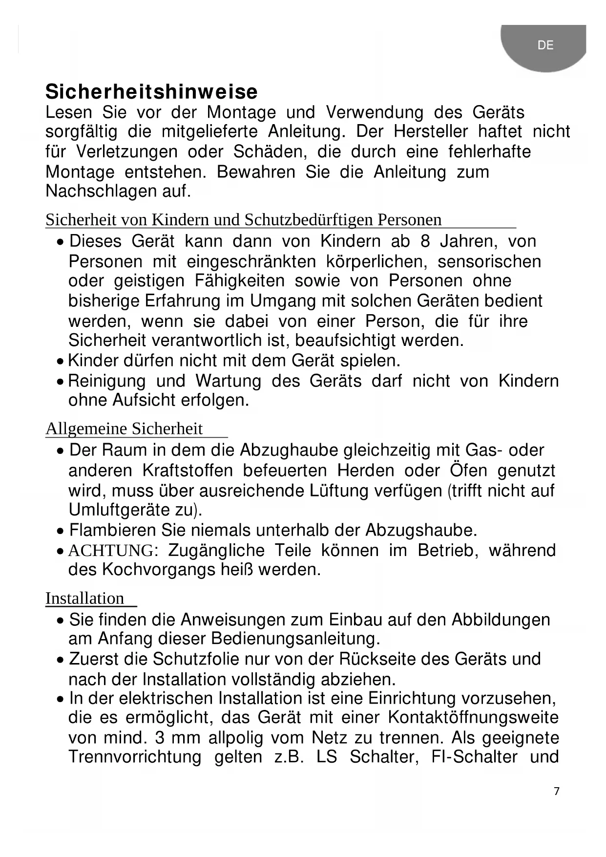 - Informieren Sie sich vor Einbau der Dunstabzugshaube über die jeweils geltenden örtlichen Vorschriften über Luft- und Rauchabzug.