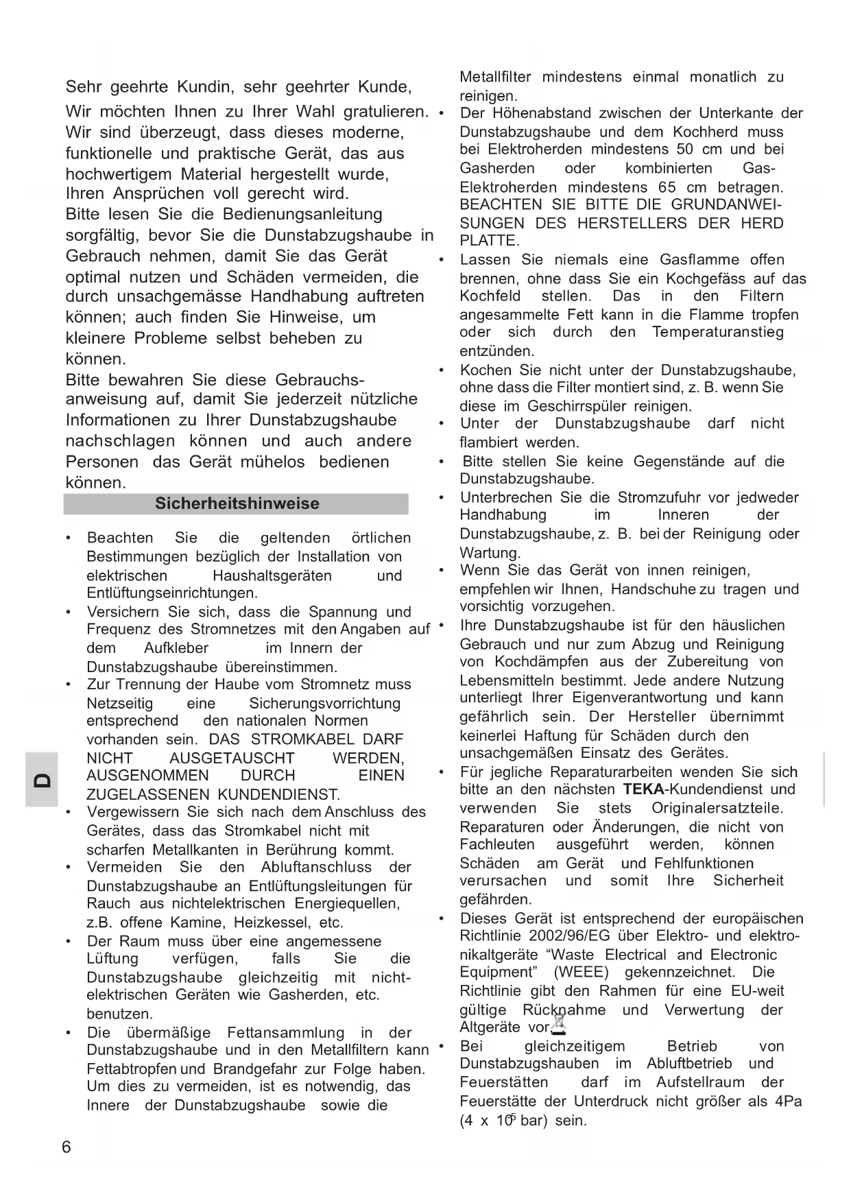 - Für jegliche Reparaturarbeiten wenden Sie sich bitte an den nächsten TEKA-Kundendienst und verwenden Sie stets Originalersatzteile. Reparaturen oder Änderungen, die nicht von Fachleuten ausgeführt werden, können Schäden am Gerät und Fehlfunktionen verursachen und somit Ihre Sicherheit gefährden.