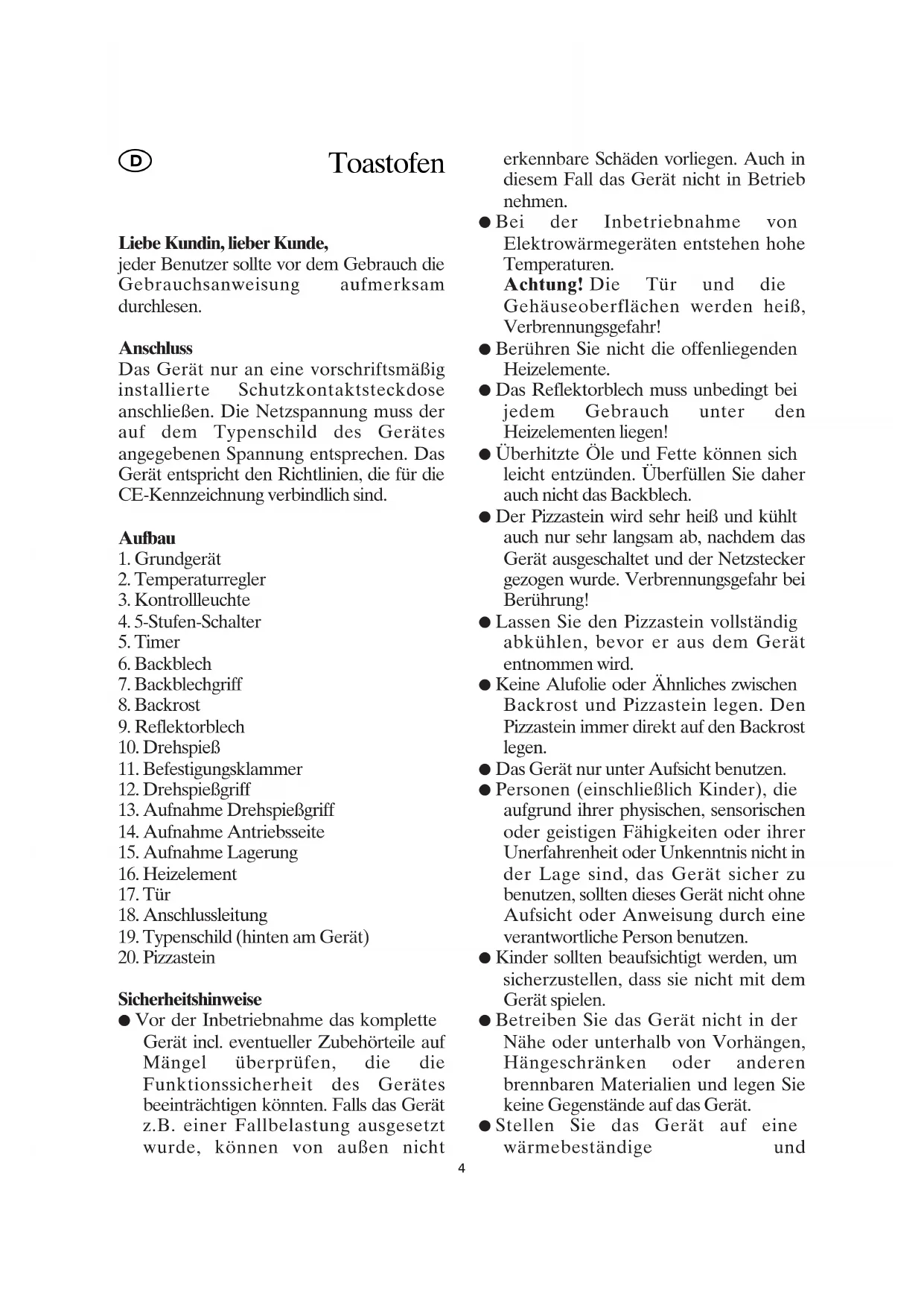Sicherheitshinweise ● Vor der Inbetriebnahme das komplette Gerät incl. eventueller Zubehörteile auf Mängel überprüfen, die die Funktionssicherheit des Gerätes beeinträchtigen könnten. Falls das Gerät z.B. einer Fallbelastung ausgesetzt wurde, können von außen nicht erkennbare Schäden vorliegen. Auch in diesem Fall das Gerät nicht in Betrieb nehmen. ● Bei der Inbetriebnahme von Elektrowärmegeräten entstehen hohe Temperaturen. Achtung! Die Tür und die Gehäuseoberflächen werden heiß, Verbrennungsgefahr! ● Berühren Sie nicht die offenliegenden Heizelemente. ● Das Reflektorblech muss unbedingt bei jedem Gebrauch unter den Heizelementen liegen! ● Überhitzte Öle und Fette können sich leicht entzünden. Überfüllen Sie daher auch nicht das Backblech. ● Der Pizzastein wird sehr heiß und kühlt auch nur sehr langsam ab, nachdem das Gerät ausgeschaltet und der Netzstecker gezogen wurde. Verbrennungsgefahr bei Berührung! ● Lassen Sie den Pizzastein vollständig abkühlen, bevor er aus dem Gerät entnommen wird. ● Keine Alufolie oder Ähnliches zwischen Backrost und Pizzastein legen. Den Pizzastein immer direkt auf den Backrost legen. ● Das Gerät nur unter Aufsicht benutzen. ● Personen (einschließlich Kinder), die aufgrund ihrer physischen, sensorischen oder geistigen Fähigkeiten oder ihrer Unerfahrenheit oder Unkenntnis nicht in der Lage sind, das Gerät sicher zu benutzen, sollten dieses Gerät nicht ohne Aufsicht oder Anweisung durch eine verantwortliche Person benutzen. ● Kinder sollten beaufsichtigt werden, um sicherzustellen, dass sie nicht mit dem Gerät spielen. ● Betreiben Sie das Gerät nicht in der Nähe oder unterhalb von Vorhängen, Hängeschränken oder anderen brennbaren Materialien und legen Sie keine Gegenstände auf das Gerät. ● Stellen Sie das Gerät auf eine wärmebeständige und