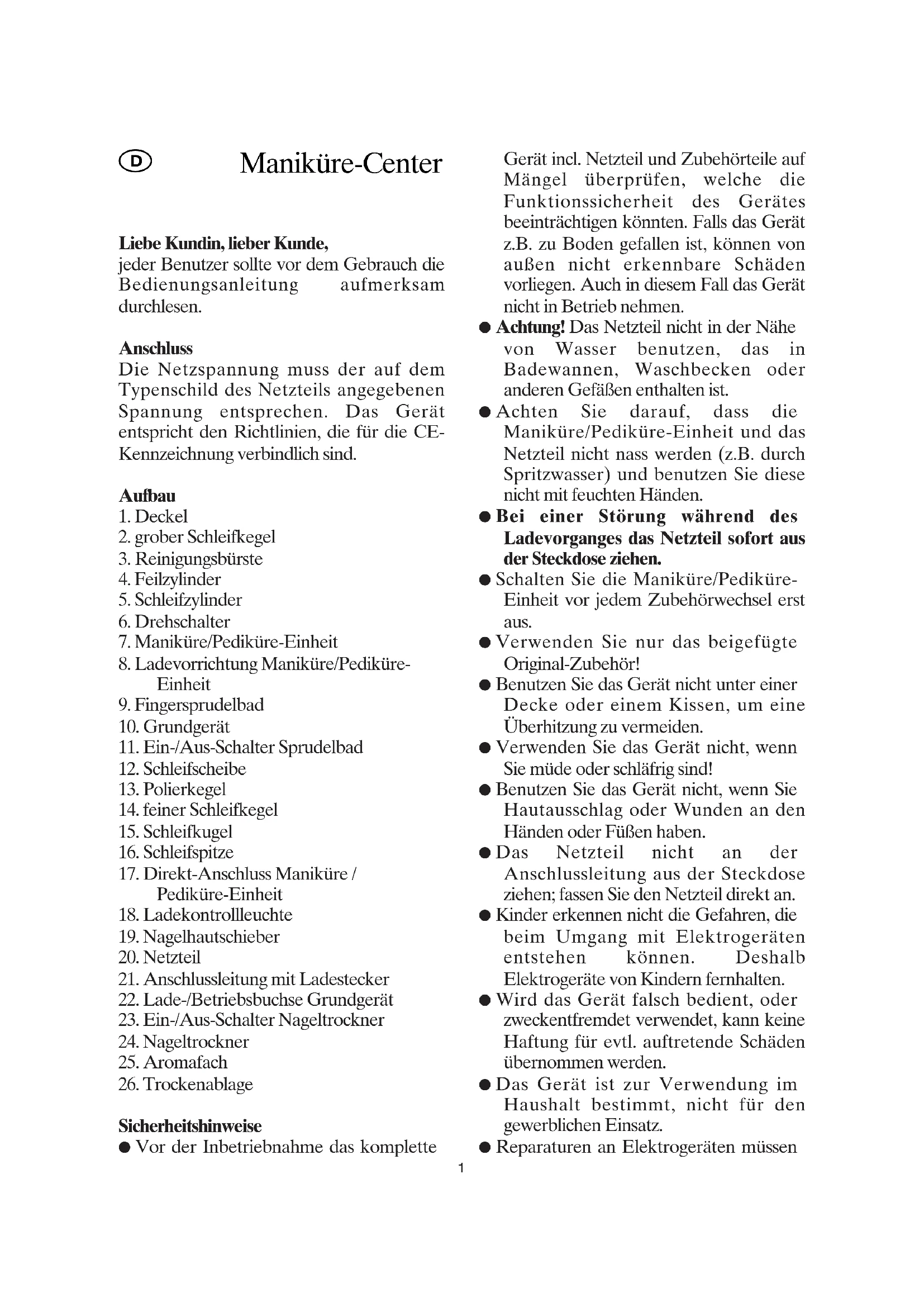 Achten Sie darauf, dass die Maniküre/Pediküre-Einheit und das Netzteil nicht Nass werden (z.B. durch Spritzwasser) und benutzen Sie diese nicht mit feuchten Händen.