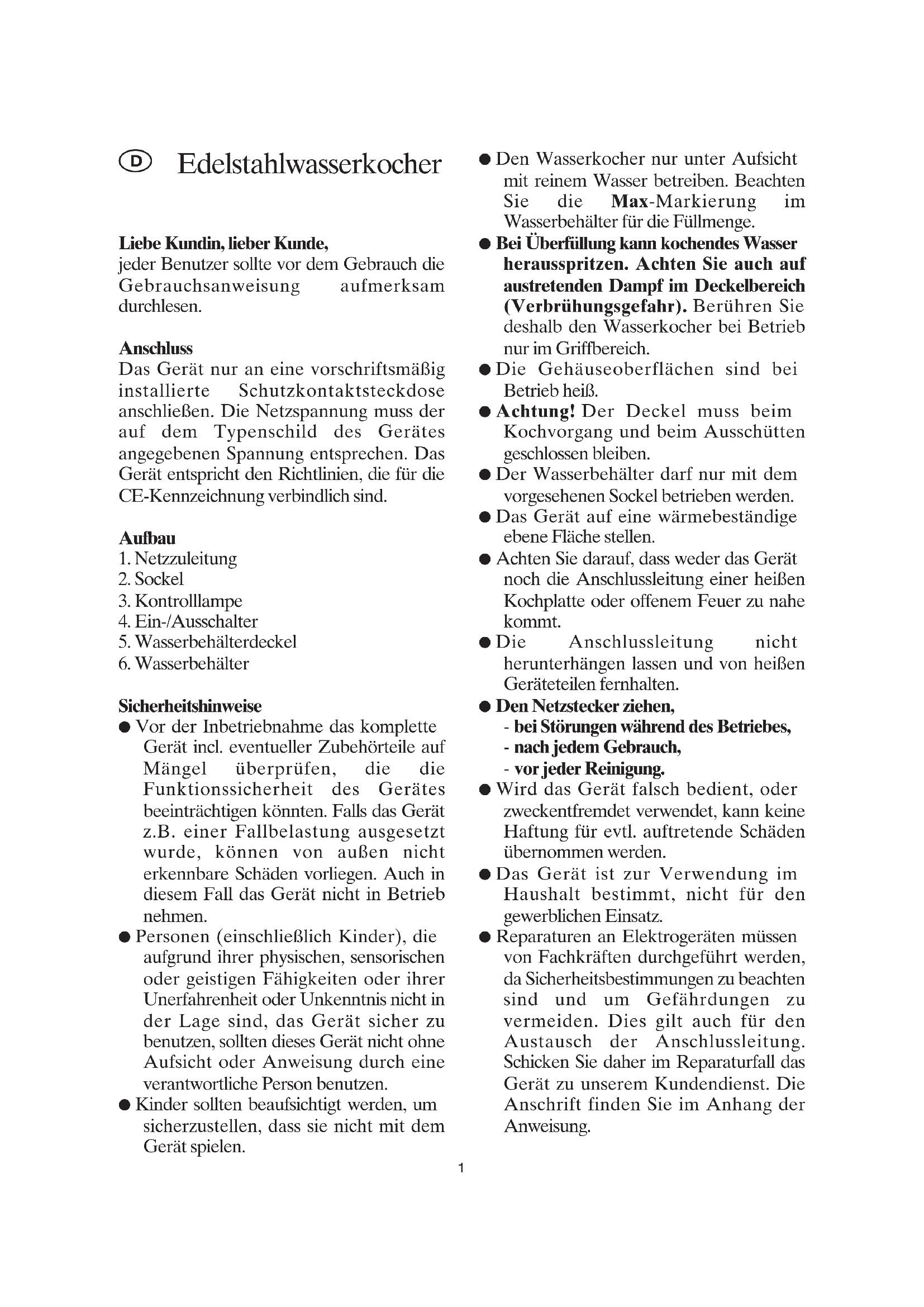 Das Gerat ist zur Verwendung im Haushalt bestimmt, nicht fur den gewerblichen Einsatz. - Reparaturen an Elektrogeräten müssen von Fachkräften durchgeführt werden, da Sicherheitsbestimmungen zu beachten sind und um Gefährdungen zu vermeiden. Dies gilt auch für den Austausch der Anschlussleitung. Schicken Sie dazu im Reparaturfall das Gerät zu unseren Kundendienst. Die Anschriftfinden Sie im Anhang der Anweisung.
