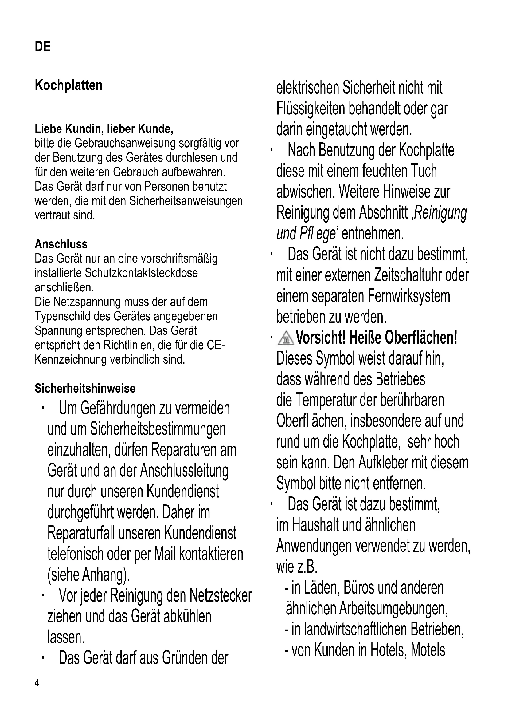 DE Gebrauchsanweisung GB Instructions for use FR Mode d’emploi NL Gebruiksaanwijzing ES Instrucciones de uso IT Manuale d’uso DK Brugsanvisning SE Bruksanvisning FI Käyttöohje PL Instrukcja obsługi GR Oδηγίες χρήσεως RU Руководство по эксплуатации Kochplatten 4 Electric table-top hot-plates 8 Plaques chauffantes électriques 12 Elektrische tafel warmhoudplaten 16 Placas eléctricas de mesa 20 Piano di cottura elettrico da tavolo 24 Elektrisk kogeplade 28 Elektrisk kokplatta av bordsmodell 31 Sähkölämpölevy 34 Elektryczna płyta grzewcza do gotowania i smażenia 37 Ηλεκτρικές επιτραπέζιες εστίες 41 Настольная электроплитка 45 www.severin.com2 Liebe Kundin, lieber Kunde, wir wünschen Ihnen mit dem Qualitätsprodukt aus dem Hause SEVERIN viel Freude und bedanken uns für Ihr Vertrauen. Die Marke SEVERIN steht seit über 120 Jahren für Beständigkeit, deutsche Qualität und Entwicklungskraft. Jedes Gerät wurde mit Sorgfalt hergestellt und geprüft. Mit der sprichwörtlichen Sauerländer Gründlichkeit, Genauigkeit und Ehrlichkeit überzeugt das Familienunternehmen aus Sundern seit der Gründung 1892 mit innovativen Produkten Kunden in aller Welt. In den sieben Produktgruppen Kaffee, Frühstück, Küche, Grillen, Haushalt, Personal Care und Kühlen & Gefrieren bietet SEVERIN mit über 250 Produkten ein umfassendes Elektrokleingeräte-Sortiment. Für jeden Anlass das richtige Produkt! Lernen Sie die SEVERIN-Produktvielfalt kennen und besuchen Sie uns unter www.severin.de oder www.severin.com. Ihre Geschäftsleitung und Mitarbeiter der SEVERIN Elektrogeräte GmbH34 Kochplatten Liebe Kundin, lieber Kunde, bitte die Gebrauchsanweisung sorgfältig vor der Benutzung des Gerätes durchlesen und für den weiteren Gebrauch aufbewahren. Das Gerät darf nur von Personen benutzt werden, die mit den Sicherheitsanweisungen vertraut sind. Anschluss Das Gerät nur an eine vorschriftsmäßig installierte Schutzkontaktsteckdose anschließen. Die Netzspannung muss der auf dem Typenschild des Gerätes angegebenen Spannung entsprechen. Das Gerät entspricht den Richtlinien, die für die CE- Kennzeichnung verbindlich sind. Sicherheitshinweise ∙ Um Gefährdungen zu vermeiden und um Sicherheitsbestimmungen einzuhalten, dürfen Reparaturen am Gerät und an der Anschlussleitung nur durch unseren Kundendienst durchgeführt werden. Daher im Reparaturfall unseren Kundendienst telefonisch oder per Mail kontaktieren (siehe Anhang). ∙ Vor jeder Reinigung den Netzstecker ziehen und das Gerät abkühlen lassen. ∙ Das Gerät darf aus Gründen der elektrischen Sicherheit nicht mit Flüssigkeiten behandelt oder gar darin eingetaucht werden. ∙ Nach Benutzung der Kochplatte diese mit einem feuchten Tuch abwischen. Weitere Hinweise zur Reinigung dem Abschnitt ‚Reinigung und Pfl ege‘ entnehmen. ∙ Das Gerät ist nicht dazu bestimmt, mit einer externen Zeitschaltuhr oder einem separaten Fernwirksystem betrieben zu werden.