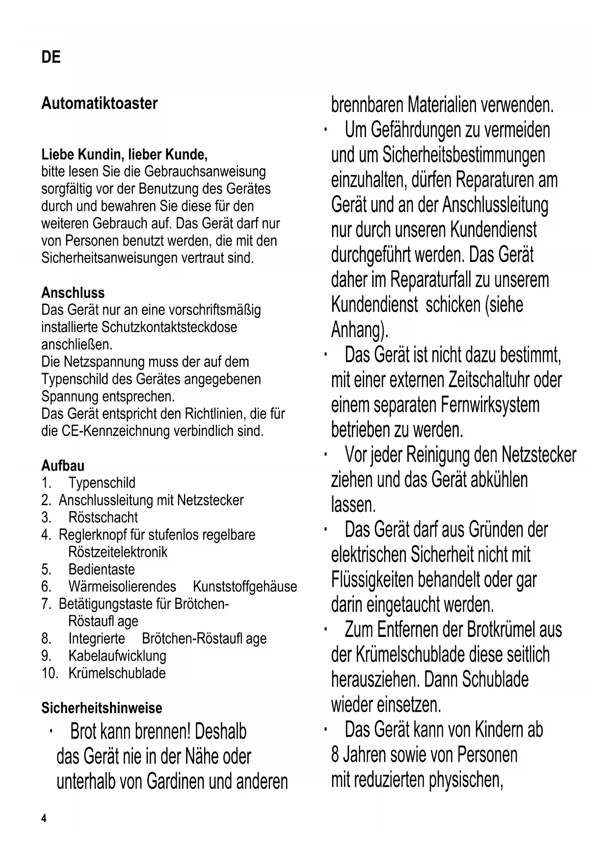 Sicherheitshinweise ∙ Brot kann brennen! Deshalb das Gerät nie in der Nähe oder unterhalb von Gardinen und anderen brennbaren Materialien verwenden. ∙ Um Gefährdungen zu vermeiden und um Sicherheitsbestimmungen einzuhalten, dürfen Reparaturen am Gerät und an der Anschlussleitung nur durch unseren Kundendienst durchgeführt werden. Das Gerät daher im Reparaturfall zu unserem Kundendienst schicken (siehe Anhang). ∙ Das Gerät ist nicht dazu bestimmt, mit einer externen Zeitschaltuhr oder einem separaten Fernwirksystem betrieben zu werden. ∙ Vor jeder Reinigung den Netzstecker ziehen und das Gerät abkühlen lassen. ∙ Das Gerät darf aus Gründen der elektrischen Sicherheit nicht mit Flüssigkeiten behandelt oder gar darin eingetaucht werden. ∙ Zum Entfernen der Brotkrümel aus der Krümelschublade diese seitlich herausziehen. Dann Schublade wieder einsetzen. ∙ Das Gerät kann von Kindern ab 8 Jahren sowie von Personen mit reduzierten physischen, DE5 sensorischen oder mentalen Fähigkeiten oder Mangel an Erfahrung und/oder Wissen benutzt werden, wenn sie beaufsichtigt oder bezüglich des sicheren Gebrauchs des Gerätes unterwiesen wurden und die daraus resultierenden Gefahren verstanden haben. ∙ Kinder dürfen nicht mit dem Gerät spielen. ∙ Reinigung und Benutzer-Wartung dürfen nicht durch Kinder durchgeführt werden, es sei denn sie sind 8 Jahre und älter und werden beaufsichtigt. ∙ Kinder jünger als 8 Jahre sind vom Gerät und der Anschlussleitung fernzuhalten. ∙ Halten Sie Kinder von Verpackungsmaterial fern. Es besteht u.a. Erstickungsgefahr! ∙ Das Gerät auf eine wärmebeständige ebene Fläche stellen. ∙ Das Gerät nicht auf heiße Oberfl ächen (z.B. Herdplatten o.ä.) oder in der Nähe von offenen Gasfl ammen abstellen oder benutzen, damit das Gehäuse nicht beschädigt wird. ∙ Achtung! Während des Betriebes kann die Temperatur der berührbaren Oberfl äche sehr hoch sein. Verbrennungsgefahr! ∙ Vor der Inbetriebnahme das komplette Gerät inkl. Anschlussleitung und eventueller Zubehörteile auf Mängel und Beschädigungen überprüfen, die die Funktionssicherheit des Gerätes beeinträchtigen könnten. Falls das Gerät z.B. zu Boden gefallen ist oder an der Anschlussleitung gezogen wurde, können von außen nicht erkennbare Schäden vorliegen. In diesen Fällen das Gerät nicht in Betrieb nehmen. ∙ Die Anschlussleitung darf heiße Geräteteile nicht berühren. ∙ Die Anschlussleitung nicht herunterhängen lassen. ∙ Das Gerät niemals ohne Aufsicht betreiben. ∙ Bei Betrieb des Gerätes den Röstschacht niemals abdecken. ∙ Nicht mit Fingern oder Gegenständen (z.B. Gabel, Messer o.ä.) in den Röstschacht hineingelangen, da die Heizelemente spannungsführend sind. ∙ Den Netzstecker des Gerätes ziehen, - nach jedem Gebrauch, - bei Störungen während des Betriebes, - vor jeder Reinigung des Gerätes. ∙ Den Netzstecker nicht an der Anschlussleitung aus der Steckdose ziehen; fassen Sie den Netzstecker an. ∙ Wird das Gerät falsch bedient, oder zweckentfremdet verwendet, kann keine Haftung für evtl. auftretende Schäden übernommen werden. ∙ Das Gerät ist dazu bestimmt, im Haushalt und ähnlichen Anwendungen verwendet zu werden, z.B. - in Läden, Büros und anderen ähnlichen Arbeitsumgebungen, - in landwirtschaftlichen Betrieben, - von Kunden in Hotels, Motels und6 weiteren typischen Wohnumgebungen, - in Frühstückspensionen. Bedienung Allgemeine Hinweise ∙ Achtung: Die Bedientaste rastet nur bei angeschlossener Zuleitung ein! ∙ Zu dicke oder zu große Scheiben nicht verwenden, da diese sich leicht verklemmen. Es können Brotscheiben bis maximal 14 mm Dicke getoastet werden. ∙ Bei Störungen und beim Reinigen erst den Netzstecker aus der Steckdose ziehen! ∙ Verklemmte Brotscheiben mit einem stumpfen Holzstab (z.B. Pinselstiel) lösen. Dabei die Heizkörper nicht berühren. Vor der ersten Inbetriebnahme ∙ Toaster reinigen (siehe „Reinigung und Pfl ege“). ∙ Betreiben Sie den Toaster ohne Toastbrot mindestens fünfmal bei maximaler Einstellung. ∙ Zwischen den einzelnen Aus- und Einschaltvorgängen den Toaster abkühlen lassen. ∙ Beim ersten Gebrauch kann ein leichter Geruch entstehen (geringe Rauchentwicklung möglich). Daher für ausreichende Lüftung durch geöffnete Fenster und Balkontüren sorgen. Einstellung des Bräunungsgrades Der gewünschte Bräunungsgrad kann stufenlos am Reglerknopf eingestellt werden. Hell: Reglerknopf nach links drehen. Dunkel: Reglerknopf nach rechts drehen. Wir empfehlen eine Einstellung des Bräunungsgrades für Toastbrot zwischen 3 und 4. Betrieb ∙ Nach Einstellen des gewünschten Bräunungsgrades legen Sie das Brot in den Röstschacht und drücken die Bedientaste nach unten. ∙ Ist der eingestellte Bräunungsgrad erreicht, schaltet sich der Toaster automatisch ab und die Brotscheiben kommen wieder nach oben. ∙ Um eine gleichmäßige Bräunung bei mehreren Toastvorgängen zu erzielen, warten Sie nach jedem Toastvorgang ca. 1 bis 1 ½ Minuten. ∙ Bei Betrieb des Toasters den Röstschacht nicht abdecken! Unterbrechung des Toastvorganges Um den Toastvorgang zu unterbrechen, die Bedientaste nach oben schieben. Aufbacken von Brötchen ∙ Zum Aufbacken von Brötchen die Betätigungstaste in Richtung Röstschacht schieben. Die Brötchen-Röstaufl age klappt hoch. ∙ Brötchen aufl egen, am Reglerknopf der Röstzeitelektronik eine mittlere Einstellung wählen und die Bedientaste zum Einschalten herunterdrücken. ∙ Nach dem Abschalten die Brötchen wenden und den Toaster erneut einschalten. ∙ Zum Einklappen der Röstaufl age die Betätigungstaste zurückschieben. Die Röstaufl age liegt dann wieder fl ach auf dem Toaster. ∙ Brötchen nie direkt auf den Röstschacht legen!7 Reinigung und Pfl ege Allgemein ∙ Vor jeder Reinigung den Netzstecker ziehen und den Toaster abkühlen lassen. ∙ Das Gerät darf aus Gründen der elektrischen Sicherheit nicht mit Flüssigkeiten beha