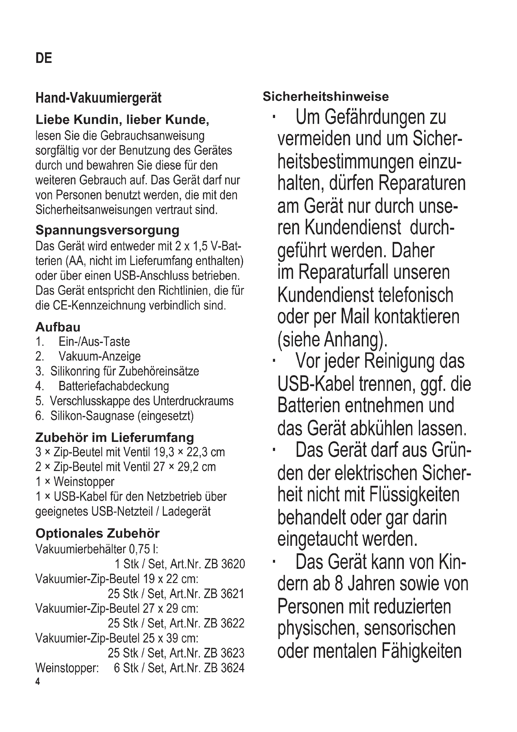 Zubehör im Lieferumfang 3 × Zip-Beutel mit Ventil 19,3 × 22,3 cm 2 × Zip-Beutel mit Ventil 27 × 29,2 cm 1 × Weinstopper 1 × USB-Kabel für den Netzbetrieb über geeignetes USB-Netzteil / Ladegerät Optionales Zubehör Vakuumierbehälter 0,75 l: 1 Stk / Set, Art.Nr. ZB 3620 Vakuumier-Zip-Beutel 19 x 22 cm: 25 Stk / Set, Art.Nr. ZB 3621 Vakuumier-Zip-Beutel 27 x 29 cm: 25 Stk / Set, Art.Nr. ZB 3622 Vakuumier-Zip-Beutel 25 x 39 cm: 25 Stk / Set, Art.Nr. ZB 3623 Weinstopper: 6 Stk / Set, Art.Nr. ZB 3624 Sicherheitshinweise ∙ Um Gefährdungen zu vermeiden und um Sicher- heitsbestimmungen einzu- halten, dürfen Reparaturen am Gerät nur durch unse- ren Kundendienst durch- geführt werden. Daher im Reparaturfall unseren Kundendienst telefonisch oder per Mail kontaktieren (siehe Anhang). ∙ Vor jeder Reinigung das USB-Kabel trennen, ggf. die Batterien entnehmen und das Gerät abkühlen lassen. ∙ Das Gerät darf aus Grün- den der elektrischen Sicher- heit nicht mit Flüssigkeiten behandelt oder gar darin eingetaucht werden. ∙ Das Gerät kann von Kin- dern ab 8 Jahren sowie von Personen mit reduzierten physischen, sensorischen oder mentalen Fähigkeiten DE104 x 142 mm