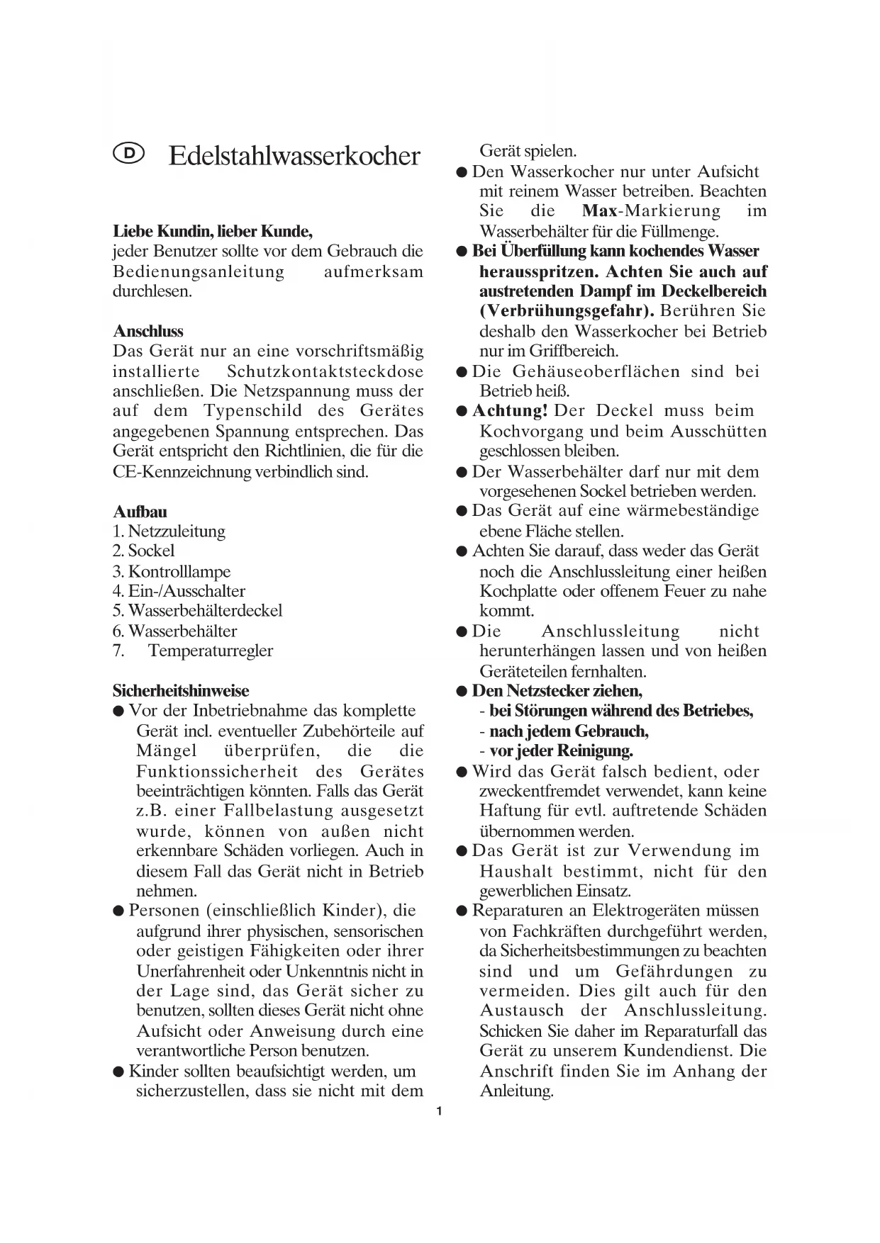 - Aus hygienischen Gründen die ersten Kochfällung des neuen Wasserkocherswegschüten.