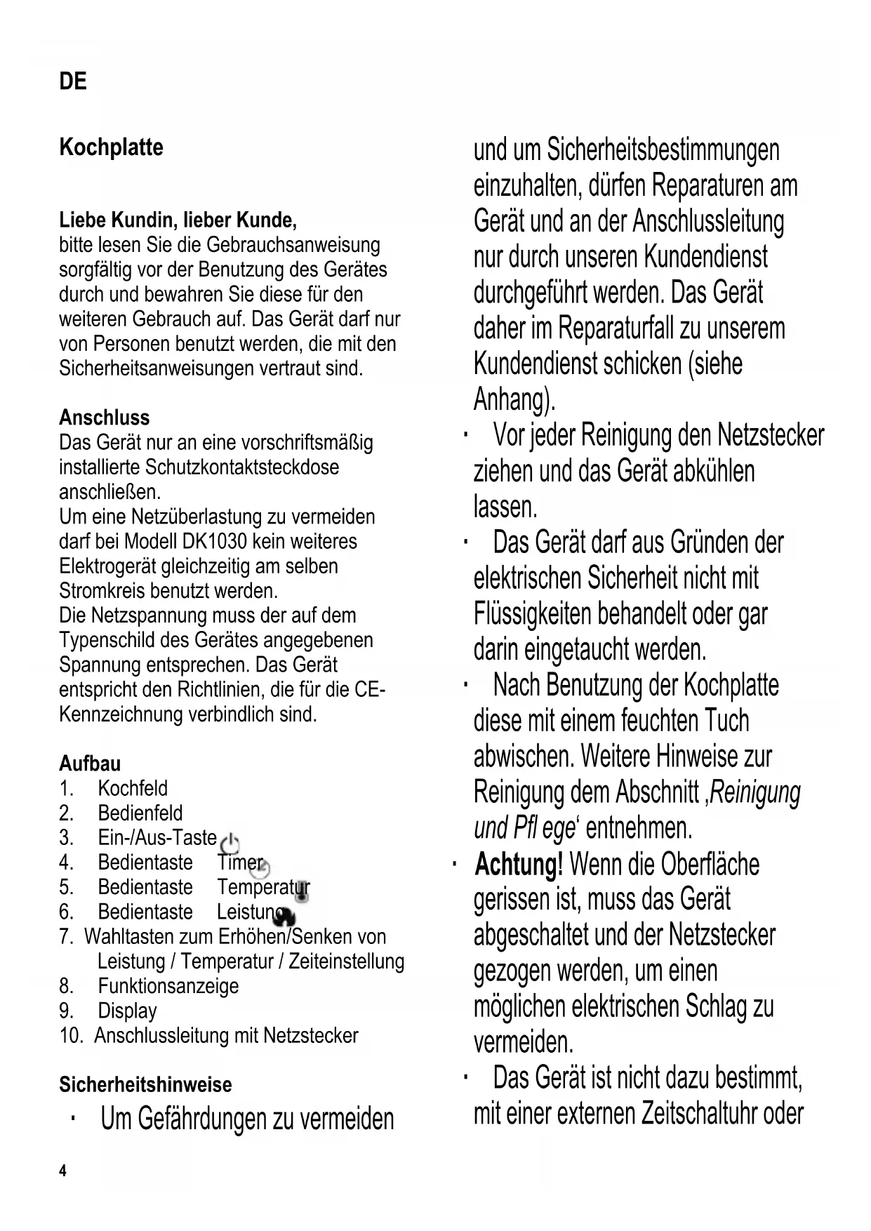 Kochplatte Liebe Kundin, lieber Kunde, bitte lesen Sie die Gebrauchsanweisung sorgfältig vor der Benutzung des Gerätes durch und bewahren Sie diese für den weiteren Gebrauch auf. Das Gerät darf nur von Personen benutzt werden, die mit den Sicherheitsanweisungen vertraut sind. Anschluss Das Gerät nur an eine vorschriftsmäßig installierte Schutzkontaktsteckdose anschließen. Um eine Netzüberlastung zu vermeiden darf bei Modell DK1030 kein weiteres Elektrogerät gleichzeitig am selben Stromkreis benutzt werden. Die Netzspannung muss der auf dem Typenschild des Gerätes angegebenen Spannung entsprechen. Das Gerät entspricht den Richtlinien, die für die CE- Kennzeichnung verbindlich sind. Aufbau