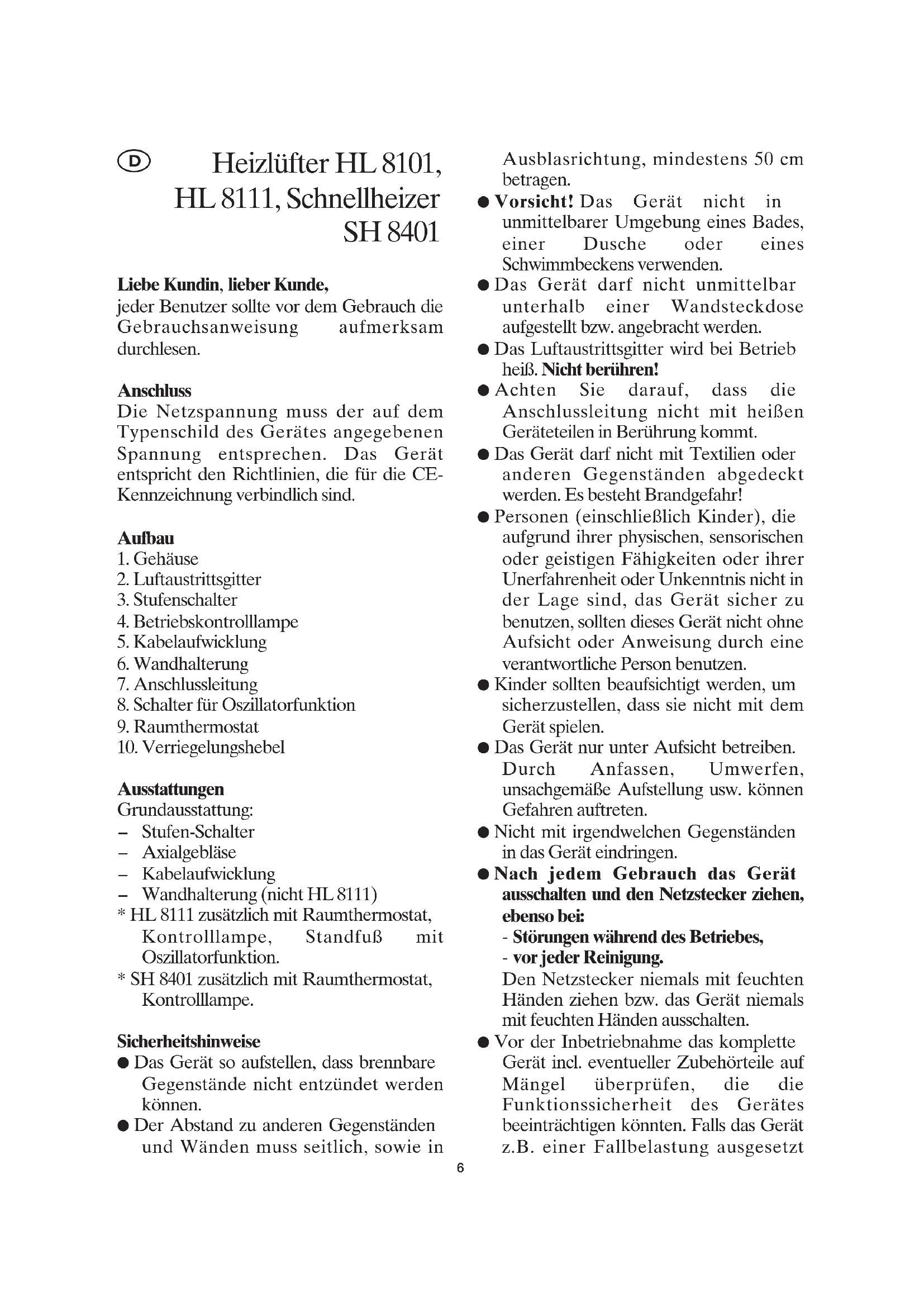 Heizlufter HL 8101, HL 8111, Schnellheizer SH 8401