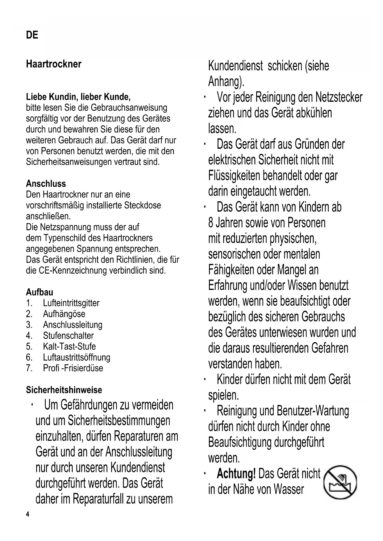 Haartrockner Liebe Kundin, lieber Kunde, bitte lesen Sie die Gebrauchsanweisung sorgfältig vor der Benutzung des Gerätes durch und bewahren Sie diese für den weiteren Gebrauch auf. Das Gerät darf nur von Personen benutzt werden, die mit den Sicherheitsanweisungen vertraut sind. Anschluss Den Haartrockner nur an eine vorschriftsmäßig installierte Steckdose anschließen. Die Netzspannung muss der auf dem Typenschild des Haartrockners angegebenen Spannung entsprechen. Das Gerät entspricht den Richtlinien, die für die CE-Kennzeichnung verbindlich sind. Aufbau