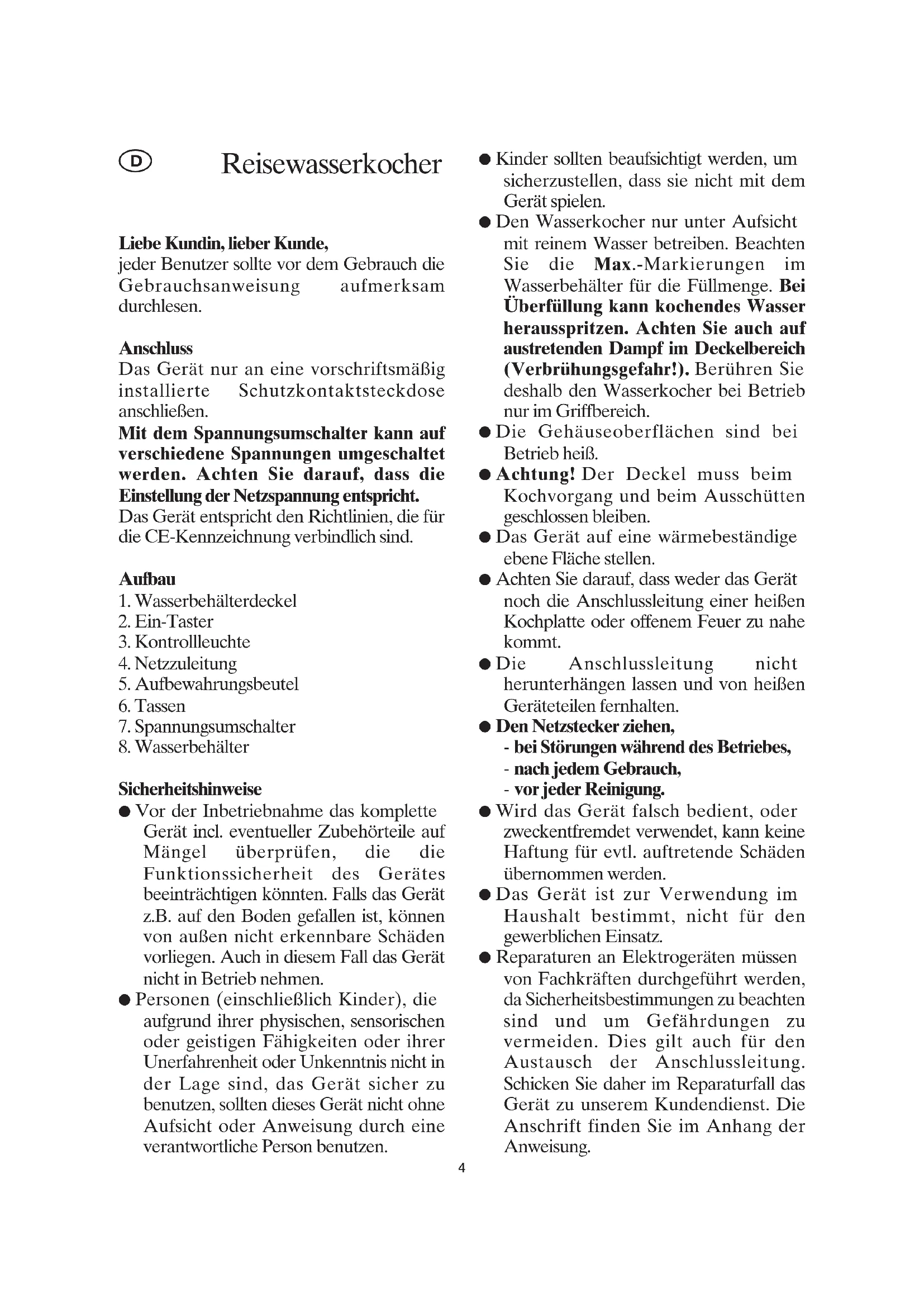Sicherheitshinweise ● Vor der Inbetriebnahme das komplette Gerät incl. eventueller Zubehörteile auf Mängel überprüfen, die die Funktionssicherheit des Gerätes beeinträchtigen könnten. Falls das Gerät z.B. auf den Boden gefallen ist, können von außen nicht erkennbare Schäden vorliegen. Auch in diesem Fall das Gerät nicht in Betrieb nehmen. ● Personen (einschließlich Kinder), die aufgrund ihrer physischen, sensorischen oder geistigen Fähigkeiten oder ihrer Unerfahrenheit oder Unkenntnis nicht in der Lage sind, das Gerät sicher zu benutzen, sollten dieses Gerät nicht ohne Aufsicht oder Anweisung durch eine verantwortliche Person benutzen. ● Kinder sollten beaufsichtigt werden, um sicherzustellen, dass sie nicht mit dem Gerät spielen. ● Den Wasserkocher nur unter Aufsicht mit reinem Wasser betreiben. Beachten Sie die Max.-Markierungen im Wasserbehälter für die Füllmenge. Bei Überfüllung kann kochendes Wasser herausspritzen. Achten Sie auch auf austretenden Dampf im Deckelbereich (Verbrühungsgefahr!). Berühren Sie deshalb den Wasserkocher bei Betrieb nur im Griffbereich. ● Die Gehäuseoberflächen sind bei Betrieb heiß. ● Achtung! Der Deckel muss beim Kochvorgang und beim Ausschütten geschlossen bleiben. ● Das Gerät auf eine wärmebeständige ebene Fläche stellen. ● Achten Sie darauf, dass weder das Gerät noch die Anschlussleitung einer heißen Kochplatte oder offenem Feuer zu nahe kommt. ● Die Anschlussleitung nicht herunterhängen lassen und von heißen Geräteteilen fernhalten. ● Den Netzstecker ziehen, - bei Störungen während des Betriebes, - nach jedem Gebrauch, - vor jeder Reinigung. ● Wird das Gerät falsch bedient, oder zweckentfremdet verwendet, kann keine Haftung für evtl. auftretende Schäden übernommen werden. ● Das Gerät ist zur Verwendung im Haushalt bestimmt, nicht für den gewerblichen Einsatz. ● Reparaturen an Elektrogeräten müssen von Fachkräften durchgeführt werden, da Sicherheitsbestimmungen zu beachten sind und um Gefährdungen zu vermeiden. Dies gilt auch für den Austausch der Anschlussleitung. Schicken Sie daher im Reparaturfall das Gerät zu unserem Kundendienst. Die Anschrift finden Sie im Anhang der Anweisung.