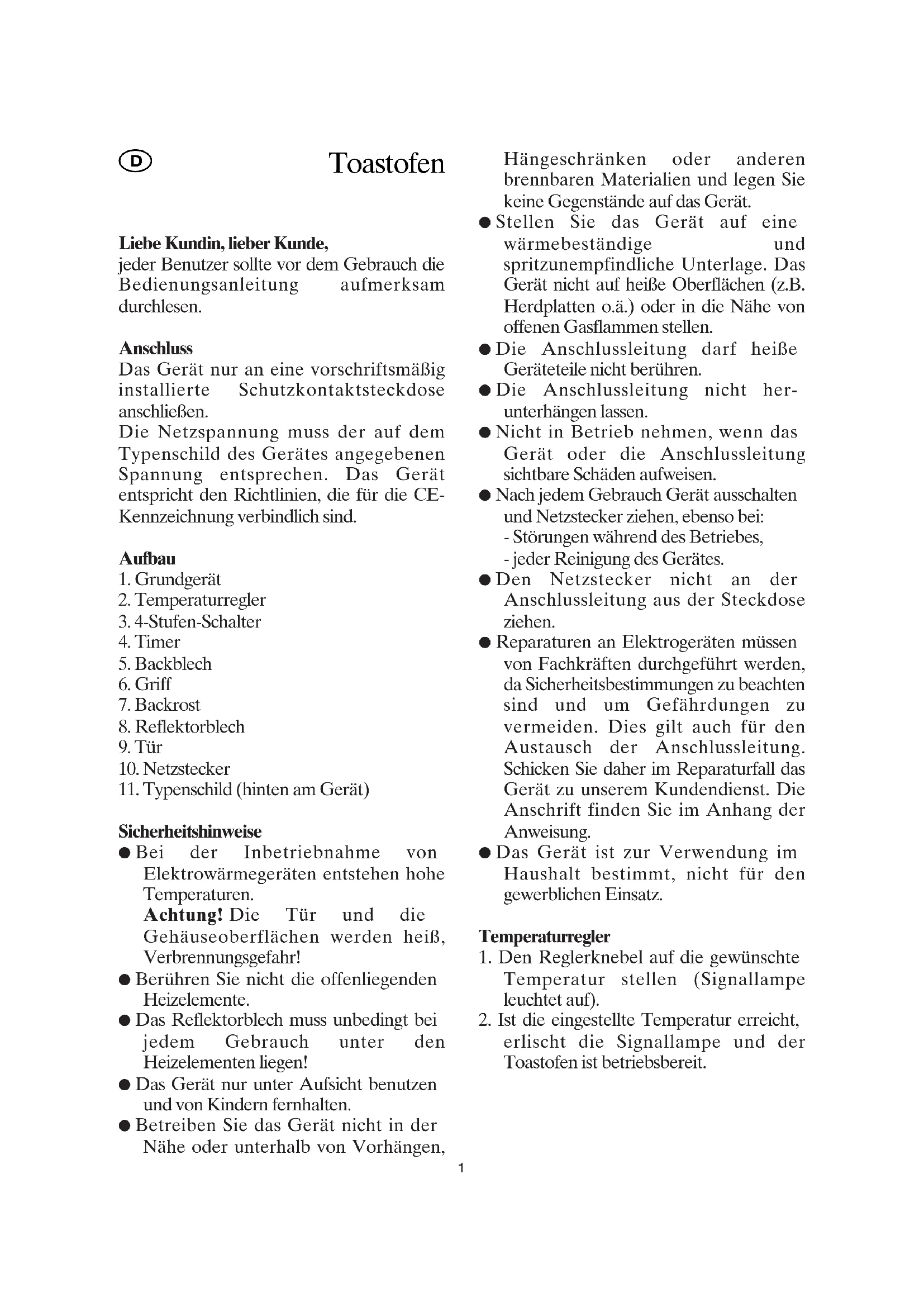 Sicherheitshinweise ● Bei der Inbetriebnahme von Elektrowärmegeräten entstehen hohe Temperaturen. Achtung! Die Tür und die Gehäuseoberflächen werden heiß, Verbrennungsgefahr! ● Berühren Sie nicht die offenliegenden Heizelemente. ● Das Reflektorblech muss unbedingt bei jedem Gebrauch unter den Heizelementen liegen! ● Das Gerät nur unter Aufsicht benutzen und von Kindern fernhalten. ● Betreiben Sie das Gerät nicht in der Nähe oder unterhalb von Vorhängen, Hängeschränken oder anderen brennbaren Materialien und legen Sie keine Gegenstände auf das Gerät. ● Stellen Sie das Gerät auf eine wärmebeständige und spritzunempfindliche Unterlage. Das Gerät nicht auf heiße Oberflächen (z.B. Herdplatten o.ä.) oder in die Nähe von offenen Gasflammen stellen. ● Die Anschlussleitung darf heiße Geräteteile nicht berühren. ● Die Anschlussleitung nicht her- unterhängen lassen. ● Nicht in Betrieb nehmen, wenn das Gerät oder die Anschlussleitung sichtbare Schäden aufweisen. ● Nach jedem Gebrauch Gerät ausschalten und Netzstecker ziehen, ebenso bei: - Störungen während des Betriebes, - jeder Reinigung des Gerätes. ● Den Netzstecker nicht an der Anschlussleitung aus der Steckdose ziehen. ● Reparaturen an Elektrogeräten müssen von Fachkräften durchgeführt werden, da Sicherheitsbestimmungen zu beachten sind und um Gefährdungen zu vermeiden. Dies gilt auch für den Austausch der Anschlussleitung. Schicken Sie daher im Reparaturfall das Gerät zu unserem Kundendienst. Die Anschrift finden Sie im Anhang der Anweisung. ● Das Gerät ist zur Verwendung im Haushalt bestimmt, nicht für den gewerblichen Einsatz. Temperaturregler