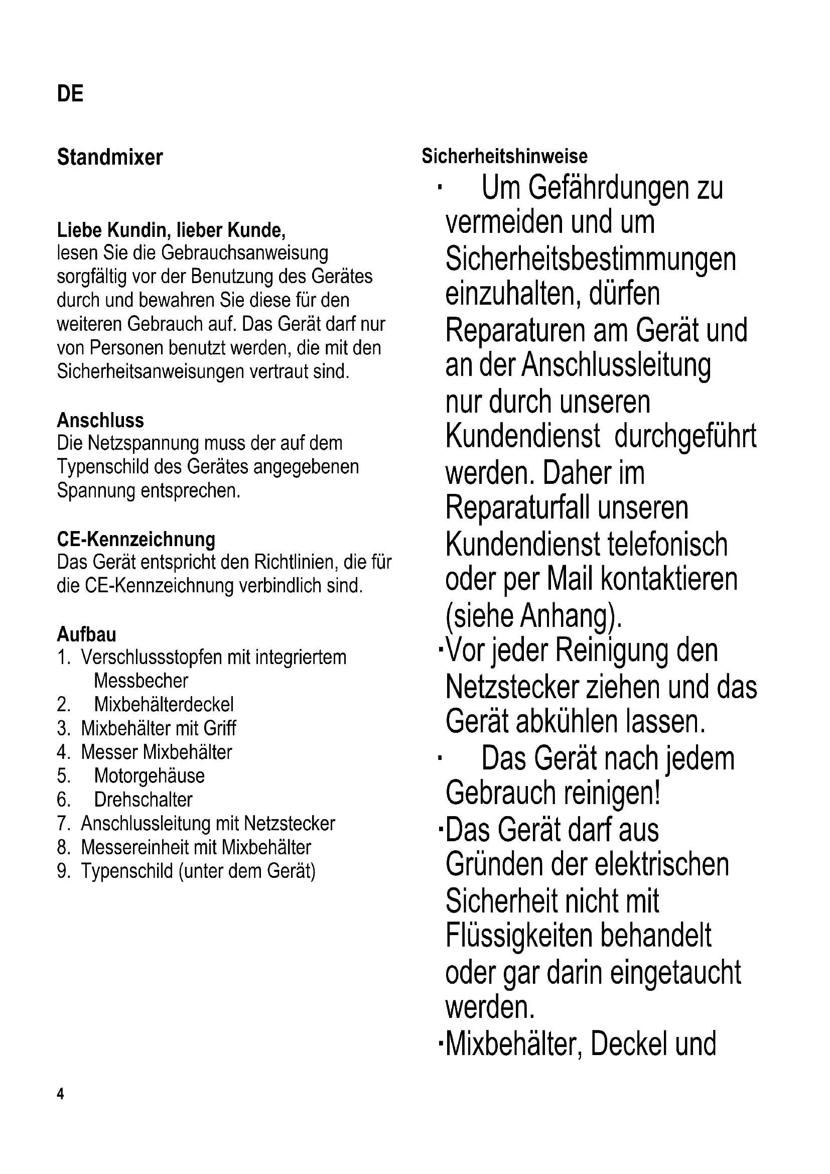 und Beschädigungen überprüfen, die die Funktionssicherheit des Gerätes beeinträchtigen könnten. Falls das Gerät z.B. zu Boden gefallen ist oder an der Anschlussleitung gezogen wurde, können von außen nicht erkennbare Schäden vorliegen. In diesen Fällen das Gerät nicht in Betrieb nehmen. ∙ Das Gerät nicht im Freien betreiben. ∙ Das Gerät auf eine ebene Fläche stellen. Weder das Gehäuse noch die Anschlussleitung dürfen einer heißen Kochplatte oder offenem Feuer zu nahe kommen. ∙ Die Anschlussleitung nicht herunterhängen lassen. ∙ Haare, Hände und lockere Kleidung von beweglichen Teilen, Öffnungen und Lüftungsschlitzen fernhalten, um ein Verfangen zu vermeiden. ∙ Keinesfalls sich in Bewegung bendliche Geräteteile berühren, Verletzungsgefahr! ∙ Während des Betriebs niemals mit den Händen oder mit Küchenzubehör in den Mixbehälter hineingreifen. ∙ Die Messereinheit nicht ohne Mixbehälter auf die Motoreinheit aufsetzen. ∙ Das Gerät darf nur mit Original-Zubehör benutzt werden. ∙ Wird das Gerät falsch bedient, kann keine Haftung für evtl. auftretende Schäden übernommen werden. Erste Inbetriebnahme Den Mixbehälter und den Deckel mit Verschlussstopfen vor der ersten Benutzung reinigen (siehe Reinigung und Pege). Schaltstufen Das Gerät hat folgende Schaltstufen: P Gerät ist mit hoher Leistung eingeschaltet, solange der Drehschalter in dieser Stellung gehalten wird 0 Gerät ist ausgeschaltet. 1 Gerät ist mit niedriger Leistung eingeschaltet. 2 Gerät ist mit hoher Leistung eingeschaltet. Kurzzeitbetrieb Das Gerät ist für die Verarbeitung haushaltsüblicher Mengen ausgelegt. Sie können das Gerät bis zu 3 Minuten ununterbrochen benutzen. Anschließend muss der Motor ausreichend abkühlen. Sicherheitsschalter Im Motorgehäuse bendet sich ein Sicherheitsschalter. Nur wenn der Mixbehälter richtig aufgesetzt ist, kann das Gerät eingeschaltet werden. Achten Sie darauf, dass der Drehschalter sich in der Position 0 bendet, wenn der Mixbehälter entnommen wird. Dies gilt auch beim Aufsetzen des Mixbehälters auf das Motorgehäuse, da sonst der Motor sofort anläuft.8 104 x 142 mm Handhabung ∙ Den Mixbehälter mit dem Griff nach rechts so aufsetzen, dass sich die beiden Dreiecke gegenüberstehen. ∙ Zutaten in den Mixbehälter einfüllen. Der Behälter hat ein max. Fassungsvermögen von ca. 1500 ml. Bei zum Schäumen neigenden Flüssigkeiten, wie z.B. Milch, max. ca. 1000 ml einfüllen, damit keine Flüssigkeit aus dem Behälter austreten kann. ∙ Den Deckel aufsetzen und im Uhrzeigersinn verriegeln, bis er mit einem hörbaren ‘Klick’ einrastet. ∙ Den Verschlussstopfen aufsetzen. ∙ Während des Betriebes können noch Zutaten beigefügt werden, indem der Verschlussstopfen in der Deckelmitte abgenommen wird. ∙ Vorsicht! Den Mixer nicht ohne Inhalt benutzen! Den Mixer niemals mit nur trockenen Produkten wie Nüsse, Mandeln, etc. füllen. ∙ Den Netzstecker einstecken und mit dem Drehschalter die gewünschte Drehzahl einschalten. ∙ Das Gerät nach Beendigung des Mixvorganges ausschalten und den Netzstecker ziehen. Nach dem Motorstillstand kann der Mixbehälter abgenommen werden. Ice-Crushen Im Mixbehälter können Eiswürfel bequem zerkleinert werden: Dazu den Mixbehälter zu maximal ¼ füllen und wie unter Handhabung beschrieben aufsetzen. Den Deckel mit Verschlussstopfen aufsetzen und das Gerät im Pulse-Betrieb für ca. 2 Sekunden betreiben. Dann kurz warten, bis die Eiswürfel wieder auf dem Boden des Mixbehälters liegen. Diesen Vorgang wiederholen, bis die Eiswürfel auf die gewünschte Größe zerkleinert sind. Reinigung und Pege ∙ Vor jeder Reinigung den Netzstecker ziehen. ∙ Das Motorgehäuse mit der Netzanschlussleitung darf aus Gründen der elektrischen Sicherheit nicht mit Flüssigkeiten behandelt oder gar darin eingetaucht werden. Das Motorgehäuse mit einem nur leicht angefeuchteten weichen Tuch reinigen. ∙ Keine scharfen und scheuernden Reinigungsmittel sowie harte Bürsten verwenden. ∙ Direkt nach dem Gebrauch ca. 1000 ml warmes Wasser mit etwas Spülmittel in den Mixbehälter füllen. Das Gerät, wie unter Handhabung beschrieben, kurz laufen lassen. Anschließend den Mixbehälter, den Deckel und den Verschlussstopfen mit klarem Wasser abspülen und abtrocknen. ∙ Die Teile dürfen nicht in der Spülmaschine gereinigt werden. ∙ Die Messereinheit im Mixbehälter kann bei Bedarf zur Reinigung entnommen werden (siehe Abbildung): ∙ Hierzu den Mixbehälter umdrehen und die schwarze Messereinheit durch Drehung gegen den Uhrzeigersinn abnehmen. Vorsicht! Das Messer ist scharf!104 x 142 mm