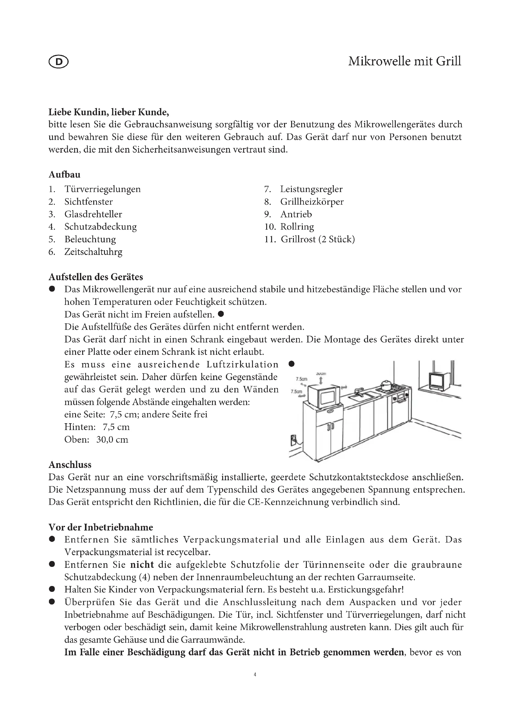 7Mikrowelle mit Grill Liebe Kundin, lieber Kunde, bitte lesen Sie die Gebrauchsanweisung sorgfältig vor der Benutzung des Mikrowellengerätes durch und bewahren Sie diese für den weiteren Gebrauch auf. Das Gerät darf nur von Personen benutzt werden, die mit den Sicherheitsanweisungen vertraut sind. Aufbau