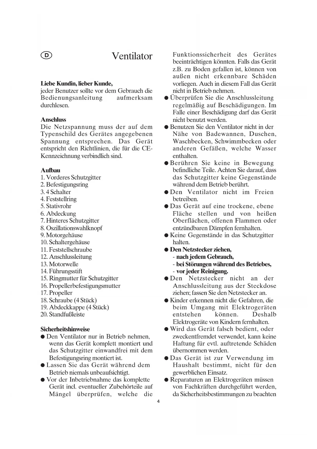 - Den Ventilator nur in Betrieb nehmen, wenn das Gerät komplett montiert und das Schutzgitter einwandfrei mit dem Befestigungsring montiert ist.