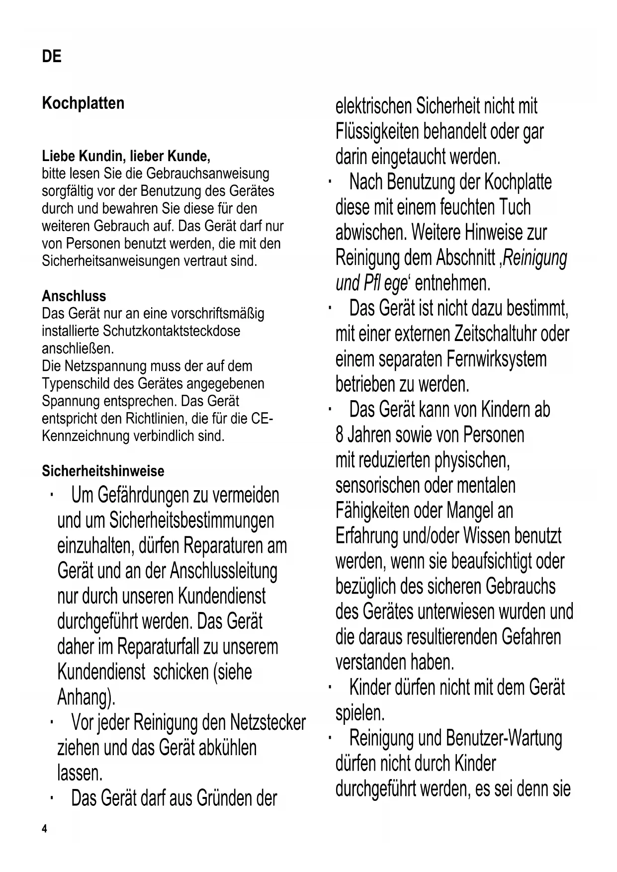 DE Gebrauchsanweisung GB Instructions for use FR Mode d’emploi NL Gebruiksaanwijzing ES Instrucciones de uso IT Manuale d’uso DK Brugsanvisning SE Bruksanvisning FI Käyttöohje PL Instrukcja obsługi GR Oδηγίες χρήσεως RU Руководство по эксплуатации Kochplatten 4 Electric table-top hot-plates 8 Plaques chauffantes électriques 11 Elektrische tafel warmhoudplaten 15 Placas eléctricas de mesa 18 Piano di cottura elettrico da tavolo 21 Elektrisk kogeplade 25 Elektrisk kokplatta av bordsmodell 28 Sähkölämpölevy 31 Elektryczna płyta grzewcza do gotowania i smażenia 34 Ηλεκτρικές επιτραπέζιες εστίες 38 Настольная электроплитка 42 www.severin.com welcome home2 Liebe Kundin, lieber Kunde, vielen Dank für Ihr Vertrauen. Wir freuen uns, dass Ihre Wahl auf ein SEVERIN Qualitätsprodukt gefallen ist und gratulieren Ihnen zu dieser Entscheidung. Die Marke SEVERIN steht seit über 115 Jahren für Beständigkeit, deutsche Qualität und Entwicklungskraft. Jedes Gerät der Marke SEVERIN wurde mit Sorgfalt geprüft und hergestellt. In den sieben Kategorien Kaffee, Frühstück, Küche, Grillen & Genießen, Haushalt, HairCare und Kühlen & Gefrieren bietet SEVERIN mit über 200 verschiedenen Produkten ein umfassendes Sortiment an Elektrokleingeräten an. Wir haben für jeden Anlass genau das richtige Produkt für Sie. Besuchen Sie uns auch im Internet unter www.severin.de oder www.severin.com. Viel Spaß mit Ihrem neuen Gerät. Ihre Geschäftsleitung und Mitarbeiter der SEVERIN Elektrogeräte GmbH34 Kochplatten Liebe Kundin, lieber Kunde, bitte lesen Sie die Gebrauchsanweisung sorgfältig vor der Benutzung des Gerätes durch und bewahren Sie diese für den weiteren Gebrauch auf. Das Gerät darf nur von Personen benutzt werden, die mit den Sicherheitsanweisungen vertraut sind. Anschluss Das Gerät nur an eine vorschriftsmäßig installierte Schutzkontaktsteckdose anschließen. Die Netzspannung muss der auf dem Typenschild des Gerätes angegebenen Spannung entsprechen. Das Gerät entspricht den Richtlinien, die für die CE- Kennzeichnung verbindlich sind. Sicherheitshinweise ∙ Um Gefährdungen zu vermeiden und um Sicherheitsbestimmungen einzuhalten, dürfen Reparaturen am Gerät und an der Anschlussleitung nur durch unseren Kundendienst durchgeführt werden. Das Gerät daher im Reparaturfall zu unserem Kundendienst schicken (siehe Anhang). ∙ Vor jeder Reinigung den Netzstecker ziehen und das Gerät abkühlen lassen. ∙ Das Gerät darf aus Gründen der elektrischen Sicherheit nicht mit Flüssigkeiten behandelt oder gar darin eingetaucht werden. ∙ Nach Benutzung der Kochplatte diese mit einem feuchten Tuch abwischen. Weitere Hinweise zur Reinigung dem Abschnitt ‚Reinigung und Pfl ege‘ entnehmen. ∙ Das Gerät ist nicht dazu bestimmt, mit einer externen Zeitschaltuhr oder einem separaten Fernwirksystem betrieben zu werden. ∙ Das Gerät kann von Kindern ab 8 Jahren sowie von Personen mit reduzierten physischen, sensorischen oder mentalen Fähigkeiten oder Mangel an Erfahrung und/oder Wissen benutzt werden, wenn sie beaufsichtigt oder bezüglich des sicheren Gebrauchs des Gerätes unterwiesen wurden und die daraus resultierenden Gefahren verstanden haben. ∙ Kinder dürfen nicht mit dem Gerät spielen. ∙ Reinigung und Benutzer-Wartung dürfen nicht durch Kinder durchgeführt werden, es sei denn sie DE5 sind 8 Jahre und älter und werden beaufsichtigt. ∙ Kinder jünger als 8 Jahre sind vom Gerät und der Anschlussleitung fernzuhalten. ∙ Kinder von Verpackungsmaterial fernhalten. Es besteht u.a. Erstickungsgefahr! ∙ Vor der Inbetriebnahme das komplette Gerät inkl. Anschlussleitung und eventueller Zubehörteile auf Mängel und Beschädigungen überprüfen, die die Funktionssicherheit des Gerätes beeinträchtigen könnten. Falls das Gerät z.B. zu Boden gefallen ist oder an der Anschlussleitung gezogen wurde, können von außen nicht erkennbare Schäden vorliegen. In diesen Fällen das Gerät nicht in Betrieb nehmen. ∙ Vorsicht! Heiße Oberfl ächen! Dieses Symbol weist darauf hin, dass während des Betriebes die Temperatur der berührbaren Oberfl ächen, insbesondere auf und rund um die Kochplatte, sehr hoch sein kann. Den Aufkleber mit diesem Symbol bitte nicht entfernen. ∙ Das Gerät niemals unbeaufsichtigt betreiben. ∙ Vorsicht! Speisen, besonders fett- und ölhaltige Speisen, können sich bei Überhitzung leicht entzünden. ∙ Das Gerät nicht in der Nähe oder unterhalb von Vorhängen, Hängeschränken oder anderen empfi ndlichen Materialien benutzen. ∙ Das Gerät nur frei auf einer Fläche benutzen, die nicht durch Spritzer, Wärme oder Wasserdampf beeinträchtigt wird. ∙ Bitte beachten, dass Luft frei unter dem Gerät zirkulieren kann. Zu Wänden etc. einen Abstand von ca. 10 cm einhalten. ∙ Die Lüftungsschlitze unterhalb des Gerätes dürfen nicht abgedeckt werden. ∙ Den Netzstecker ziehen, - nach jedem Gebrauch, - bei Störungen während des Betriebes, - vor jeder Reinigung. ∙ Den Netzstecker nicht an der Anschlussleitung aus der Steckdose ziehen; fassen Sie den Netzstecker an. ∙ Anschlussleitung nicht herunterhängen lassen. ∙ Die Anschlussleitung darf heiße Geräteteile nicht berühren. ∙ Wird das Gerät falsch bedient, oder zweckentfremdet verwendet, kann keine Haftung für evtl. auftretende Schäden übernommen werden. ∙ Das Gerät ist dazu bestimmt, im Haushalt und ähnlichen Anwendungen verwendet zu werden, wie z.B. - in Läden, Büros und anderen ähnlichen Arbeitsumgebungen, - in landwirtschaftlichen Betrieben, - von Kunden in Hotels, Motels und weiteren typischen Wohnumgebungen, - in Frühstückspensionen. Vor der ersten Inbetriebnahme Vor der ersten Inbetriebnahme das Gerät bei ausreichender Lüftung auf der stärksten Stufe einschalten und ca. 3 Minuten ohne Topf aufheizen lassen. Die hierbei auftretende Rauchentwicklung ist ohne Bedeutung. Für