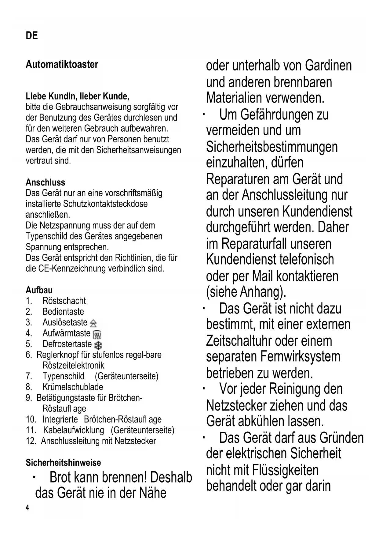 Sicherheitshinweise ∙ Brot kann brennen! Deshalb das Gerät nie in der Nähe oder unterhalb von Gardinen und anderen brennbaren Materialien verwenden. ∙ Um Gefährdungen zu vermeiden und um Sicherheitsbestimmungen einzuhalten, dürfen Reparaturen am Gerät und an der Anschlussleitung nur durch unseren Kundendienst durchgeführt werden. Daher im Reparaturfall unseren Kundendienst telefonisch oder per Mail kontaktieren (siehe Anhang). ∙ Das Gerät ist nicht dazu bestimmt, mit einer externen Zeitschaltuhr oder einem separaten Fernwirksystem betrieben zu werden. ∙ Vor jeder Reinigung den Netzstecker ziehen und das Gerät abkühlen lassen. ∙ Das Gerät darf aus Gründen der elektrischen Sicherheit nicht mit Flüssigkeiten behandelt oder gar darin DE5 eingetaucht werden. ∙ Zur Reinigung des Gehäuses dieses nur außen mit einem leicht angefeuchteten Tuch abwischen. ∙ Zum Entfernen der Brotkrümel aus der Krümelschublade diese seitlich herausziehen. Dann Schublade wieder einsetzen. ∙ Das Gerät ist dazu bestimmt, im Haushalt und ähnlichen Anwendungen verwendet zu werden, wie z.B. - von Mitarbeitern in Läden, Büros und ähnlichen Arbeitsumgebungen, - in landwirtschaftlichen Betrieben, - von Kunden in Hotels, Motels und weiteren typischen Wohnumgebungen, - in Frühstückspensionen. ∙ Das Gerät kann von Kindern ab 8 Jahren sowie von Personen mit reduzierten physischen, sensorischen oder mentalen Fähigkeiten oder Mangel an Erfahrung und/oder Wissen benutzt werden, wenn sie beaufsichtigt oder bezüglich des sicheren Gebrauchs des Gerätes unterwiesen wurden und die daraus resultierenden Gefahren verstanden haben. ∙ Kinder dürfen nicht mit dem Gerät spielen. ∙ Reinigung und Benutzer- Wartung dürfen nicht durch Kinder durchgeführt werden, es sei denn sie sind 8 Jahre und älter und werden beaufsichtigt. ∙ Kinder jünger als 8 Jahre sind vom Gerät und der Anschlussleitung fernzuhalten. ∙ Kinder von Verpackungsmaterial fernhalten. Es besteht u.a. Erstickungsgefahr! ∙ Das Gerät auf eine wärmebeständige6 ebene Fläche stellen. ∙ Das Gerät nicht auf heißen Oberfl ächen (z.B. Herdplatten o.ä.) oder in der Nähe von offenen Gasfl ammen abstellen oder benutzen, damit das Gehäuse nicht beschädigt wird. ∙ Achtung! Während des Betriebes kann die Temperatur der berührbaren Oberfl äche sehr hoch sein. Verbrennungsgefahr! ∙ Vor der Inbetriebnahme das komplette Gerät inkl. Anschlussleitung und eventueller Zubehörteile auf Mängel und Beschädigungen überprüfen, die die Funktionssicherheit des Gerätes beeinträchtigen könnten. Falls das Gerät z.B. zu Boden gefallen ist oder an der Anschlussleitung gezogen wurde, können von außen nicht erkennbare Schäden vorliegen. In diesen Fällen das Gerät nicht in Betrieb nehmen. ∙ Die Anschlussleitung darf heiße Geräteteile nicht berühren. ∙ Die Anschlussleitung nicht herunterhängen lassen. ∙ Das Gerät niemals ohne Aufsicht betreiben. ∙ Bei Betrieb des Gerätes den Röstschacht niemals abdecken. ∙ Nicht mit Fingern oder Gegenständen (z.B. Gabel, Messer o.ä.) in den Röstschacht hineingelangen, da die Heizelemente spannungsführend sind. ∙ Den Netzstecker des Gerätes ziehen, - nach jedem Gebrauch - bei Störungen während des Betriebes, - vor jeder Reinigung des Gerätes. ∙ Den Netzstecker nicht an der Anschlussleitung aus der Steckdose ziehen, sondern den Netzstecker anfassen. ∙ Wird das Gerät falsch bedient, oder zweckentfremdet verwendet, kann keine Haftung für evtl. auftretende Schäden übernommen werden. Bedienung Allgemeine Hinweise ∙ Achtung: Die Bedientaste rastet nur bei angeschlossener Zuleitung ein! ∙ Nicht zu dicke oder zu große Scheiben verwenden, da sich diese leicht verklemmen können. Es können Brotscheiben bis maximal 14 mm Dicke getoastet werden. ∙ Bei Störungen und beim Reinigen erst den Netzstecker aus der Steckdose ziehen! ∙ Verklemmte Brotscheiben mit einem stumpfen Holzstab (z.B. Pinselstiel) lösen. Dabei die Heizkörper nicht berühren. Vor der ersten Inbetriebnahme ∙ Toaster reinigen (siehe „Reinigung und Pfl ege“). ∙ Den Toaster ohne Toastbrot mindestens fünfmal bei maximaler Einstellung des Reglerknopfes betreiben. ∙ Zwischen den einzelnen Aus- und Einschaltvorgängen den Toaster abkühlen lassen. ∙ Beim ersten Gebrauch kann ein leichter Geruch entstehen (geringe Rauchentwicklung möglich). Dieser verliert sich jedoch nach kurzer Zeit. Für ausreichende Lüftung durch geöffnete Fenster und Balkontüren sorgen.7 Automatische Abschaltung Das Gerät ist mit einer automatischen Abschaltung ausgestattet. Das Gerät wird abgeschaltet, wenn nach Beendigung des Toastvorgangs eine Toastscheibe blockiert und nicht nach oben transportiert werden kann. Dann den Netzstecker ziehen und die Toastscheibe wie unter „Allgemeine Hinweise“ beschrieben entfernen. Einstellung des Bräunungsgrades Der gewünschte Bräunungsgrad kann stufenlos am Reglerknopf eingestellt werden. Hell: Reglerknopf nach links drehen. Dunkel: Reglerknopf nach rechts drehen. Wir empfehlen eine Einstellung des Bräunungsgrades für Toastbrot auf Position