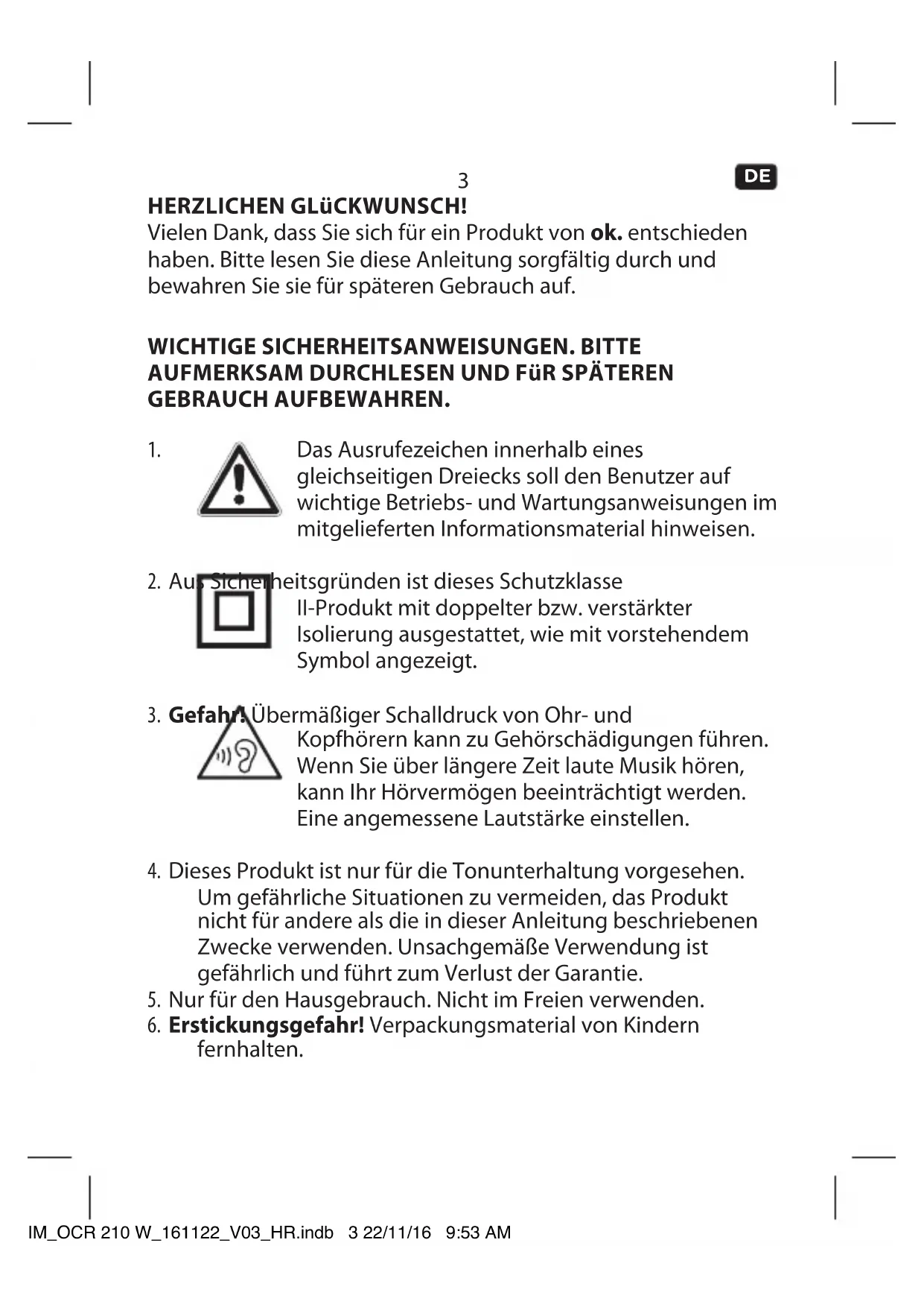 HERZLICHEN GLüCKWUNSCH! Vielen Dank, dass Sie sich für ein Produkt von ok. entschieden haben. Bitte lesen Sie diese Anleitung sorgfältig durch und bewahren Sie sie für späteren Gebrauch auf.