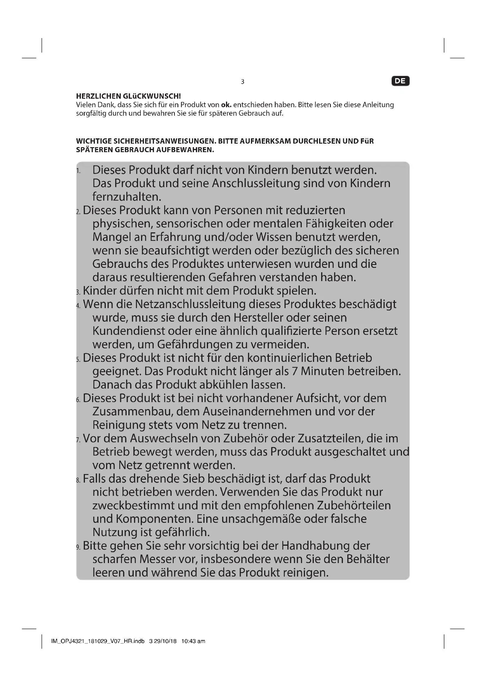 - Bewahren Sie das Gerät an einem kühlen, trockenen Platz auf, der für Kinder und Haustiere unzugänglich ist. IM_OPJ4321_181029_V07_HR.indb 7 29/10/18 10:43 am8 Size = A5