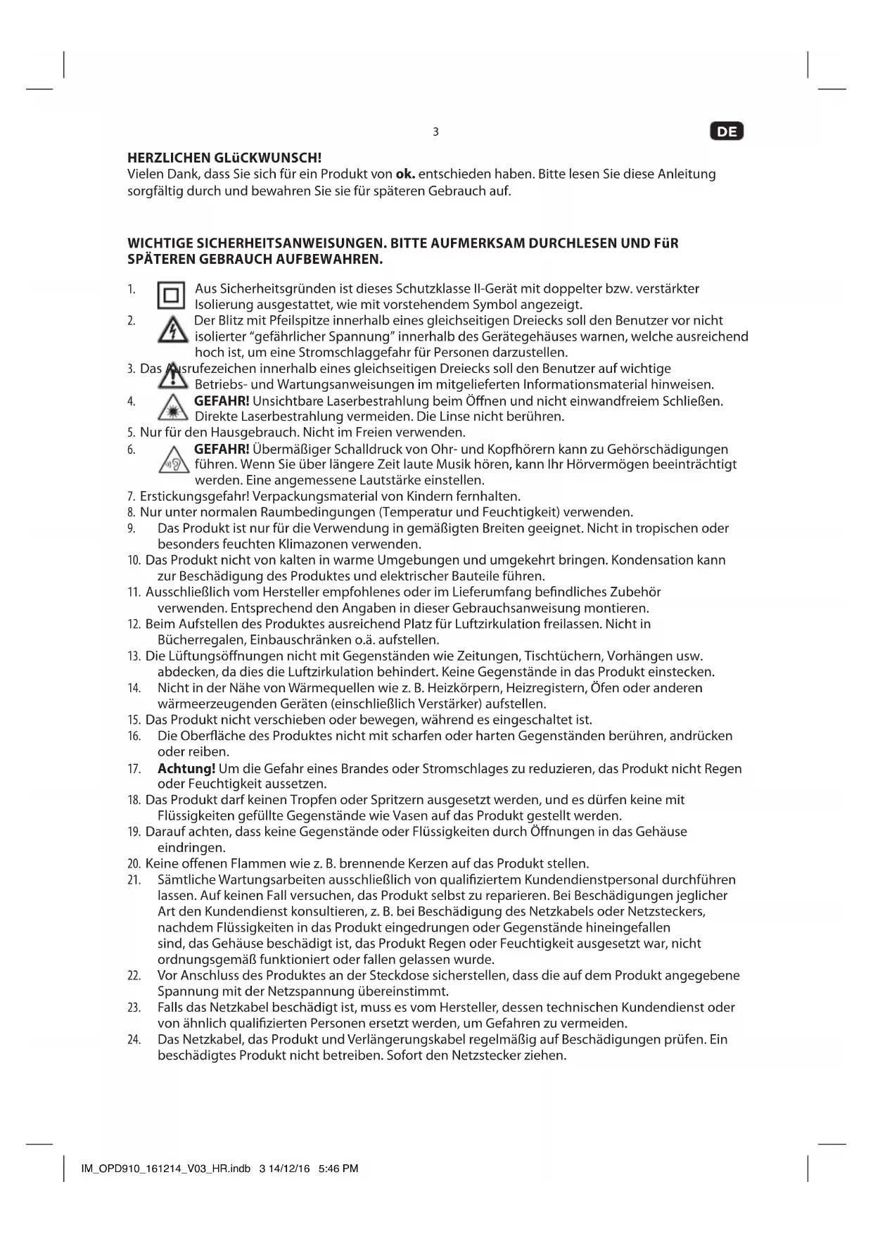 HERZLICHEN GLüCKWUNSCH! Vielen Dank, dass Sie sich für ein Produkt von ok. entschieden haben. Bitte lesen Sie diese Anleitung sorgfältig durch und bewahren Sie sie für späteren Gebrauch auf. WICHTIGE SICHERHEITSANWEISUNGEN. BITTE AUFMERKSAM DURCHLESEN UND FüR SPÄTEREN GEBRAUCH AUFBEWAHREN.