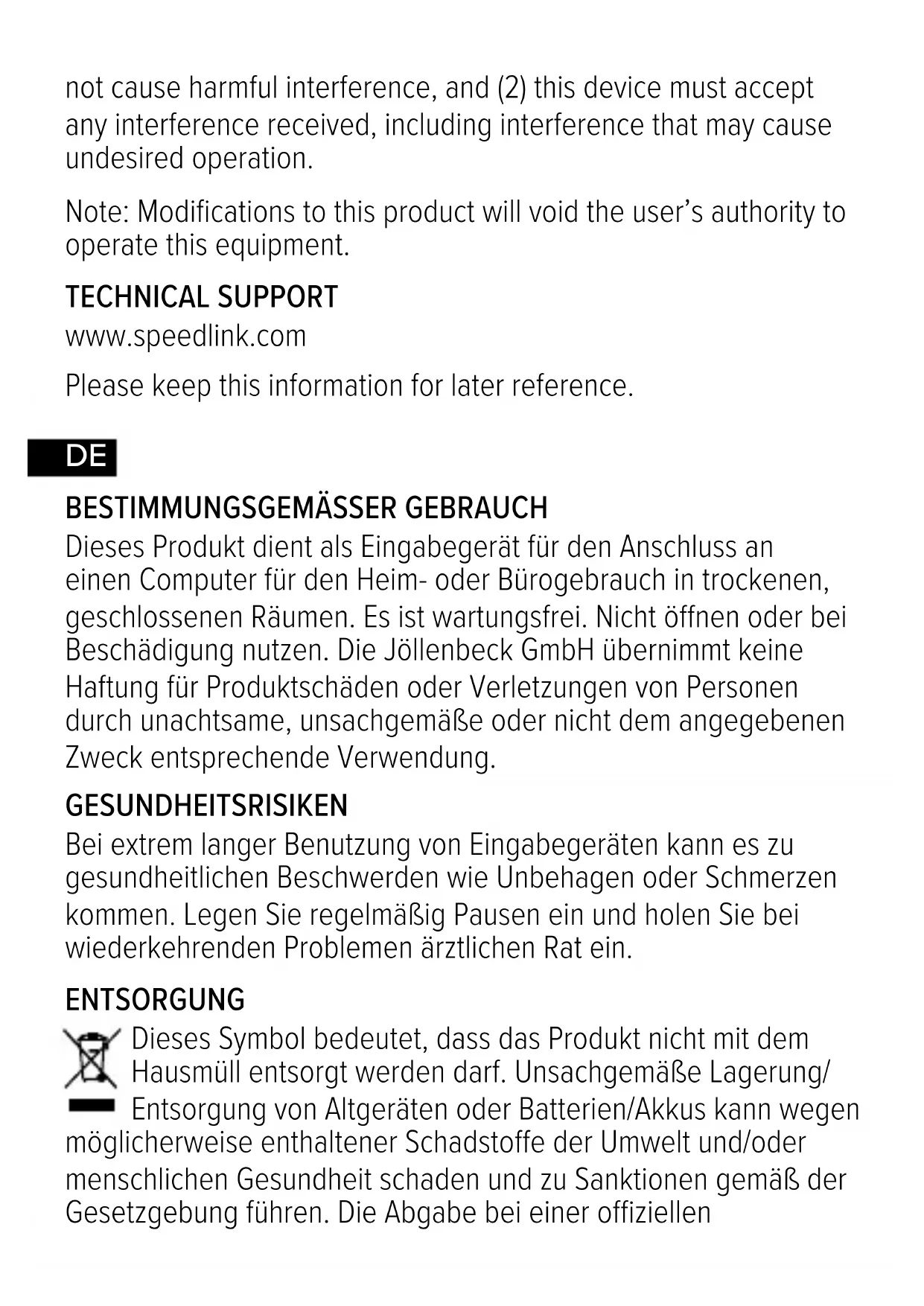 Sammelstelle ist kostenlos und gesetzlich vorgeschrieben, stellt die korrekte Entsorgung oder Verwertung/ Wiederverwendung sicher und leistet einen Beitrag zum Umweltschutz. Auskunft erteilen Behörden, Wertstohöfe oder Fachgeschäfte. Große Händler (Elektrogeräte- Verkaufsfläche ≥ 400 m²) nehmen Kleingeräte (alle Maße < 25 cm) kostenlos an, andere nur bei Kauf gleichwertiger Produkte. Batterien/Akkus möglichst entnehmen. KONFORMITÄTSHINWEIS Unter Einwirkung von starken statischen, elektrischen oder hochfrequenten Feldern (Funkanlagen, Mobiltelefonen, Mikrowellen-Entladungen) kann es zu Funktionsbeeinträchtigungen des Gerätes (der Geräte) kommen. Versuchen Sie in diesem Fall, die Distanz zu den störenden Geräten zu vergrößern. TECHNISCHER SUPPORT www.speedlink.com Bitte bewahren Sie diese Information zur künftigen Verwendung auf.