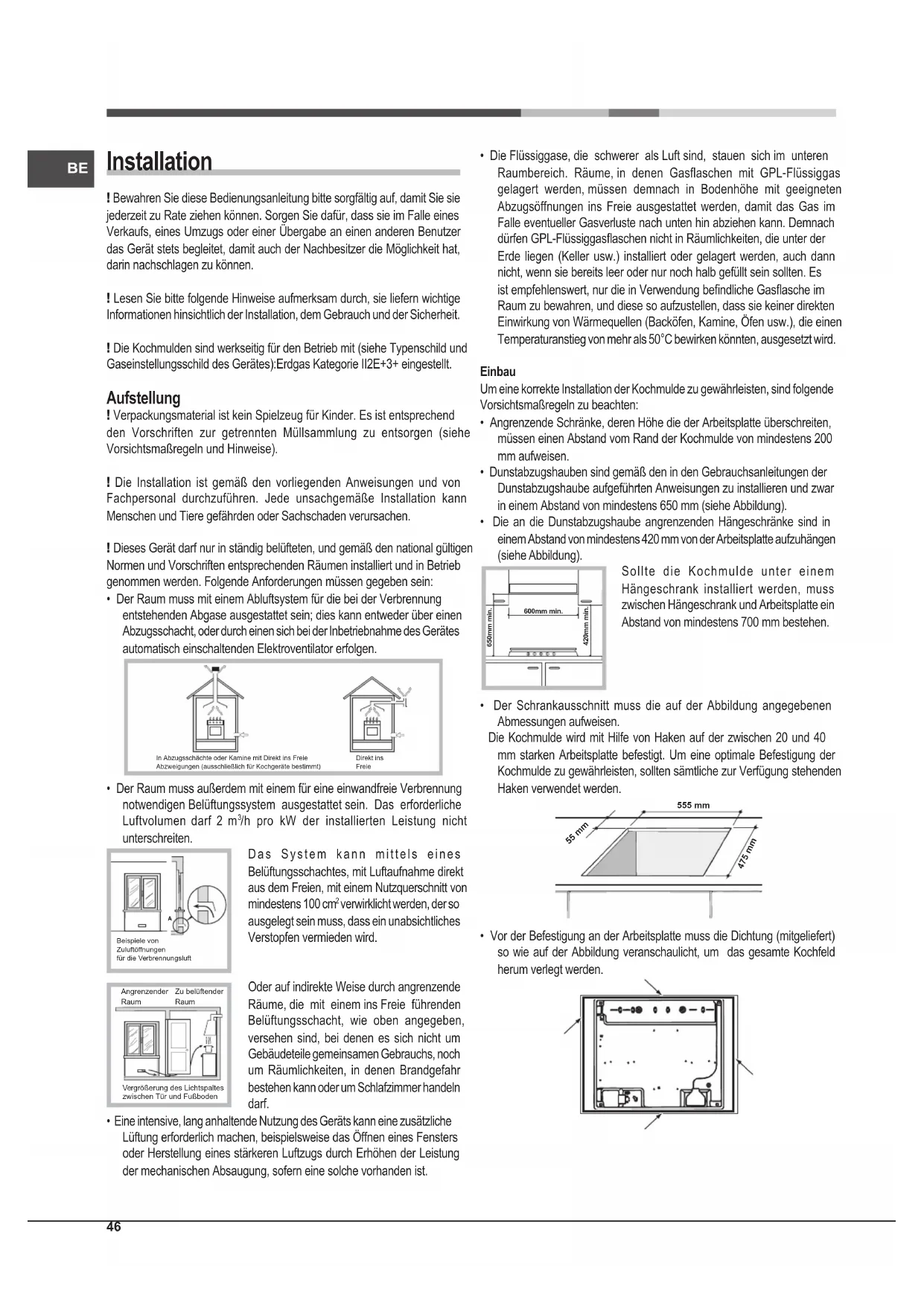 Installation ! Bewahren Sie diese Bedienungsanleitung bitte sorgfältig auf, damit Sie sie jederzeit zu Rate ziehen können. Sorgen Sie dafür, dass sie im Falle eines Verkaufs, eines Umzugs oder einer Übergabe an einen anderen Benutzer das Gerät stets begleitet, damit auch der Nachbesitzer die Möglichkeit hat, darin nachschlagen zu können. ! Lesen Sie bitte folgende Hinweise aufmerksam durch, sie liefern wichtige Informationen hinsichtlich der Installation, dem Gebrauch und der Sicherheit. ! Die Kochmulden sind werkseitig für den Betrieb mit (siehe Typenschild und Gaseinstellungsschild des Gerätes):Erdgas Kategorie II2E+3+ eingestellt. Aufstellung ! Verpackungsmaterial ist kein Spielzeug für Kinder. Es ist entsprechend den Vorschriften zur getrennten Müllsammlung zu entsorgen (siehe Vorsichtsmaßregeln und Hinweise). ! Die Installation ist gemäß den vorliegenden Anweisungen und von Fachpersonal durchzuführen. Jede unsachgemäße Installation kann Menschen und Tiere gefährden oder Sachschaden verursachen. ! Dieses Gerät darf nur in ständig belüfteten, und gemäß den national gültigen Normen und Vorschriften entsprechenden Räumen installiert und in Betrieb genommen werden. Folgende Anforderungen müssen gegeben sein: