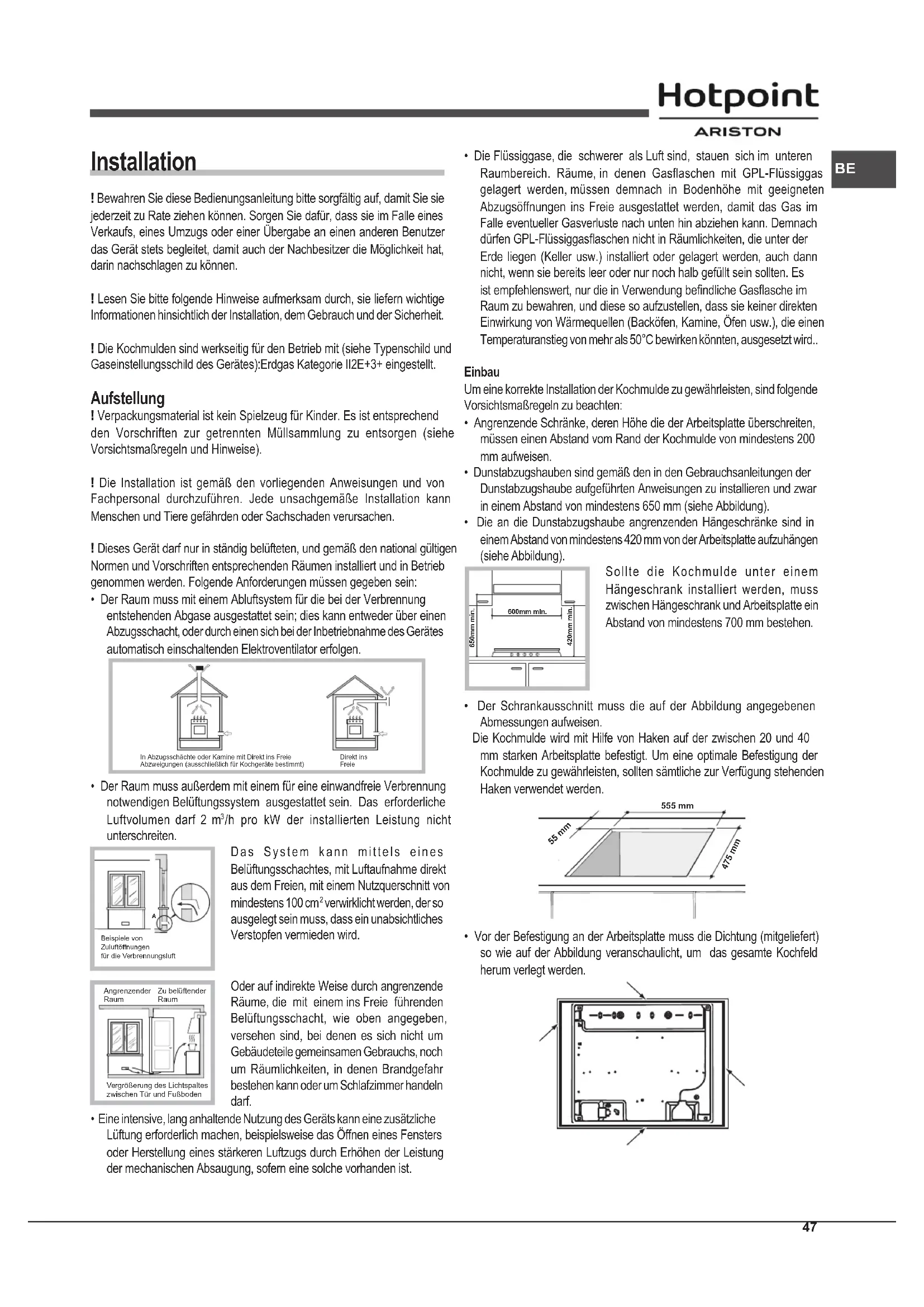Installation ! Bewahren Sie diese Bedienungsanleitung bitte sorgfältig auf, damit Sie sie jederzeit zu Rate ziehen können. Sorgen Sie dafür, dass sie im Falle eines Verkaufs, eines Umzugs oder einer Übergabe an einen anderen Benutzer das Gerät stets begleitet, damit auch der Nachbesitzer die Möglichkeit hat, darin nachschlagen zu können. ! Lesen Sie bitte folgende Hinweise aufmerksam durch, sie liefern wichtige Informationen hinsichtlich der Installation, dem Gebrauch und der Sicherheit. ! Die Kochmulden sind werkseitig für den Betrieb mit (siehe Typenschild und Gaseinstellungsschild des Gerätes):Erdgas Kategorie II2E+3+ eingestellt. Aufstellung ! Verpackungsmaterial ist kein Spielzeug für Kinder. Es ist entsprechend den Vorschriften zur getrennten Müllsammlung zu entsorgen (siehe Vorsichtsmaßregeln und Hinweise). ! Die Installation ist gemäß den vorliegenden Anweisungen und von Fachpersonal durchzuführen. Jede unsachgemäße Installation kann Menschen und Tiere gefährden oder Sachschaden verursachen. ! Dieses Gerät darf nur in ständig belüfteten, und gemäß den national gültigen Normen und Vorschriften entsprechenden Räumen installiert und in Betrieb genommen werden. Folgende Anforderungen müssen gegeben sein: