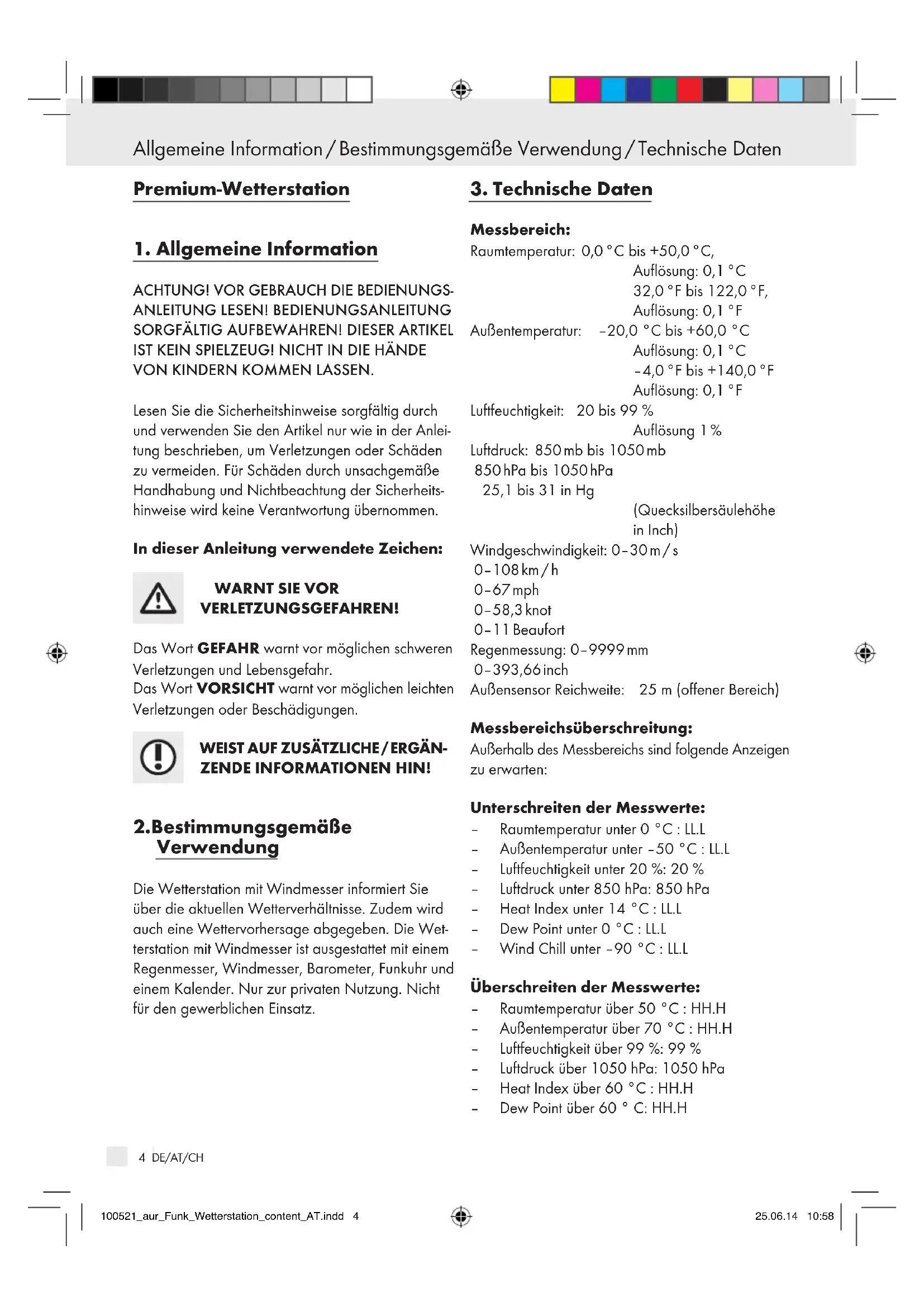 GEFAHR FÜR KINDER! J Das Verschlucken von Batterien ist lebensgefähr- lich. Batterien und Wetterstation müssen außer Reichweite von Kleinkindern aufbewahrt werden. Bei Verschlucken der Batterie ist umgehend ein Arzt aufzusuchen. GEFAHR VOR VERLETZUNGEN! J Leere Batterie bitte aus dem Gerät entfernen. J Anschlusspole auf keinen Fall kurzschließen. J Dieses Gerät kann von Kindern ab 8Jahren und darüber sowie von Personen mit verringerten physischen, sensorischen oder mentalen Fähig- keiten oder Mangel an Erfahrung und Wissen benutzt werden, wenn sie beaufsichtigt oder bezüglich des sicheren Gebrauchs des Gerätes unterwiesen wurden und die daraus resultie- renden Gefahren verstehen. Kinder dürfen nicht mit dem Gerät spielen. Reinigung und Benutzer- wartung dürfen nicht von Kindern ohne Beauf- sichtigung durchgeführt werden. VORSICHT – SACHSCHÄDEN! J Ausschließlich den angegebenen Batterietyp verwenden. J Auf die richtige Polarität achten. J Die Batterien regelmäßig auf Auslaufen über- prüfen. J Bei längerer Nichtbenutzung Batterien aus dem Gerät nehmen. J Tauchen Sie die Wetterstation und den Außen- sensor nie in Wasser oder andere Flüssigkeiten. J Beachten Sie die Hinweise zur Reinigung und Aufbewahrung dieser Anleitung. 100521_aur_Funk_Wetterstation_content_AT.indd 5 25.06.14 10:586 DE/AT/CH Lieferumfang / Begriffserklärungen