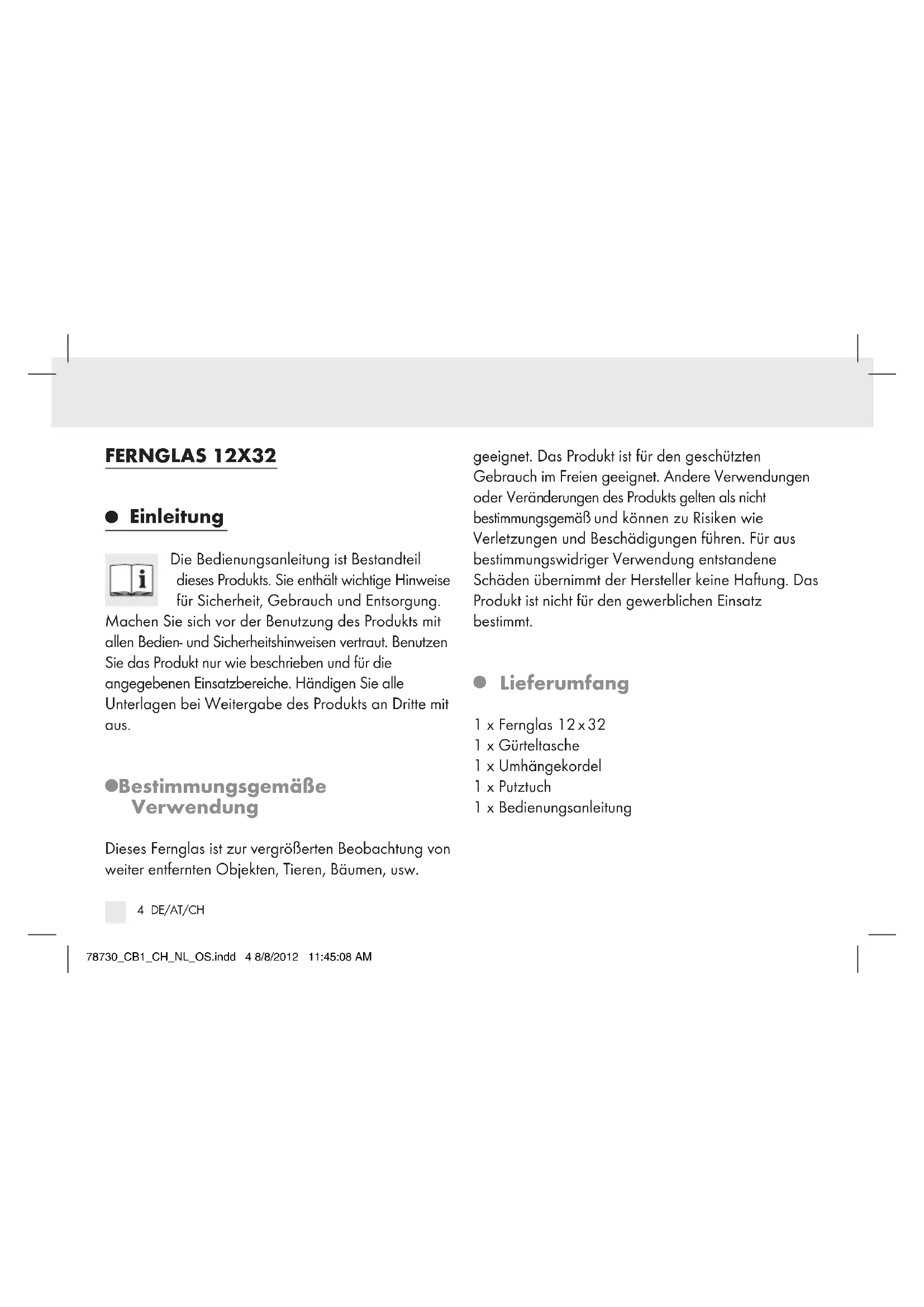 Lieferumfang 1 x Fernglas 12 x 32 1 x Gürteltasche 1 x Umhängekordel 1 x Putztuch 1 x Bedienungsanleitung 78730_CB1_CH_NL_OS.indd 4 8/8/2012 11:45:08 AM5 DE/AT/CH