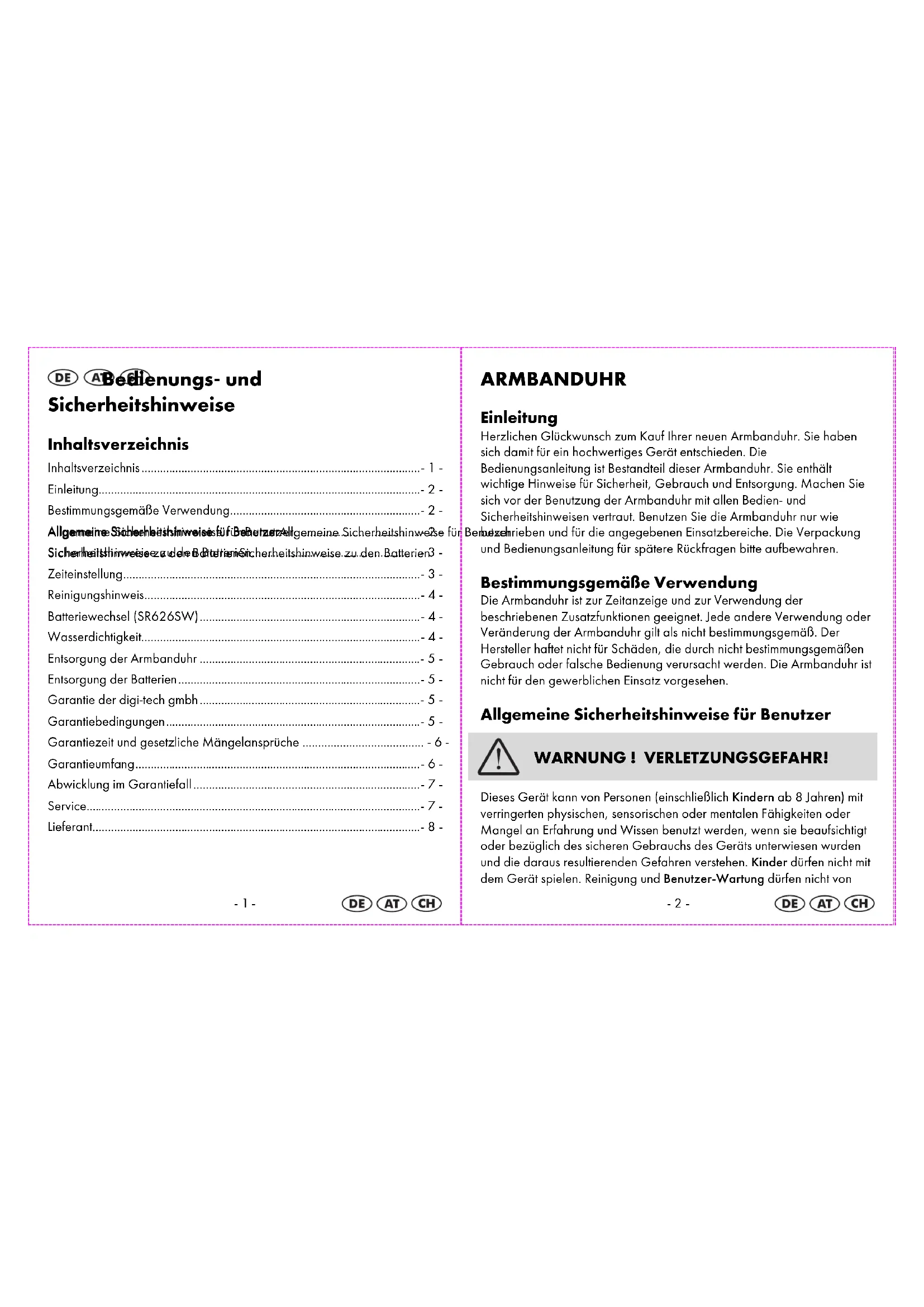 Entsorgung der Armbanduhr Diese Armbanduhr darf nicht im normalen Hausmüll entsorgt werden. Entsorgen Sie die Armbanduhr über einen zugelassenen Entsorgungsbetrieb oder über Ihre kommunale Entsorgungseinrichtung. Beachten Sie die aktuell geltenden Vorschriften. Setzen Sie sich im Zweifelsfall mit Ihrer Entsorgungseinrichtung in Verbindung. Entsorgung der Batterien Bitte entsorgen Sie Ihre Batterien sachgerecht in extra hierfür aufgestellten Gefäßen im Handel. Batterien gehören nicht in den Hausmüll. Entsorgen Sie Batterien bitte über einen zugelassenen Entsorgungsbetrieb oder über Ihre kommunale Entsorgungseinrichtung. Beachten Sie die aktuell geltenden Vorschriften. Setzen Sie sich im Zweifelsfall mit Ihrer Entsorgungseinrichtung in Verbindung. Garantie der digi-tech gmbh Sie erhalten auf diese Armbanduhr 3 Jahre Garantie ab Kaufdatum. Im Falle von Mängeln dieser Armbanduhr stehen Ihnen gegen den Verkäufer des Produkts gesetzliche Rechte zu. Diese gesetzlichen Rechte werden durch unsere im Folgenden dargestellte Garantie nicht eingeschränkt. Garantiebedingungen Die Garantiefrist beginnt mit dem Kaufdatum. Bitte bewahren Sie den originalen Kassenbon gut auf. Diese Unterlage wird als Nachweis für den Kauf benötigt. Tritt innerhalb von drei Jahren ab dem Kaufdatum dieser Armbanduhr ein Material- oder Fabrikationsfehler auf, wird die Armbanduhr von uns – nach unserer Wahl – für Sie kostenlos repariert oder ersetzt. Diese Garantieleistung setzt voraus, dass innerhalb der Drei- Jahres-Frist die defekte Armbanduhr und der Kaufbeleg (Kassenbon) vorgelegt und schriftlich kurz beschrieben wird, worin der Mangel besteht und wann er aufgetreten ist. Wenn der Defekt von unserer Garantie