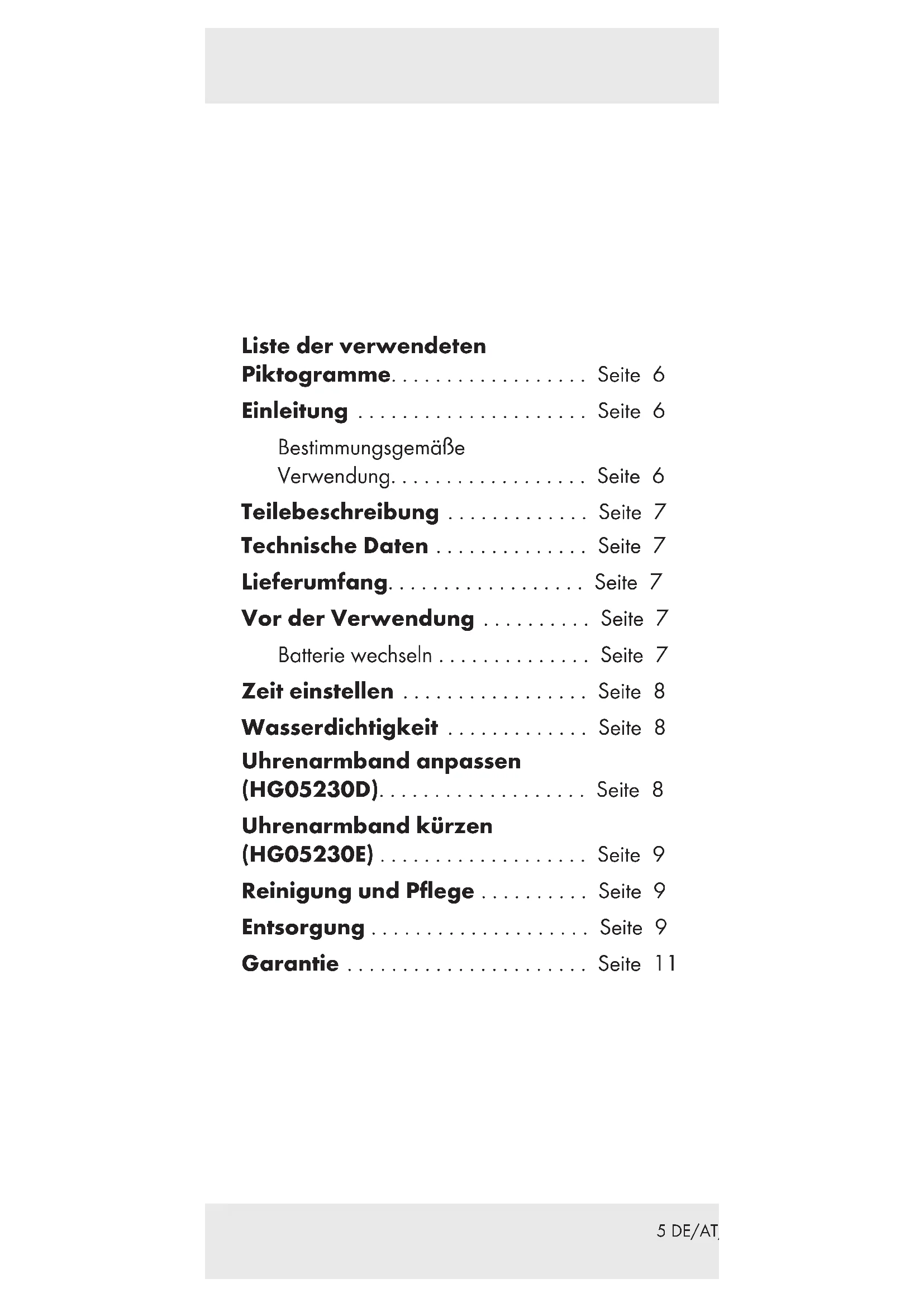 85 DE/AT/CH Liste der verwendeten Piktogramme.................. Seite 6 Einleitung ..................... Seite 6 Bestimmungsgemäße Verwendung.................. Seite 6 Teilebeschreibung ............. Seite 7 Technische Daten .............. Seite 7 Lieferumfang.................. Seite 7 Vor der Verwendung .......... Seite 7 Batterie wechseln .............. Seite 7 Zeit einstellen ................. Seite 8 Wasserdichtigkeit ............. Seite 8 Uhrenarmband anpassen (HG05230D)................... Seite 8 Uhrenarmband kürzen (HG05230E) ................... Seite 9 Reinigung und Pflege .......... Seite 9 Entsorgung .................... Seite 9 Garantie ...................... Seite 116 DE/AT/CH Liste der verwendeten Piktogramme Gleichstrom Geeignet für Benutzung bei Regen, zum Hände waschen, bei Wasserspritzern Geeignet für Benutzung bei Duschen, Spülen, Baden Geeignet für Benutzung beim Schwimmen, Schnorcheln Geeignet für Benutzung beim Windsurfen, Tauchen ARMBANDUHR SLIMLINE Einleitung Wir beglückwünschen Sie zum Kauf Ihres neuen Produkts. Sie haben sich damit für ein hochwertiges Produkt entschieden. Die Bedienungsanleitung ist Teil dieses Produkts. Sie enthält wichtige Hinweise für Sicherheit, Gebrauch und Entsorgung. Machen Sie sich vor der Benutzung des Produkts mit allen Bedien- und Sicherheitshinweisen vertraut. Benutzen Sie das Produkt nur wie beschrieben und für die angegebenen Einsatzbereiche. Händigen Sie alle Unterlagen bei Weitergabe des Produkts an Dritte mit aus. Bestimmungsgemäße Verwendung Dieses Produkt darf nur privat und nicht für gewerbliche Zwecke verwendet werden.7 DE/AT/CH Teilebeschreibung