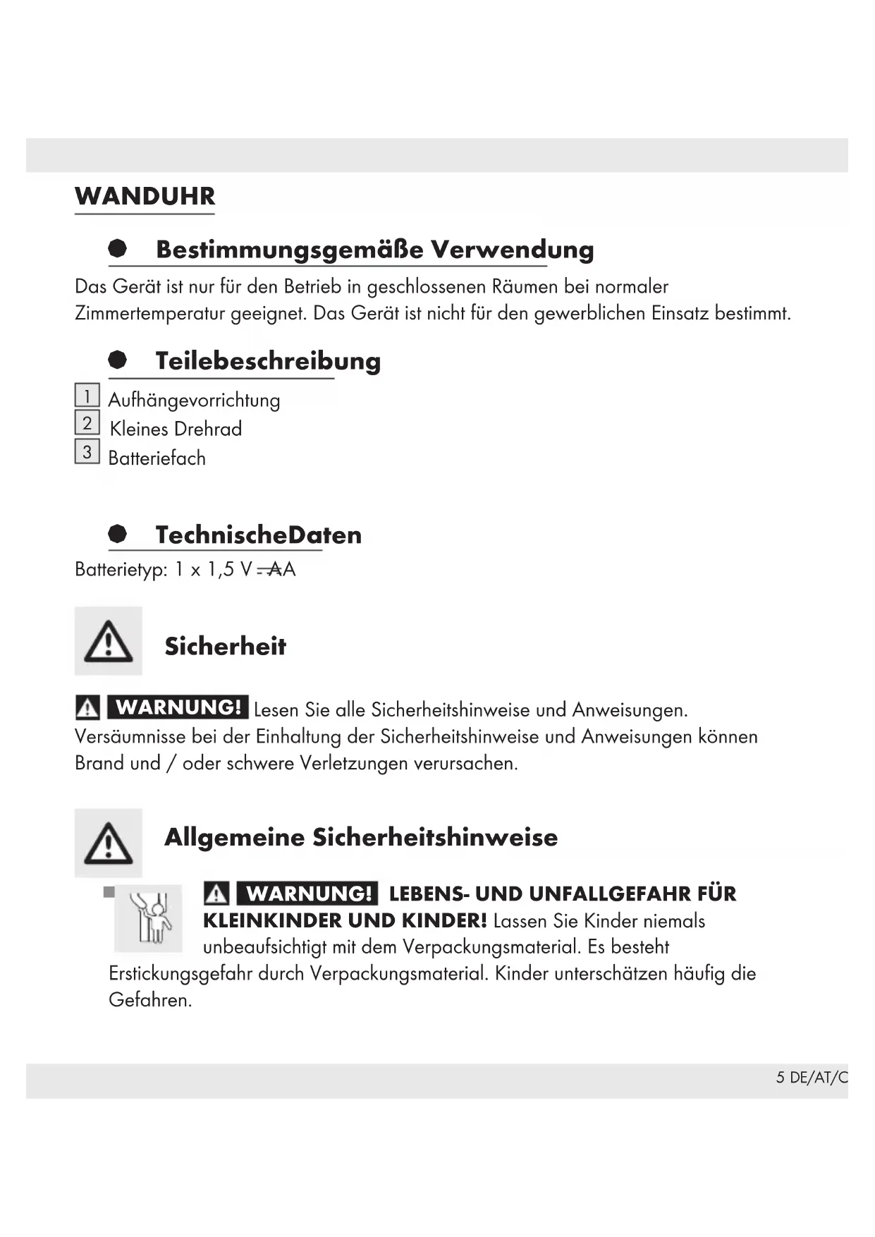 HG00161A HG00161B HG00161C HG00161D HG00161E5 DE/AT/CH WANDUHR § Bestimmungsgemäße Verwendung Das Gerät ist nur für den Betrieb in geschlossenen Räumen bei normaler Zimmertemperatur geeignet. Das Gerät ist nicht für den gewerblichen Einsatz bestimmt. § Teilebeschreibung