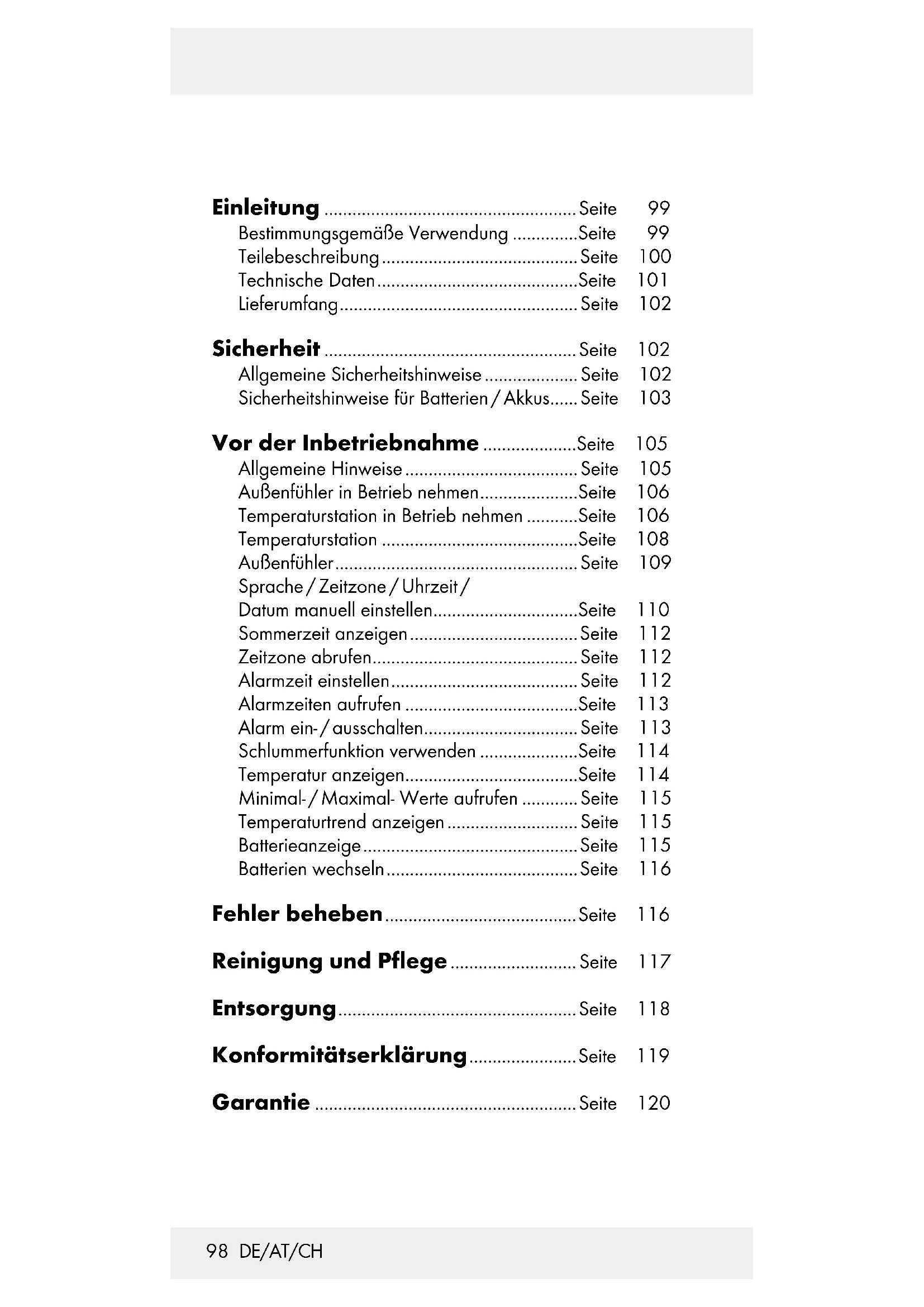 Entfernen Sie die verbrauchten Batterien. Setzen Sie je zwei neue 1, 5 V (Gleich- strom) Batterien (AA) in die Batteriefächer ein. Hinweis: Achten Sie auf die korrekte Polarität. Diese wird in den Batteriefächern angezeigt (siehe auch Abb. B + D). Schließen Sie die Batteriefächer. Fehler beheben Hinweis: Das Produkt enthält elektronische Bauteile. Daher ist es möglich, dass es durch Funkübertragungsgeräte in unmittelbarer Nähe gestört wird. Entfernen Sie solche Geräte aus der Reichweite der Temperaturstation / des Außenfühlers, oder entnehmen Sie kurz- zeitig die Batterien aus der Temperatur- station / dem Außenfühler, wenn das Display Störungen anzeigt. Hindernisse wie z. B. Betonwände können auch dazu führen, dass der Empfang empfindlich gestört wird. Verändern Sie in diesem Fall den Standort (z. B. in die Nähe eines Fensters). Beachten Sie unbedingt, dass der Außenfüh- ler immer im Umkreis von max. 30 Meter (Freifeld) von der Temperaturstation aufge- stellt werden sollte. Die angegebene117 DE/AT/CH Reichweite ist die Freifeldreichweite und be- deutet, dass kein Hindernis zwischen dem Au- ßenfühler und der Temperaturstation stehen sollte. Ein „Sichtkontakt“ zwischen Außenfüh- ler und Temperaturstation verbessert oftmals die Übertragung. Kälte (Außentemperaturen unter 0 °C) kann die Batterieleistung des Außenfühlers und da durch die Funkübertragung ebenfalls negativ beein- trächtigen. Ein weiterer Faktor, der zu Empfangsstörungen führen kann, sind leere oder zu schwache Batterien des Außenfühlers. Tauschen Sie diese gegen neue aus. Wenn die Temperaturstation nicht richtig arbei- tet, entfernen Sie die Batterien für einen kurzen Moment und setzen Sie sie anschließend er- neut ein. Reinigung und Pflege Reinigen Sie das Produkt nur äußerlich mit einem weichen, trockenen Tuch. Spritzen Sie den Außenfühler in keinem Fall, z. B. mit einem Gartenschlauch, ab. Der Außenfühler ist gegen Spritzwasser aus allen Richtungen geschützt.118 DE/AT/CH Entsorgung Die Verpackung besteht aus um- weltfreundlichen Materialien, die Sie über die örtlichen Recyclingstel- len entsorgen können. Der Grüne Punkt gilt nicht für Deutschland.