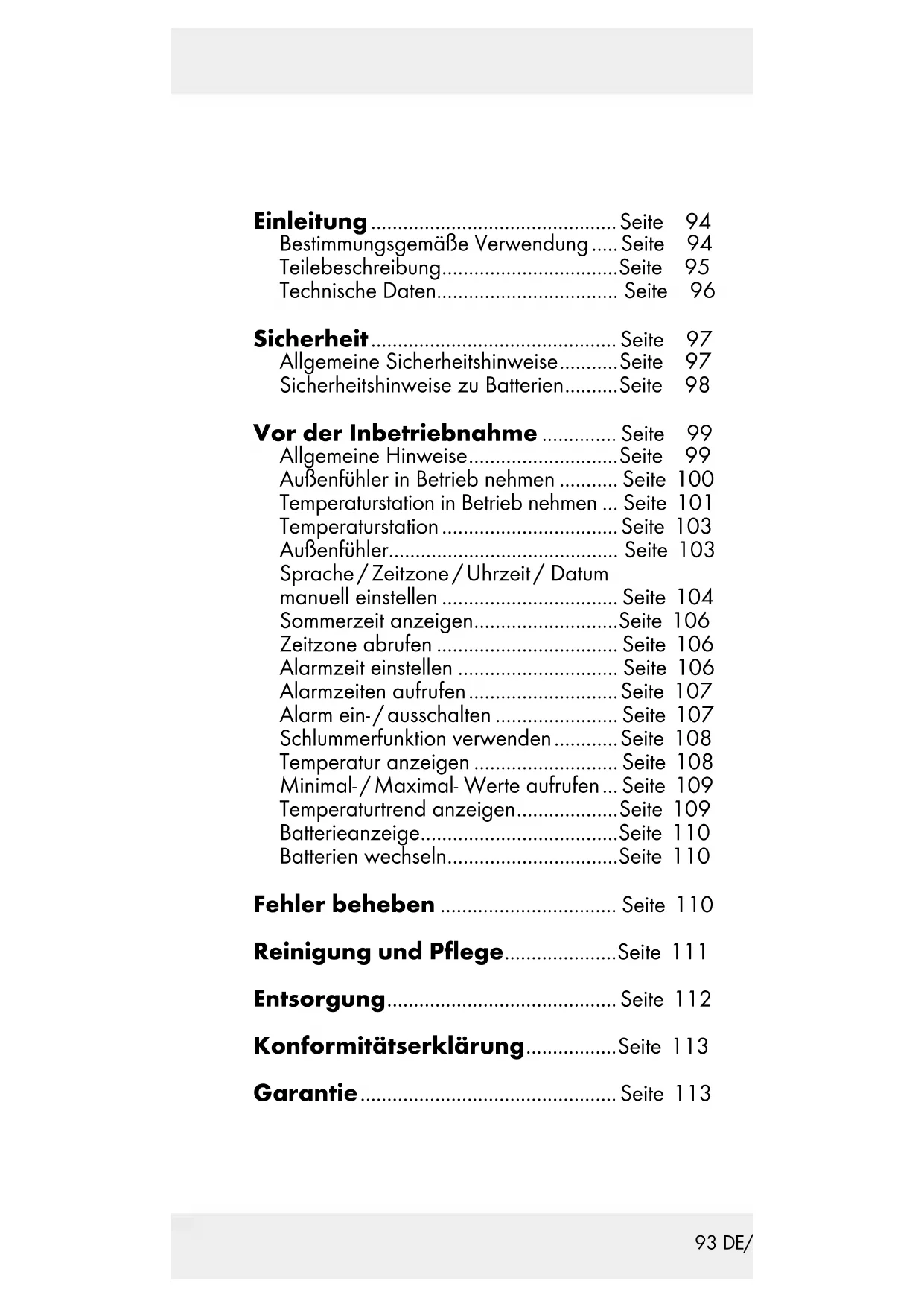 cu’s of dergelijke onderdelen, die gemaakt zijn van glas.93 DE/AT/CH Einleitung .............................................. Seite 94 Bestimmungsgemäße Verwendung ..... Seite 94 Teilebeschreibung ................................. Seite 95 Technische Daten.................................. Seite 96 Sicherheit .............................................. Seite 97 Allgemeine Sicherheitshinweise ........... Seite 97 Sicherheitshinweise zu Batterien .......... Seite 98 Vor der Inbetriebnahme .............. Seite 99 Allgemeine Hinweise ............................ Seite 99 Außenfühler in Betrieb nehmen ........... Seite 100 Temperaturstation in Betrieb nehmen ... Seite 101 Temperaturstation ................................. Seite 103 Außenfühler........................................... Seite 103 Sprache / Zeitzone / Uhrzeit / Datum manuell einstellen ................................. Seite 104 Sommerzeit anzeigen ........................... Seite 106 Zeitzone abrufen .................................. Seite 106 Alarmzeit einstellen .............................. Seite 106 Alarmzeiten aufrufen ............................ Seite 107 Alarm ein- / ausschalten ....................... Seite 107 Schlummerfunktion verwenden ............ Seite 108 Temperatur anzeigen ........................... Seite 108 Minimal- / Maximal- Werte aufrufen ... Seite 109 Temperaturtrend anzeigen ................... Seite 109 Batterieanzeige ..................................... Seite 110 Batterien wechseln ................................ Seite 110 Fehler beheben ................................. Seite 110 Reinigung und Pflege ..................... Seite 111 Entsorgung ........................................... Seite 112 Konformitätserklärung ................. Seite 113 Garantie ................................................ Seite 11394 DE/AT/CH Temperaturstation Einleitung Wir beglückwünschen Sie zum Kauf Ihres neuen Gerätes. Sie haben sich damit für ein hochwertiges Produkt entschieden. Die Bedie- nungsanleitung ist Teil dieses Produkts. Sie enthält wichtige Hinweise für Sicherheit, Ge- brauch und Entsorgung. Machen Sie sich vor der Benutzung des Produkts mit allen Bedien- und Sicherheitshinw eisen vertraut. Benutzen Sie das Produkt nur wie beschrieben und für die angegebenen Einsatzbereiche. Händigen Sie alle Unterlagen bei Weitergabe des Pro- dukts an Dritte mit aus. Bestimmungsgemäße Verwendung Die Temperaturstation zeigt die Innen- und Außentemperatur in Celsius (°C) oder Fah- renheit (°F) sowie deren Maximal- und Mini- malwerte an. Weitere Anzeigewerte der Temperaturstation sind die Zeit im 12- / 24- Stundenformat sowie das Datum. Des Weiteren verfügt die Temperaturstation über eine Alarm- funktion. Das Gerät ist nicht für den gewerbli- chen Einsatz bestimmt.95 DE/AT/CH Teilebeschreibung LC-Display