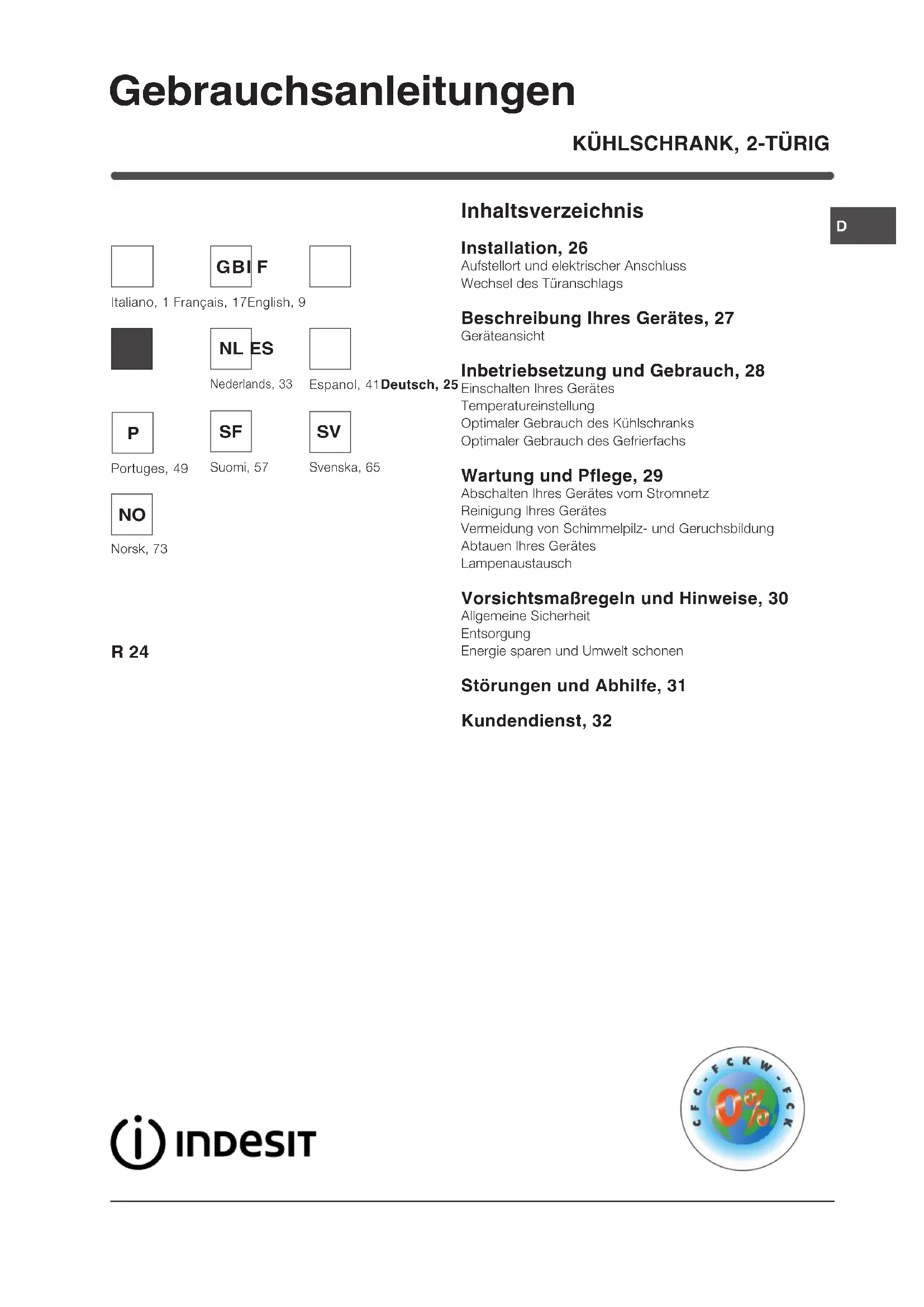 R 24 (EU) (0) - Kühlschrank INDESIT - Kostenlose Bedienungsanleitung