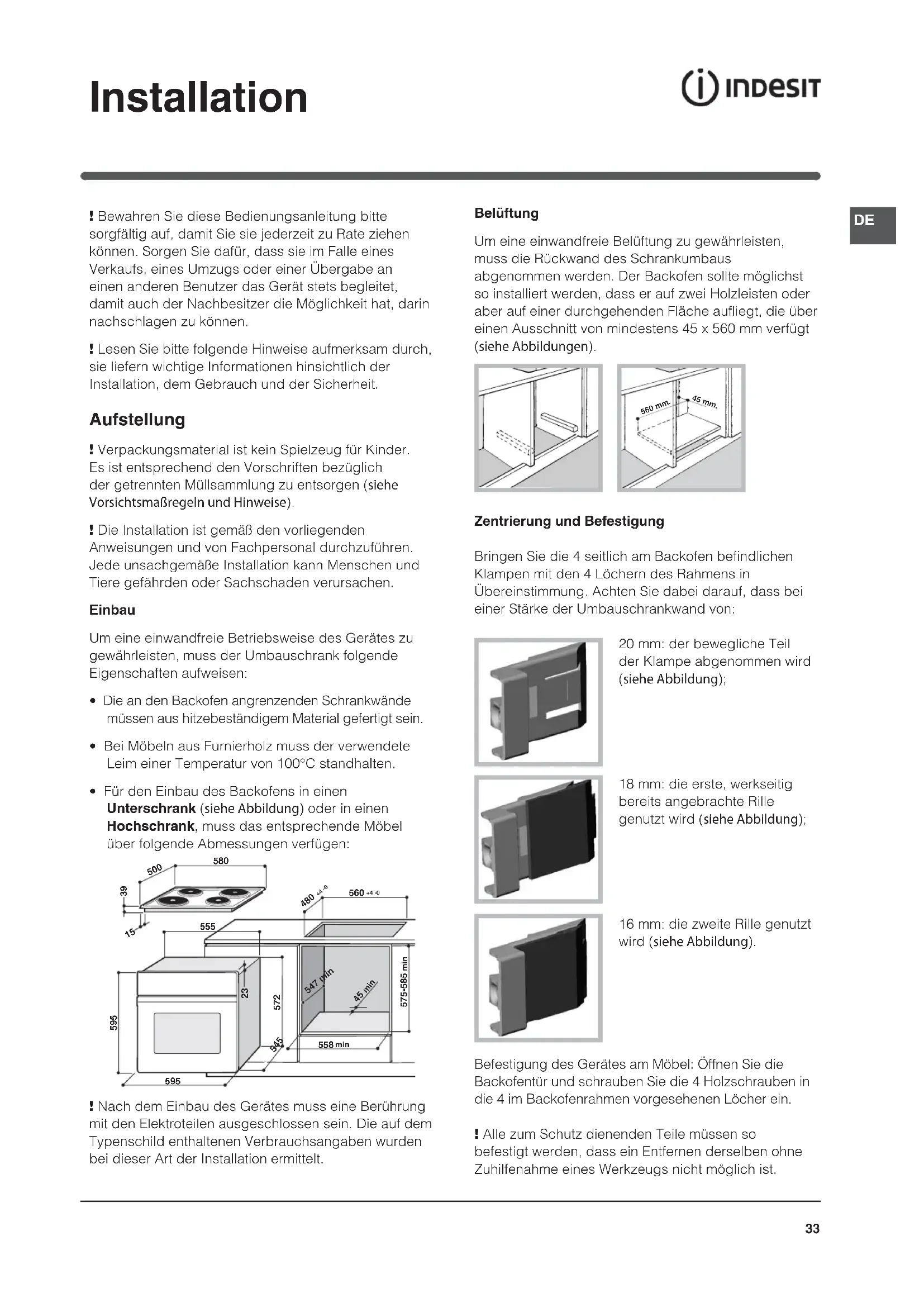 - Für den Einbau des Backofens in einen Unterschrank (siehe Abbildung) oder in einen Hochschrank, muss das entsprechende Möbel über folgende Abmessungen verfügen: ! Nach dem Einbau des Gerätes muss eine Berührung mit den Elektroteilen ausgeschlossen sein. Die auf dem Typenschild enthaltenen Verbrauchsangaben wurden bei dieser Art der Installation ermittelt. Belüftung Um eine einwandfreie Belüftung zu gewährleisten, muss die Rückwand des Schrankumbaus abgenommen werden. Der Backofen sollte möglichst so installiert werden, dass er auf zwei Holzleisten oder aber auf einer durchgehenden Fläche aufliegt, die über einen Ausschnitt von mindestens 45 x 560 mm verfügt (siehe Abbildungen). Zentrierung und Befestigung Bringen Sie die 4 seitlich am Backofen befindlichen Klampen mit den 4 Löchern des Rahmens in Übereinstimmung. Achten Sie dabei darauf, dass bei einer Stärke der Umbauschrankwand von: 20 mm: der bewegliche Teil der Klampe abgenommen wird (siehe Abbildung); 18 mm: die erste, werkseitig bereits angebrachte Rille genutzt wird (siehe Abbildung); 16 mm: die zweite Rille genutzt wird (siehe Abbildung). Befestigung des Gerätes am Möbel: Öffnen Sie die Backofentür und schrauben Sie die 4 Holzschrauben in die 4 im Backofenrahmen vorgesehenen Löcher ein. ! Alle zum Schutz dienenden Teile müssen so befestigt werden, dass ein Entfernen derselben ohne Zuhilfenahme eines Werkzeugs nicht möglich ist.