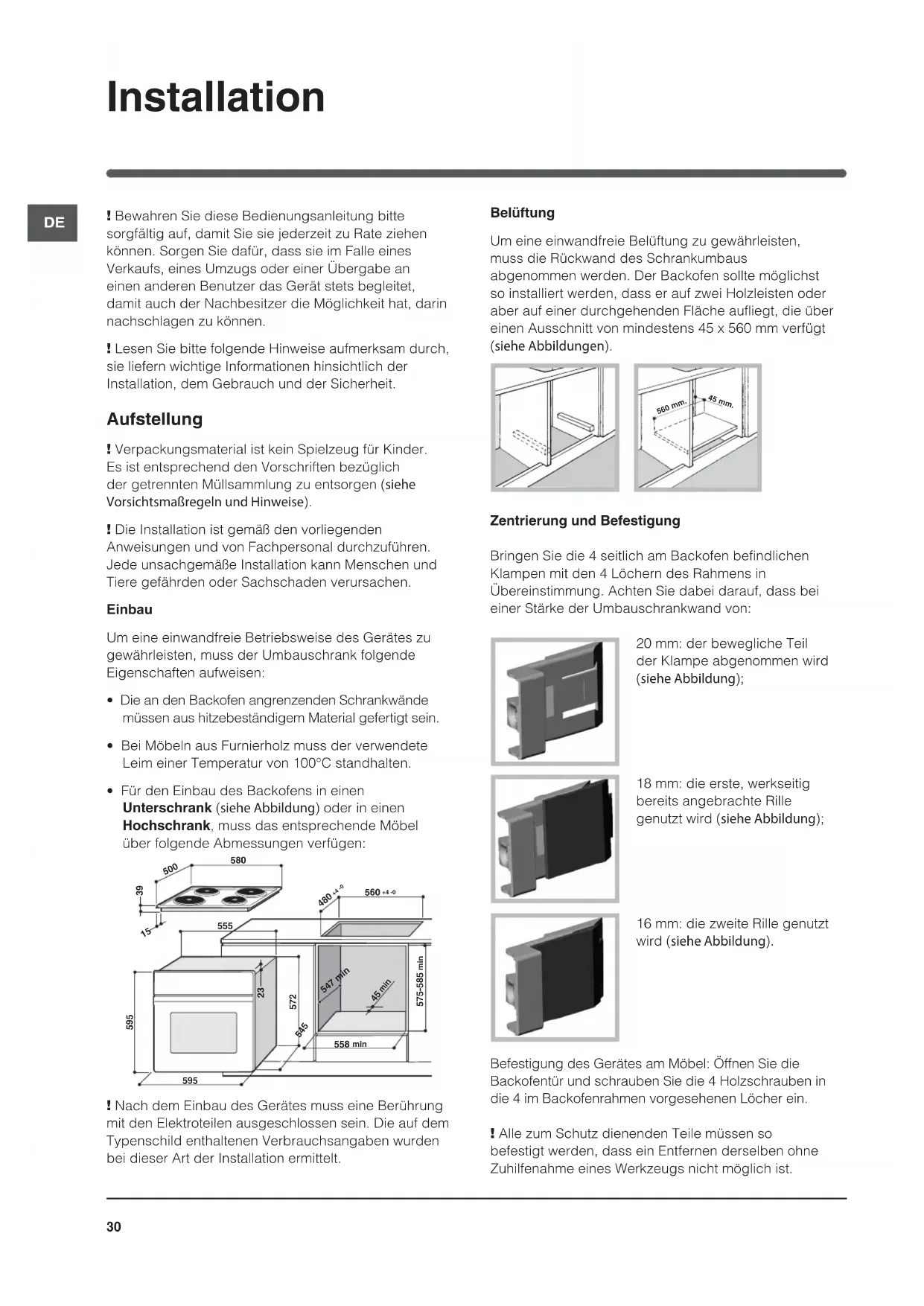 - Für den Einbau des Backofens in einen Unterschrank (siehe Abbildung) oder in einen Hochschrank, muss das entsprechende Möbel über folgende Abmessungen verfügen: ! Nach dem Einbau des Gerätes muss eine Berührung mit den Elektroteilen ausgeschlossen sein. Die auf dem Typenschild enthaltenen Verbrauchsangaben wurden bei dieser Art der Installation ermittelt. Belüftung Um eine einwandfreie Belüftung zu gewährleisten, muss die Rückwand des Schrankumbaus abgenommen werden. Der Backofen sollte möglichst so installiert werden, dass er auf zwei Holzleisten oder aber auf einer durchgehenden Fläche aufliegt, die über einen Ausschnitt von mindestens 45 x 560 mm verfügt (siehe Abbildungen). Zentrierung und Befestigung Bringen Sie die 4 seitlich am Backofen befindlichen Klampen mit den 4 Löchern des Rahmens in Übereinstimmung. Achten Sie dabei darauf, dass bei einer Stärke der Umbauschrankwand von: 20 mm: der bewegliche Teil der Klampe abgenommen wird (siehe Abbildung); 18 mm: die erste, werkseitig bereits angebrachte Rille genutzt wird (siehe Abbildung); 16 mm: die zweite Rille genutzt wird (siehe Abbildung). Befestigung des Gerätes am Möbel: Öffnen Sie die Backofentür und schrauben Sie die 4 Holzschrauben in die 4 im Backofenrahmen vorgesehenen Löcher ein. ! Alle zum Schutz dienenden Teile müssen so befestigt werden, dass ein Entfernen derselben ohne Zuhilfenahme eines Werkzeugs nicht möglich ist.