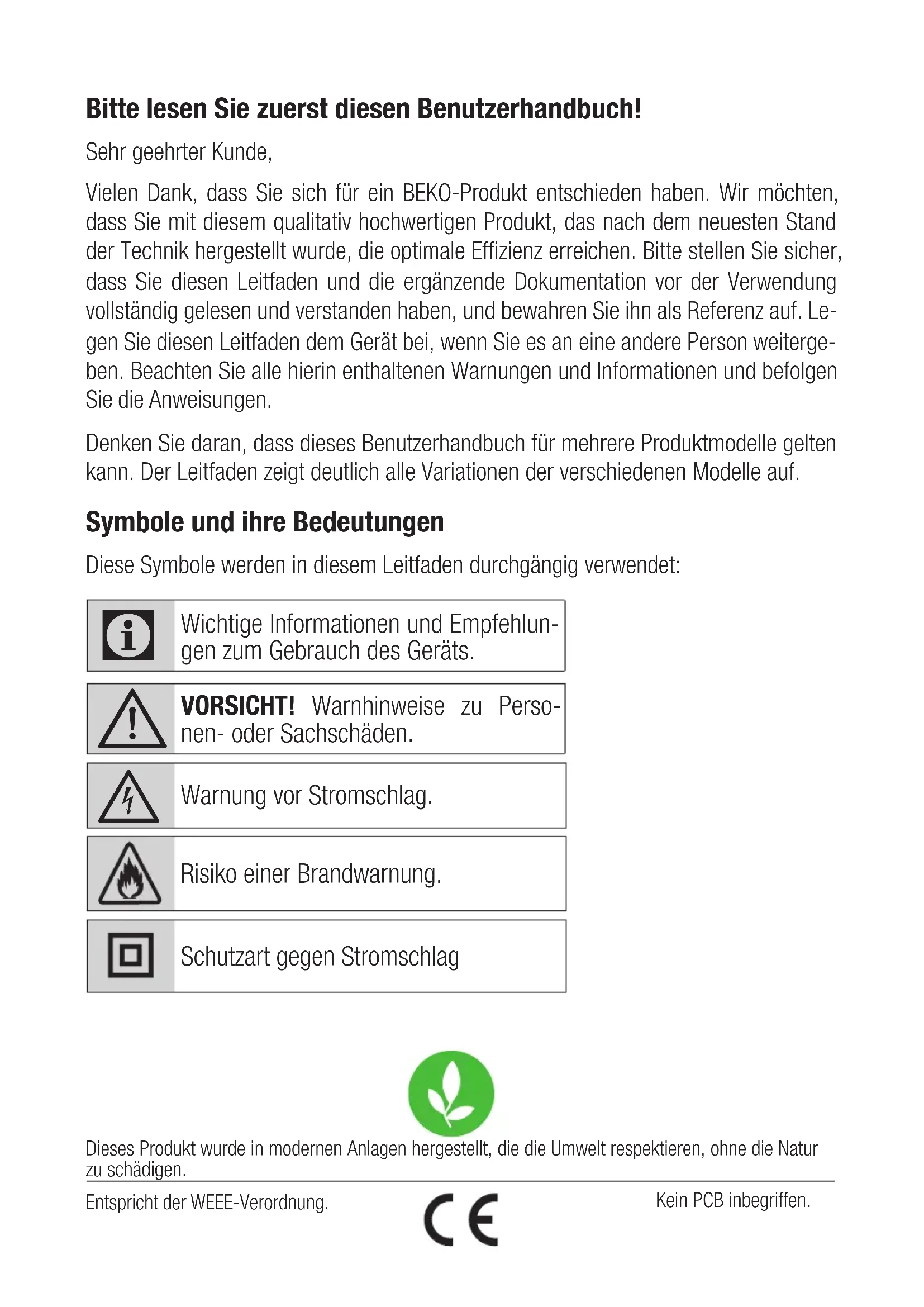 Auf Seite 235 finden Sie die Installationsanleitung. Für die Installation der Abzugshaube wenden Sie sich bitte an den nächstgelegenen autori-sierten Service.Es liegt in der Verantwortung des Kunden, den Standort und die elektrische Installation der Abzugshaube vorzubereiten.(Abbildung 6)Dunstabzugshaube / Benutzerhandbuch 59 / DE Fehlerbehebung Ursache Hilfe Das Gerät funktioniert nicht. Überprüfen Sie Ihre Sicherungen. Die Sicherung kann durchbren- nen, inspiziert und wiederher- gestellt werden. Das Gerät funktioniert nicht. Überprüfen Sie die elektrische Verbin- dung. Die Netzspannung muss zwi- schen 220 und 240 V liegen. Das Gerät funktioniert nicht. Überprüfen Sie die elektrische Verbin- dung. Überprüfen Sie, ob andere Geräte in Ihrer Küche funktio- nieren. Das Beleuchtungslicht funktioniert nicht. Überprüfen Sie die elektrische Verbin- dung. Die Netzspannung muss zwi- schen 220 und 240 V liegen. Das Beleuchtungslicht funktioniert nicht. Prüfen Sie den Lampenschalter. Der Lampenschalter muss sich in der Stellung "Ein" befinden. Das Beleuchtungslicht funktioniert nicht. Inspizieren Sie die Lampen. Die Lampen des Geräts müs- sen aufleuchten. Der Lufteinlass des Geräts ist unzurei- chend. Prüfen Sie den Aluminiumfilter. Unter normalen Betriebsbe- dingungen ist der Aluminium- Ölfilter mindestens einmal im Monat zu reinigen. Der Lufteinlass des Geräts ist unzurei- chend. Überprüfen Sie den Abluftkanal Der Abluftkanal muss sich in der Stellung "Ein" befinden. Der Lufteinlass des Geräts ist unzurei- chend. Überprüfen Sie den Kohlefilter. Die Filter der Geräte mit Kohlefiltern sind unter norma- len Bedingungen einmal alle 3 Monate zu ersetzen. 6 FehlerbehebungSensitivity: Public Anschrift: Beko Deutschland GmbH Thomas-Edison-Platz 3 D-63263 Neu-Isenburg Kundendienst-Tel.: 06102-86 86 891 Fax: 01805-414 400 * E-Mail: Kundendienst@beko.com Ersatzteile-Tel.: 01805-242 515 * Fax: 01805-345 001* E-Mail: ersatzteile@beko.com Sehr geehrte Kundin, sehr geehrter Kunde, wir gratulieren Ihnen zum neuen Gerät der Marke Beko und wünschen Ihnen viel Freude daran. Sollten Sie dennoch einmal einen Grund zu einer Reklamation erkennen, dann wenden Sie sich bitte an unseren Kundendienst. Geben Sie im Falle einer Störung Ihre genaue Anschrift, Telefonnummer und den GERÄTETYP (vom Typenschild des Gerätes) an. Hinweis für Kühl- und Gefriergeräte, Achtung! Um voll funktionsfähig zu sein, benötigt Ihr Gerät nach dem Transport ca. 24 Stunden, in denen sich das Kühlmittel stabilisiert. Sofern es nicht vermeidbar ist und Sie das Gerät sofort nach Aufstellung mit Gefriergut bestücken wollen, müssen Sie damit rechnen, dass die rote Lampe bis zur Stabilisierung des Kühlkreislaufs aufleuchtet. Die Kühlleistung beginnt jedoch vom Augenblick des Anschlusses an sich auf zu bauen. Die Garantiezeit beträgt 24 Monate ab Kaufdatum. Bedingungen: Dieses Gerät wurde nach den modernsten Methoden hergestellt und geprüft. Der Hersteller leistet unabhängig von der gesetzlichen Gewährleistungsverpflichtung des Verkäufers / Händlers für die Dauer von 24 Monaten, gerechnet vom Tag des Kaufes, Garantie für einwandfreies Material und fehlerfreie Fertigung. Der Garantieanspruch erlischt bei Eingriffen durch den Käufer oder durch Dritte, die vom Hersteller nicht für den Service autorisiert sind oder wenn das Gerät zu gewerblichen Zwecken eingesetzt wird. Schäden die durch unsachgemäße Behandlung oder Bedienung, durch falsches Aufstellen oder Aufbewahren, durch unsachgemäßen Anschluss, oder fehlerhafte Installationen sowie durch höhere Gewalt oder sonstige äußere Einflüsse entstehen, fallen nicht unter die Gewährleistung. Abhilfemöglichkeiten: Wir behalten uns vor, bei Reklamationen die defekten Teile auszubessern oder zu ersetzen oder das Gerät auszutauschen. Ausgetauschte Teile oder ausgetauschte Geräte gehen in unser Eigentum über. Nur wenn durch Nachbesserung(en) oder Umtausch des Gerätes die herstellerseitig vorgesehene Nutzung endgültig nicht zu erreichen sein sollte, kann der Käufer aus Gewährleistung innerhalb von 24 Monaten, gerechnet vom Tag des Kaufes, Herabsetzung des Kaufpreises oder Aufhebung des Kaufvertrages verlangen. Nachbesserungen verlängern nicht die Gewährleistungszeit. Schadenersatzansprüche, auch hinsichtlich Folgeschäden, sind, soweit sie nicht auf Vorsatz oder grober Fahrlässigkeit beruhen, ausgeschlossen. Bei unnötiger oder unberechtigter Beanspruchung des Kundendienstes berechnet dieser Zeit- und Wegeentgelt. Reklamationen sind unmittelbar nach Feststellung zu melden. Der Garantieanspruch ist vom Käufer, durch Vorlage der Kaufquittung, nachzuweisen. Bei Nicht-vorlage ist die Reparatur kostenpflichtig. Eine Rückerstattung – nach späterer Einsendung der Kaufquittung – kann nur innerhalb von einem Monat nach Rechnungsdatum gewährt werden. Diese Garantiezusage ist gültig innerhalb der Bundesrepublik Deutschland *) 0,14 EUR/Min. aus dem Festnetz der T-Com; Mobilfunk max. 0,42 EUR/Min. (nur für Deutschland)