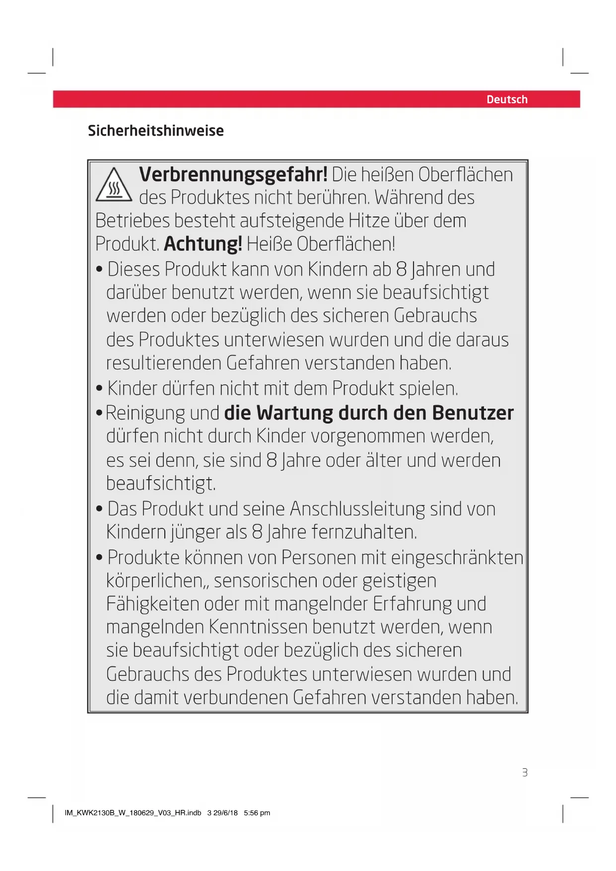- Produkte können von Personen mit eingeschränkten körperlichen,, sensorischen oder geistigen Fähigkeiten oder mit mangelnder Erfahrung und mangelnden Kenntnissen benutzt werden, wenn sie beaufsichtigt oder bezüglich des sicheren Gebrauchs des Produktes unterwiesen wurden und die damit verbundenen Gefahren verstanden haben. IM_KWK2130B_W_180629_V03_HR.indb 3 29/6/18 5:56 pmDeutsch