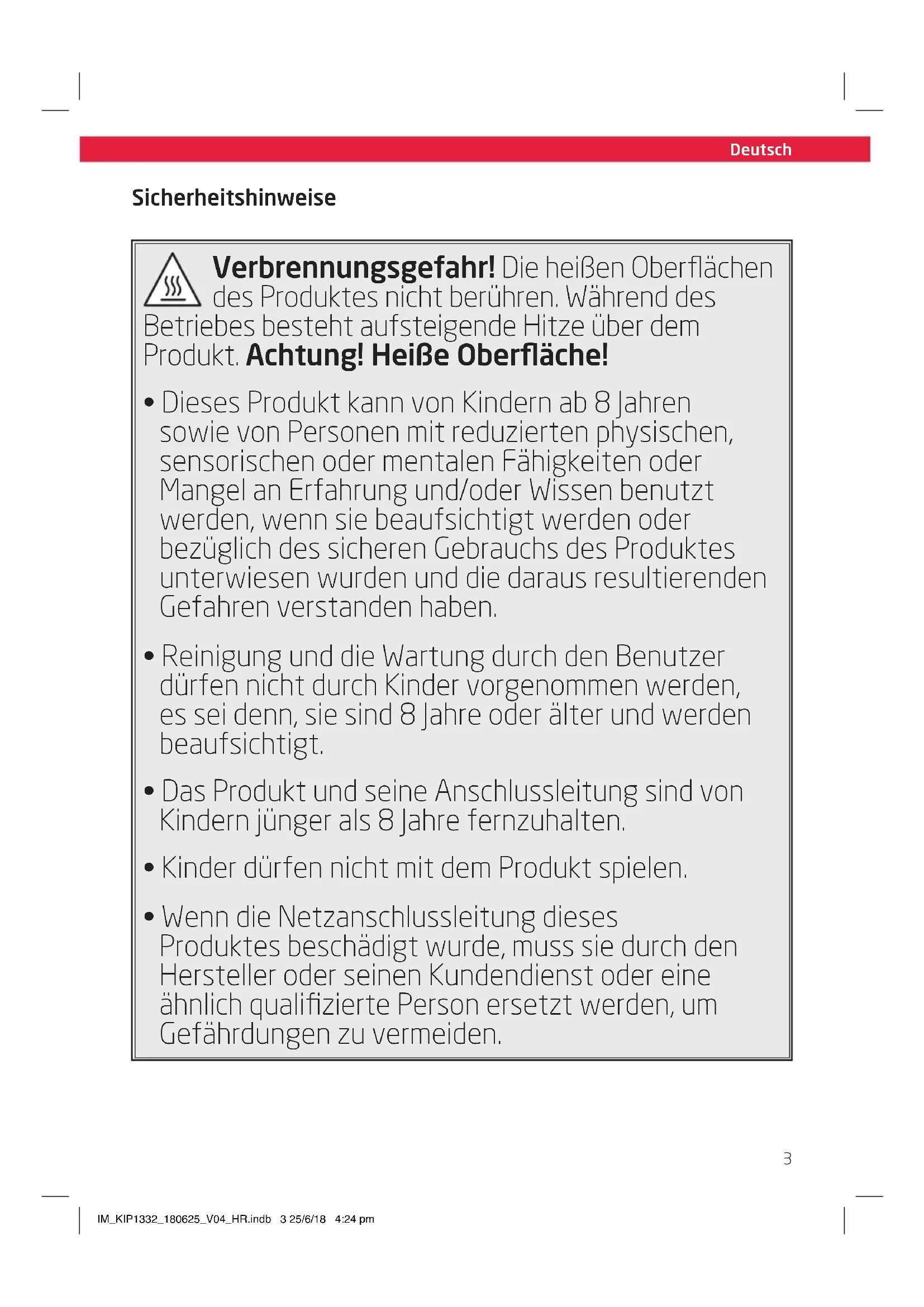 - Wenn die Netzanschlussleitung dieses Produktes beschädigt wurde, muss sie durch den Hersteller oder seinen Kundendienst oder eine ähnlich qualifizierte Person ersetzt werden, um Gefährdungen zu vermeiden. IM_KIP1332_180625_V04_HR.indb 3 25/6/18 4:24 pmDeutsch