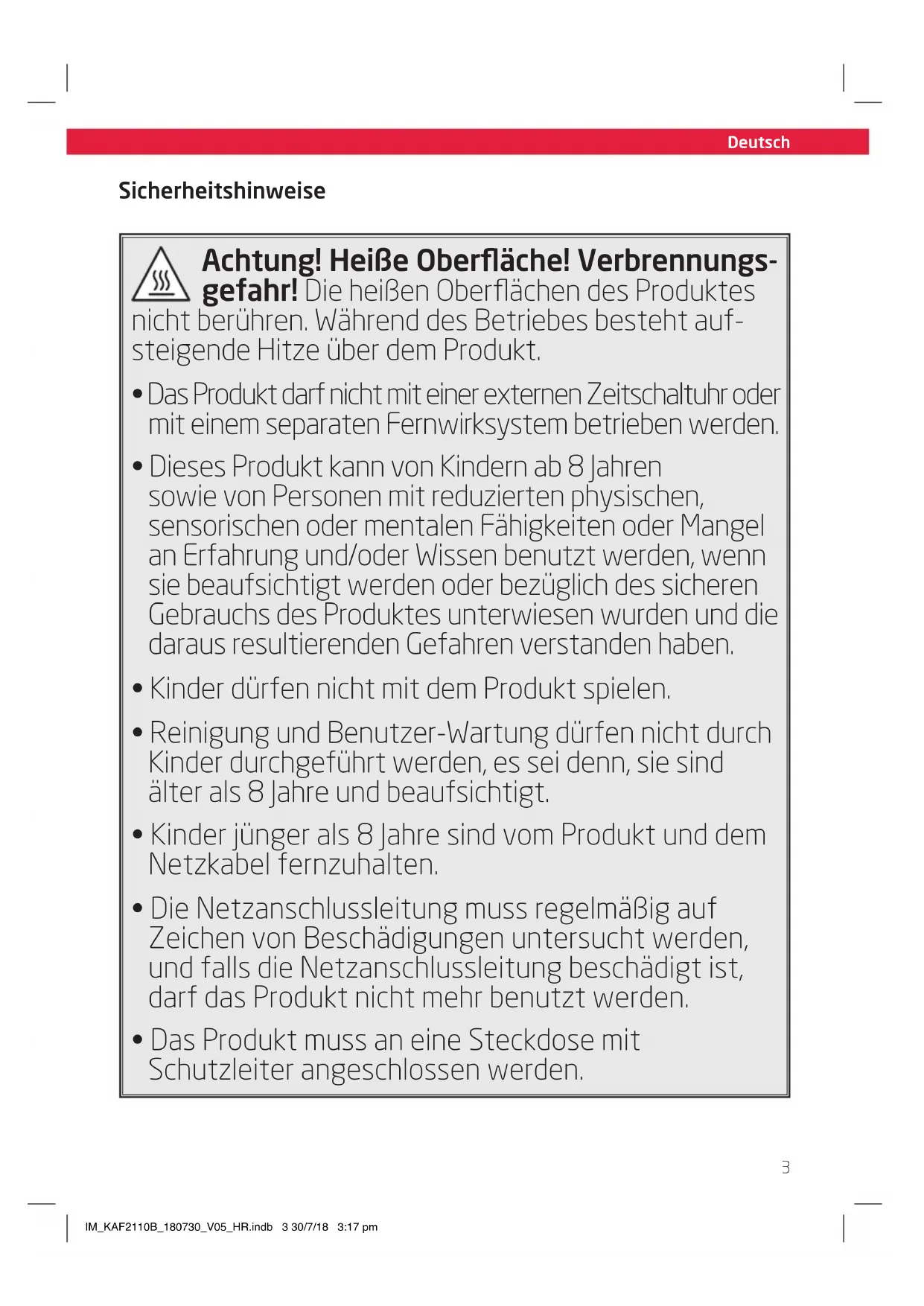 - Das Produkt muss an eine Steckdose mit Schutzleiter angeschlossen werden. IM_KAF2110B_180730_V05_HR.indb 3 30/7/18 3:17 pmDeutsch