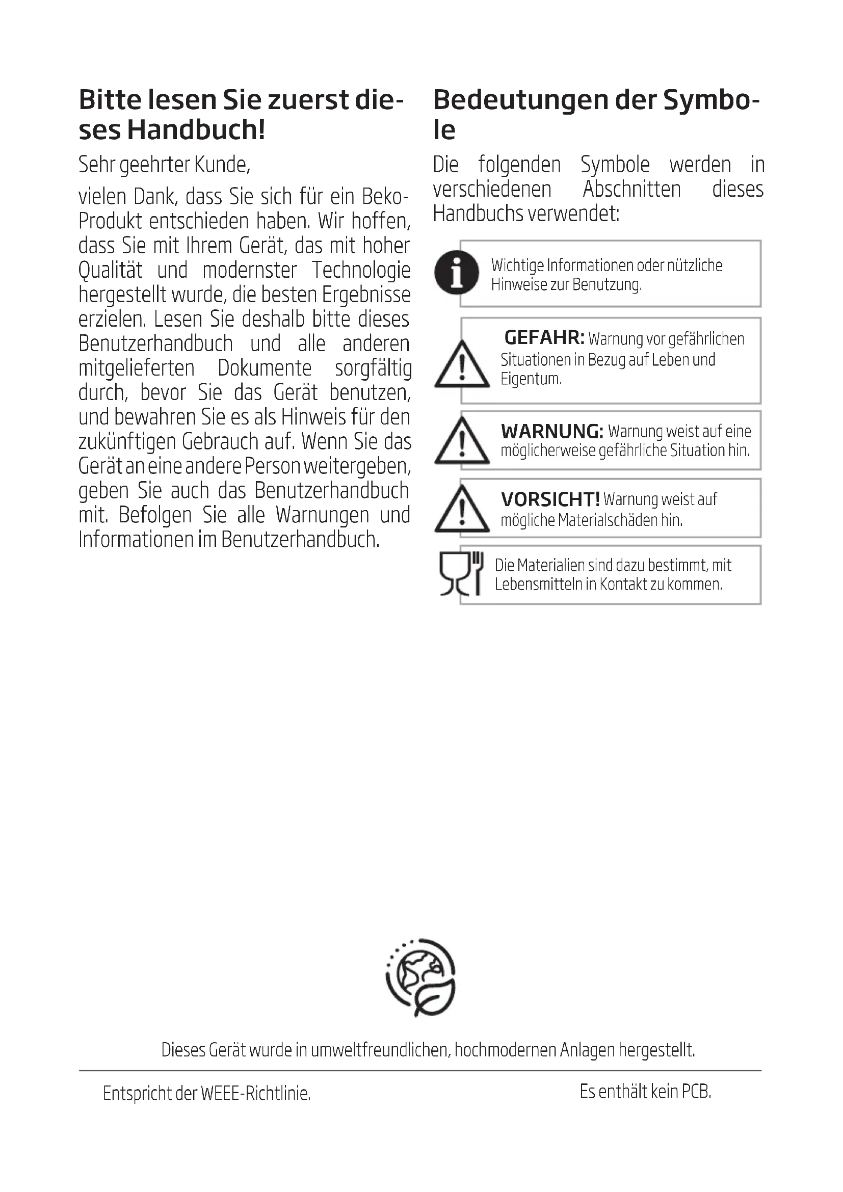 The touch buttons are not sensitive. Not pressing the touch button from the front direction of the appliance. Press the lower bottom part of the icon of the touch button from the front di- rection of the appliance.Bitte lesen Sie zuerst die- ses Handbuch! Sehr geehrter Kunde, vielen Dank, dass Sie sich für ein Beko- Produkt entschieden haben. Wir hoffen, dass Sie mit Ihrem Gerät, das mit hoher Qualität und modernster Technologie hergestellt wurde, die besten Ergebnisse erzielen. Lesen Sie deshalb bitte dieses Benutzerhandbuch und alle anderen mitgelieferten Dokumente sorgfältig durch, bevor Sie das Gerät benutzen, und bewahren Sie es als Hinweis für den zukünftigen Gebrauch auf. Wenn Sie das Gerät an eine andere Person weitergeben, geben Sie auch das Benutzerhandbuch mit. Befolgen Sie alle Warnungen und Informationen im Benutzerhandbuch. Bedeutungen der Symbo-