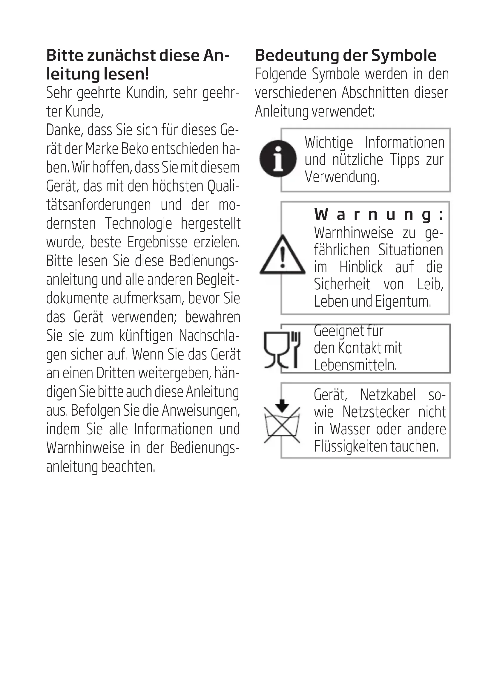 Please call our UK based Customer Service department if you need help or advice from us: United Kingdom and Northern Ireland: 0333 207 9710 Republic of Ireland: 01 862 3411 You can also contact us through our website: www.beko.co.ukBitte zunächst diese An- leitung lesen! Sehr geehrte Kundin, sehr geehr- ter Kunde, Danke, dass Sie sich für dieses Ge- rät der Marke Beko entschieden ha- ben. Wir hoffen, dass Sie mit diesem Gerät, das mit den höchsten Quali- tätsanforderungen und der mo- dernsten Technologie hergestellt wurde, beste Ergebnisse erzielen. Bitte lesen Sie diese Bedienungs- anleitung und alle anderen Begleit- dokumente aufmerksam, bevor Sie das Gerät verwenden; bewahren Sie sie zum künftigen Nachschla- gen sicher auf. Wenn Sie das Gerät an einen Dritten weitergeben, hän- digen Sie bitte auch diese Anleitung aus. Befolgen Sie die Anweisungen, indem Sie alle Informationen und Warnhinweise in der Bedienungs- anleitung beachten. Bedeutung der Symbole Folgende Symbole werden in den verschiedenen Abschnitten dieser Anleitung verwendet: Wichtige Informationen und nützliche Tipps zur Verwendung. Warnung: Warnhinweise zu ge- fährlichen Situationen im Hinblick auf die Sicherheit von Leib, Leben und Eigentum. Geeignet für den Kontakt mit Lebensmitteln. Gerät, Netzkabel so- wie Netzstecker nicht in Wasser oder andere Flüssigkeiten tauchen.Dieses Produkt wurde in umweltfreundlichen, hochmodernen Einrichtungen hergestellt. Dieses Gerät erfüllt die WEEE- Richtlinie.